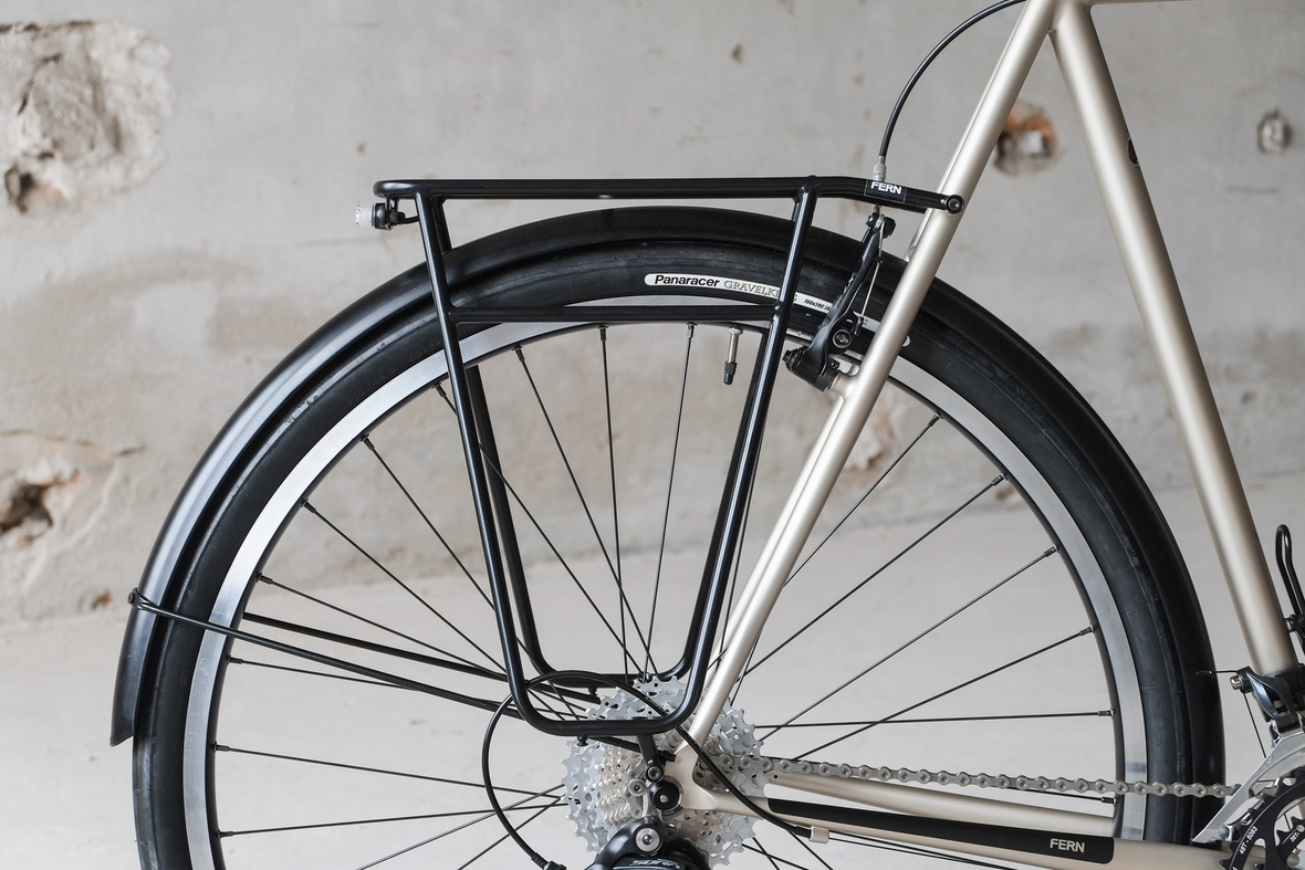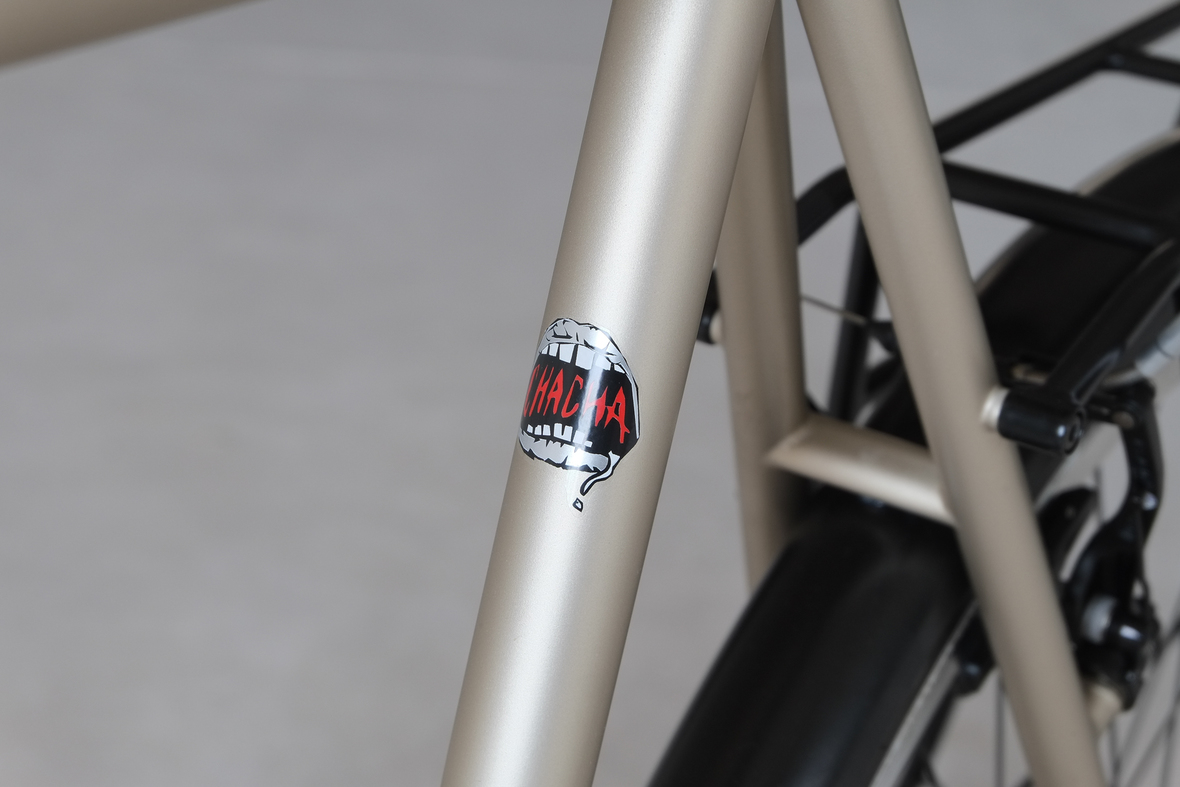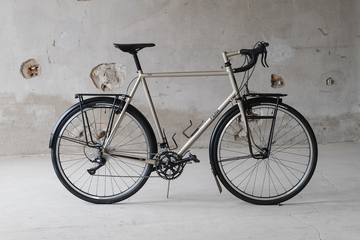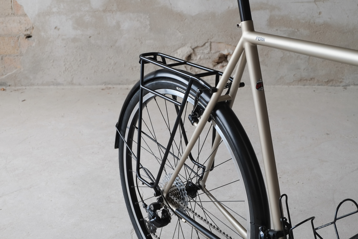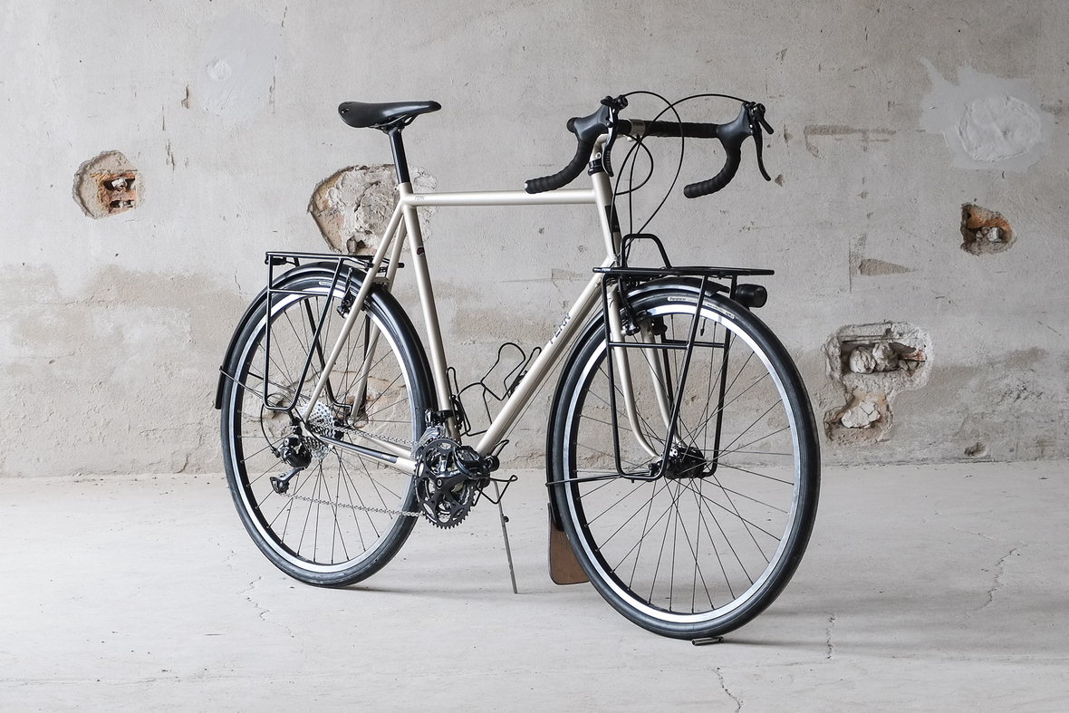 For my man Romain we did this two wheeled champagne coloured dream, a classic Chacha in 28 / 700c wheels size. Featering everything you need for some serious travelling on a bike, like our signature Chacha front- and rear racks. Carefree and simple parts and components which will be fail free and even if they eventually do, will be easy to repair or replace even in the wildest and most lonesome parts of the world.