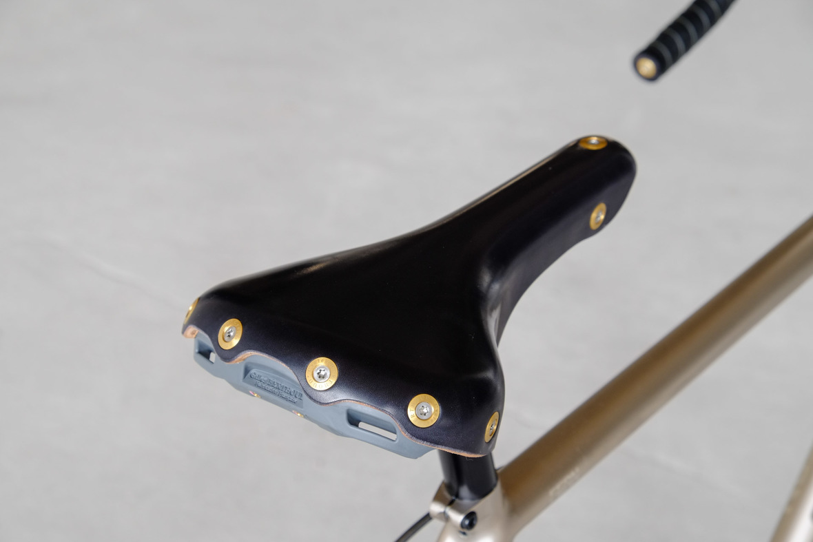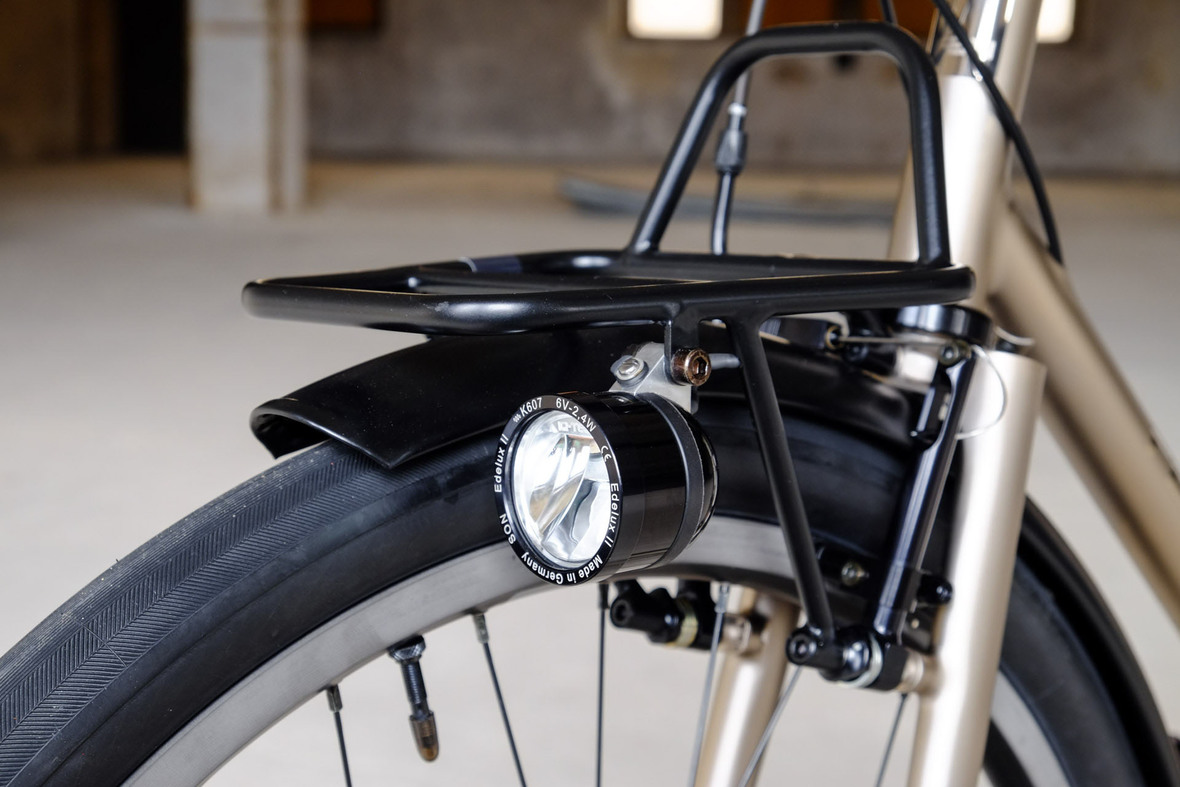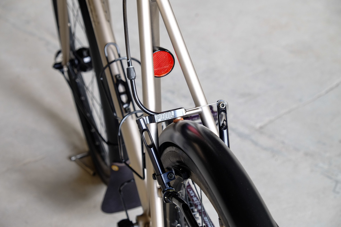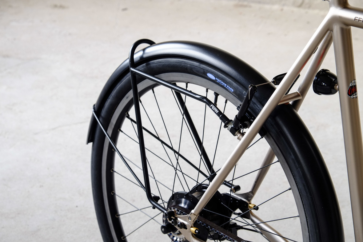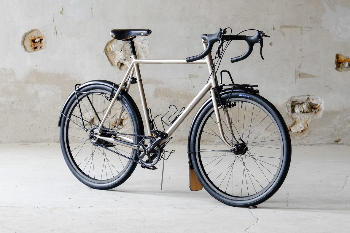 ...rien ne va plus!! This nickel plated dream features only the finest selction of components you can put on a bicycle. Fully internal cable routed custom frame made from finest Columbus life tubing, double plate randonneur fork, deluxe stem, and a set of very special custom made racks. We teamed up some Gevenalle levers, custom ceramic painted Dia-Compe downtube shifters and the ingenious Gebla Rohbox for perfect shifting action with a internally geared Rohloff rear hub. Trouble free belt driven transmisson provided by Gates and smoothest rolling on Rene Herse Naches Pass tires mounted on carbide coated CSS Ryde rims. Front hub dynamo, Headlight and charging all made in Germany by SON and a wonderful custom painted Rene Herse taillight to be switched on and off with a stem mounted switch made by Velolumino. Thanks alot to Paul components, who made a pair of complete black custom anodized Moto Lite brakes for us! The Mighty comp Sugino crankset is spinned by one of the last black pairs of White Industries urban platform pedals we could finally find in Japan. Wonderful details like handlebartape, bar end plugs, mudflap and fenders all made by our friends at Gilles Berthoud!