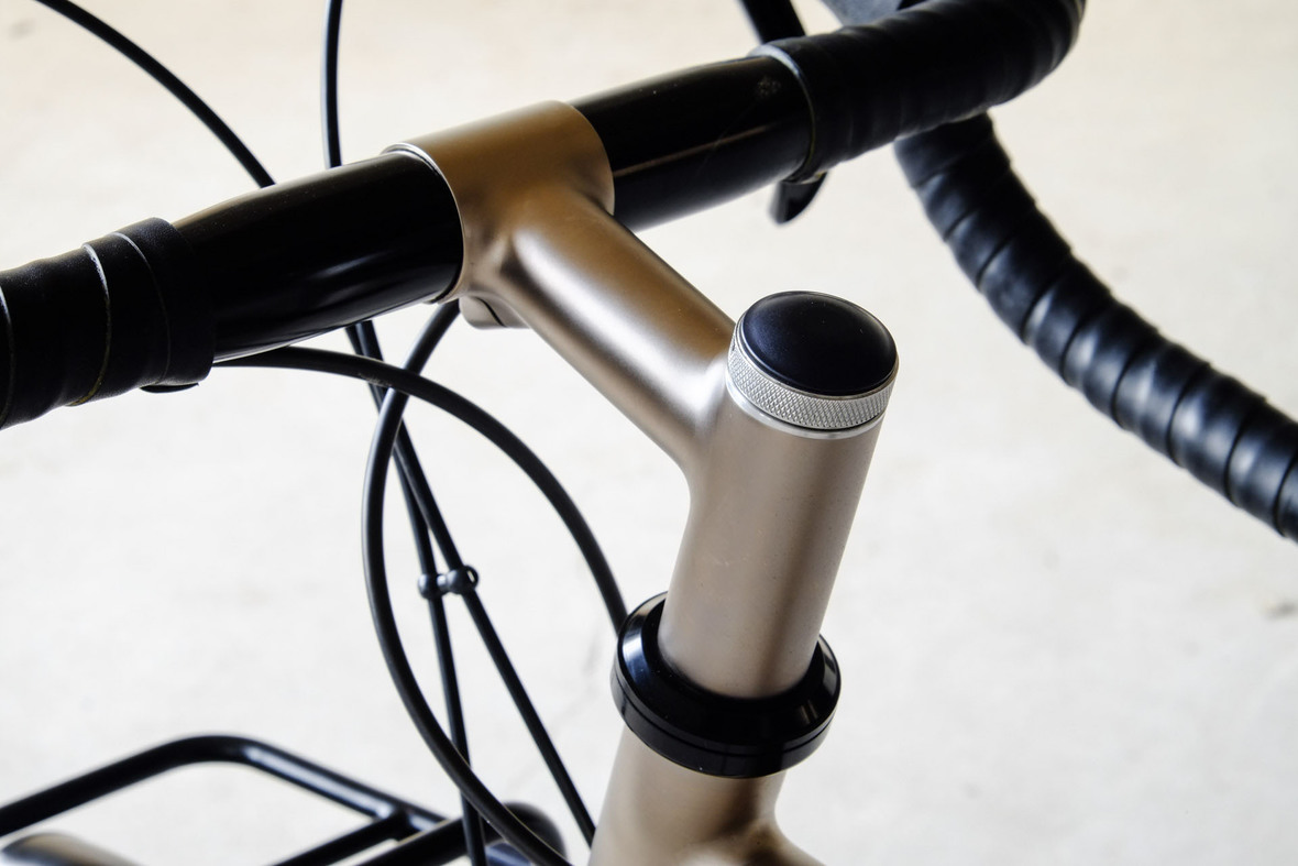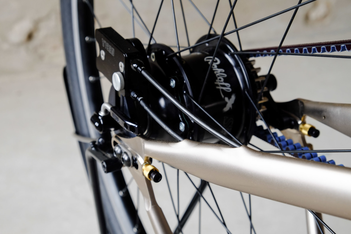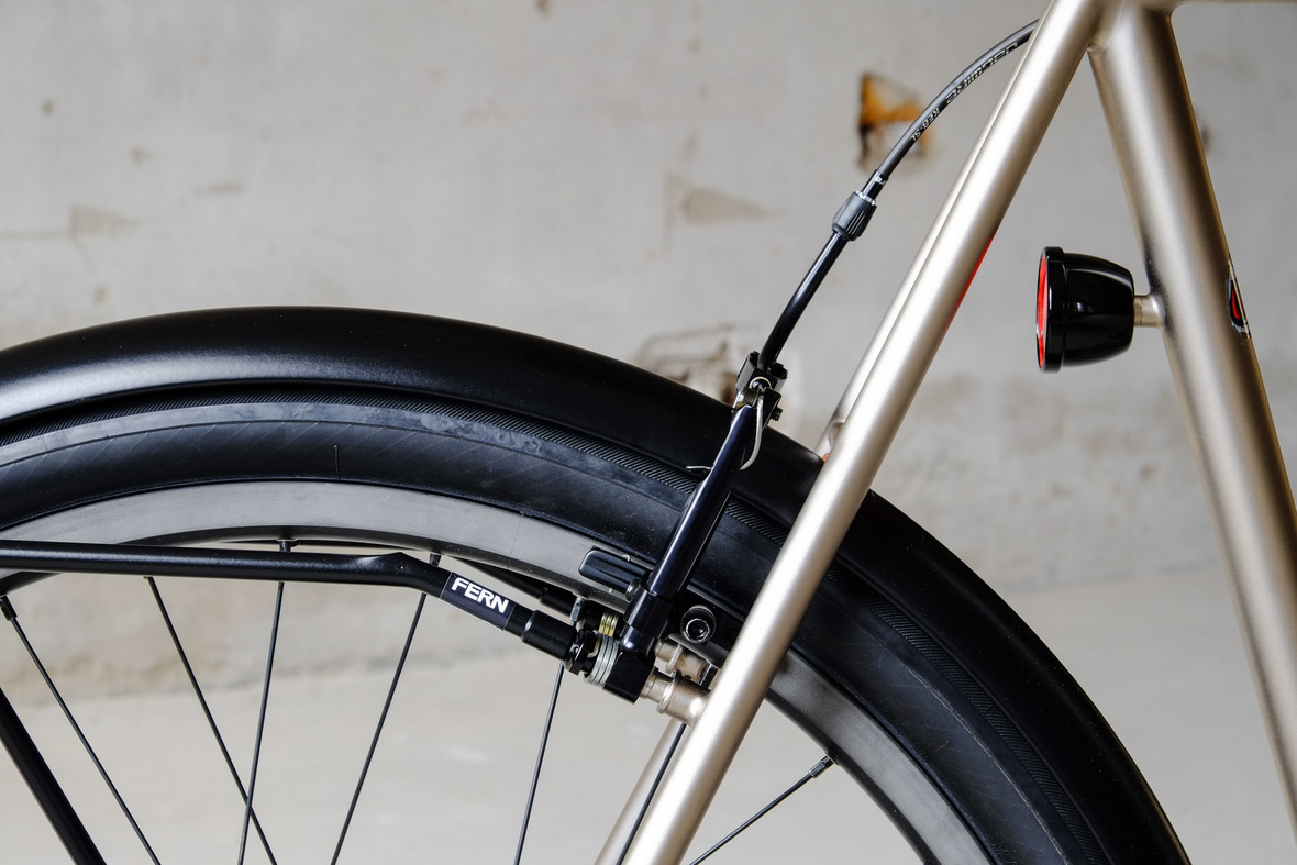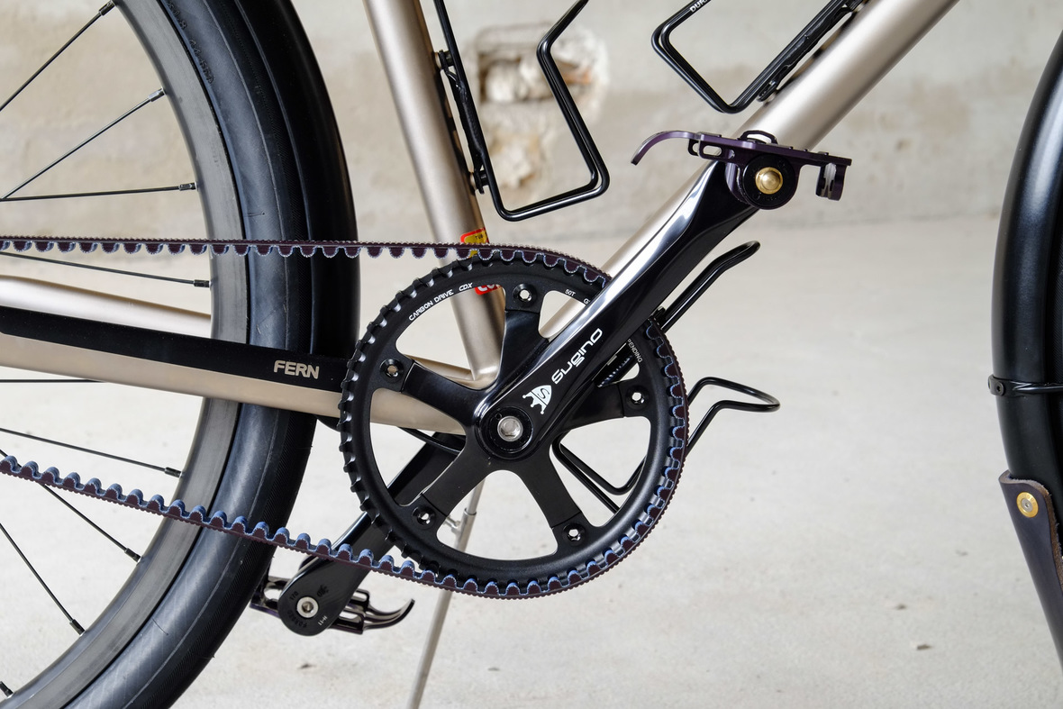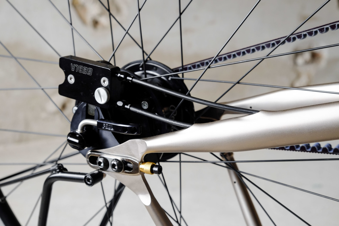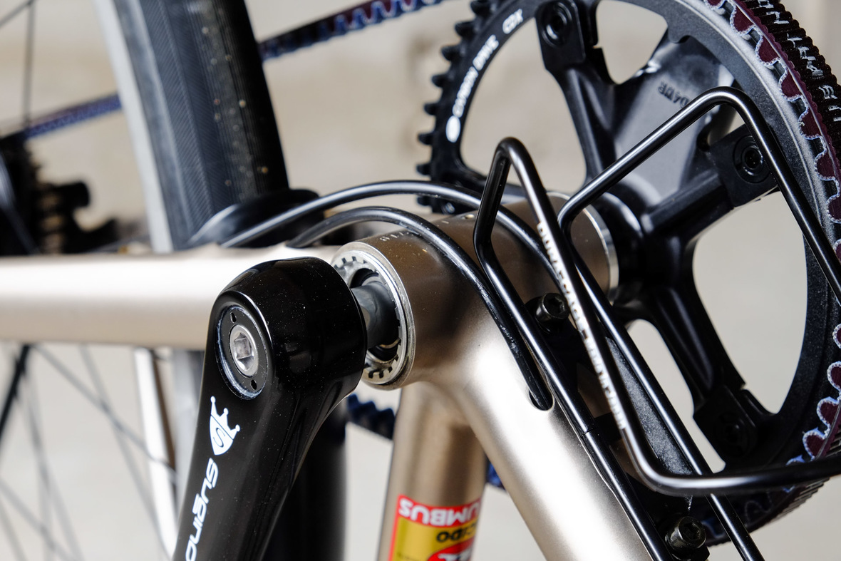 ...rien ne va plus!! This nickel plated dream features only the finest selction of components you can put on a bicycle. Fully internal cable routed custom frame made from finest Columbus life tubing, double plate randonneur fork, deluxe stem, and a set of very special custom made racks. We teamed up some Gevenalle levers, custom ceramic painted Dia-Compe downtube shifters and the ingenious Gebla Rohbox for perfect shifting action with a internally geared Rohloff rear hub. Trouble free belt driven transmisson provided by Gates and smoothest rolling on Rene Herse Naches Pass tires mounted on carbide coated CSS Ryde rims. Front hub dynamo, Headlight and charging all made in Germany by SON and a wonderful custom painted Rene Herse taillight to be switched on and off with a stem mounted switch made by Velolumino. Thanks alot to Paul components, who made a pair of complete black custom anodized Moto Lite brakes for us! The Mighty comp Sugino crankset is spinned by one of the last black pairs of White Industries urban platform pedals we could finally find in Japan. Wonderful details like handlebartape, bar end plugs, mudflap and fenders all made by our friends at Gilles Berthoud!