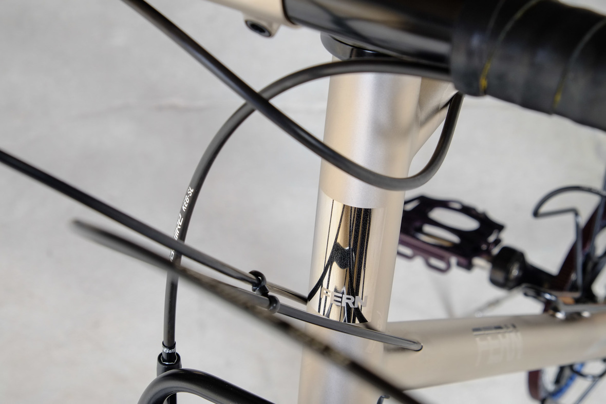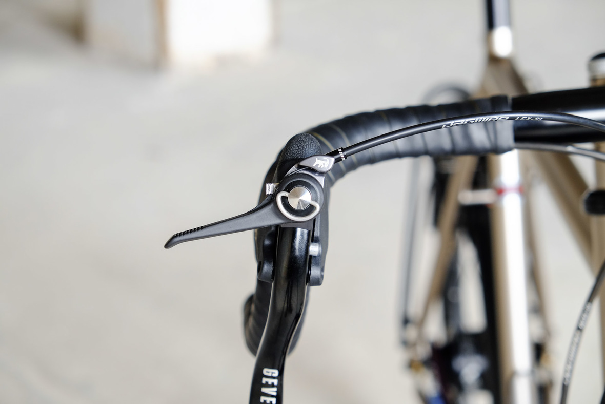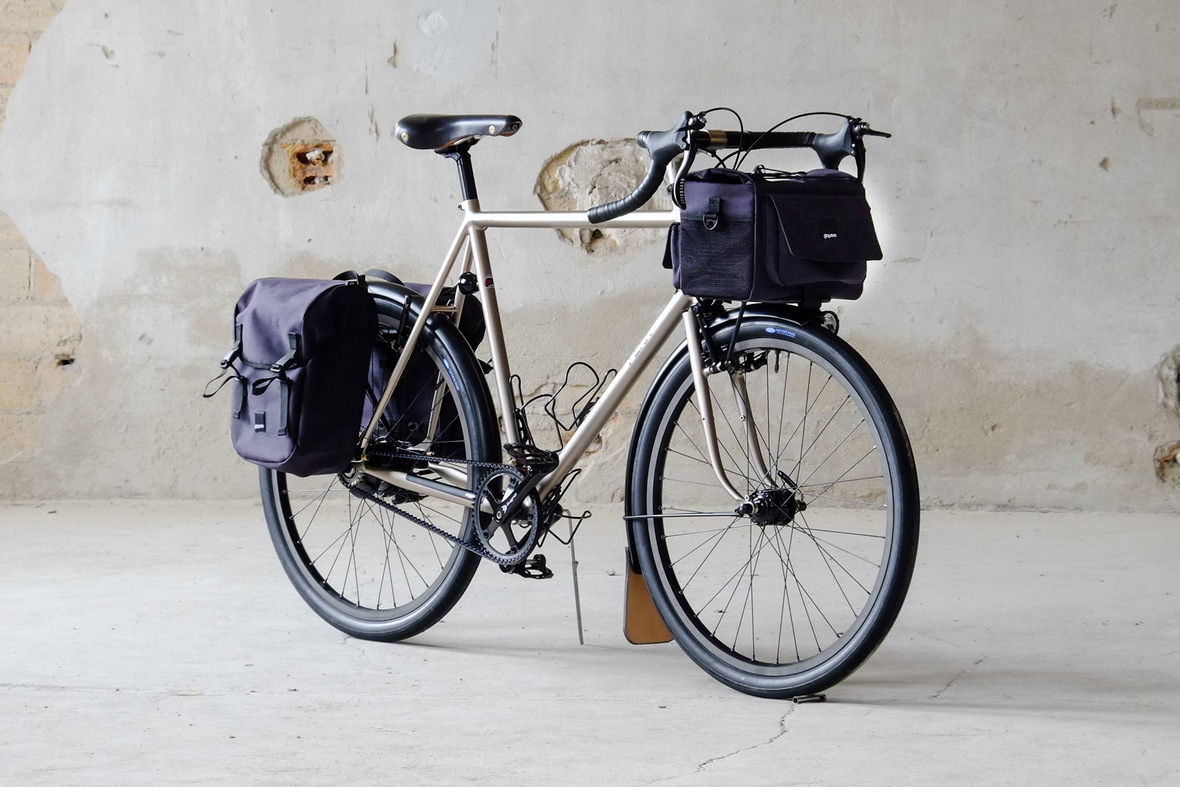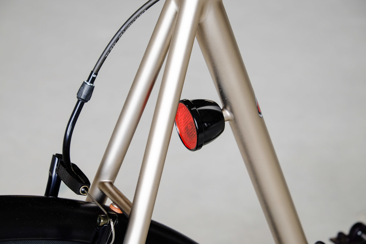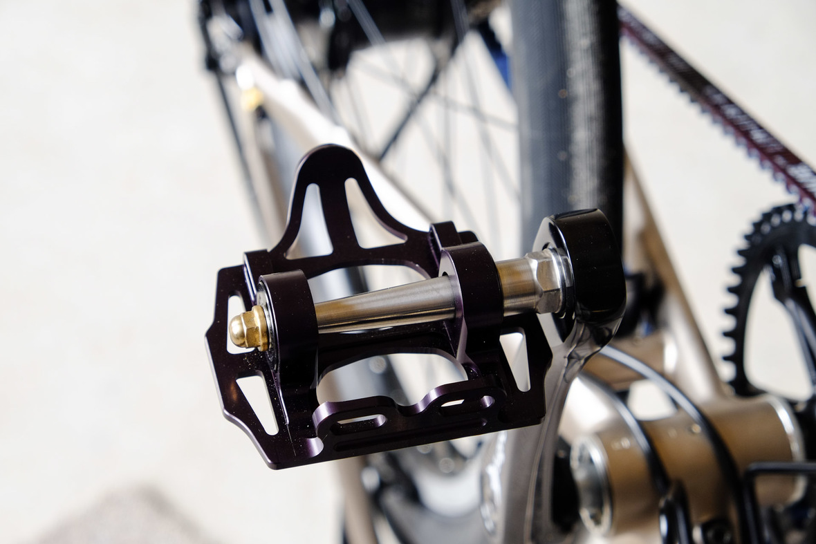 ...rien ne va plus!! This nickel plated dream features only the finest selction of components you can put on a bicycle. Fully internal cable routed custom frame made from finest Columbus life tubing, double plate randonneur fork, deluxe stem, and a set of very special custom made racks. We teamed up some Gevenalle levers, custom ceramic painted Dia-Compe downtube shifters and the ingenious Gebla Rohbox for perfect shifting action with a internally geared Rohloff rear hub. Trouble free belt driven transmisson provided by Gates and smoothest rolling on Rene Herse Naches Pass tires mounted on carbide coated CSS Ryde rims. Front hub dynamo, Headlight and charging all made in Germany by SON and a wonderful custom painted Rene Herse taillight to be switched on and off with a stem mounted switch made by Velolumino. Thanks alot to Paul components, who made a pair of complete black custom anodized Moto Lite brakes for us! The Mighty comp Sugino crankset is spinned by one of the last black pairs of White Industries urban platform pedals we could finally find in Japan. Wonderful details like handlebartape, bar end plugs, mudflap and fenders all made by our friends at Gilles Berthoud!