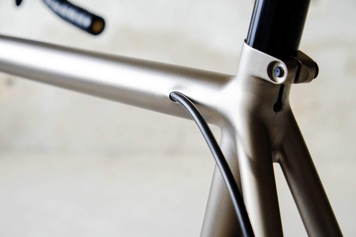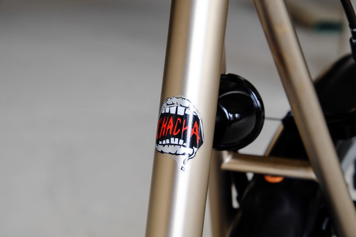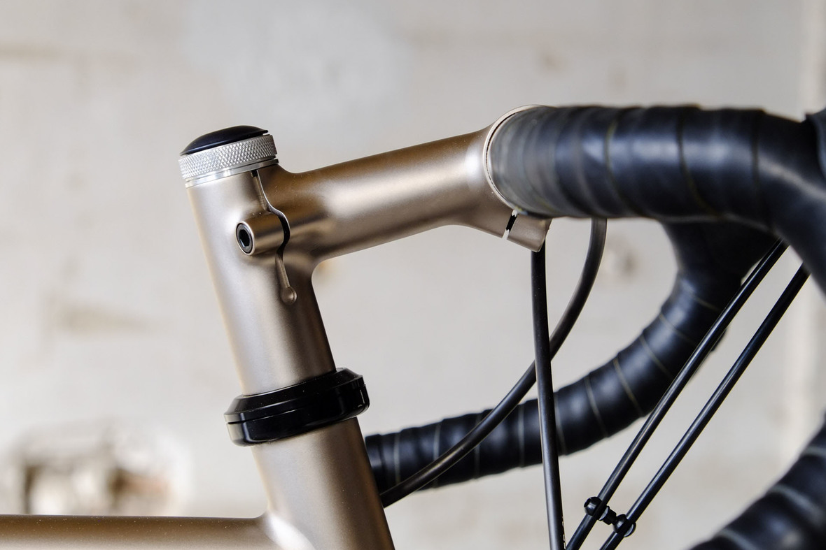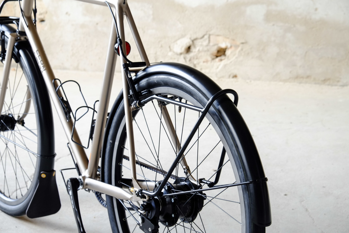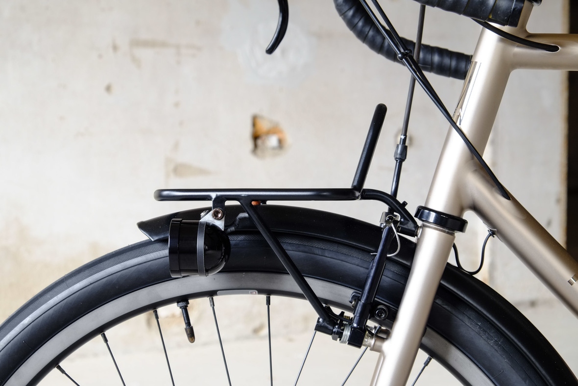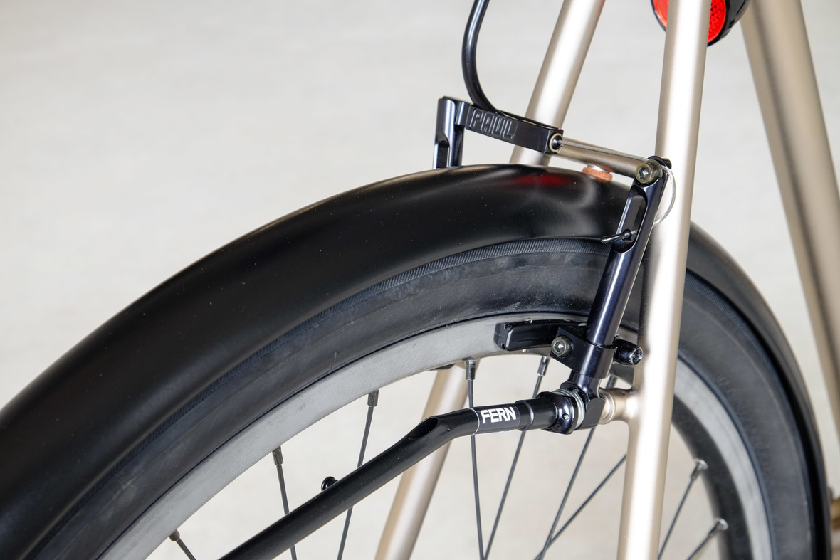 ...rien ne va plus!! This nickel plated dream features only the finest selction of components you can put on a bicycle. Fully internal cable routed custom frame made from finest Columbus life tubing, double plate randonneur fork, deluxe stem, and a set of very special custom made racks. We teamed up some Gevenalle levers, custom ceramic painted Dia-Compe downtube shifters and the ingenious Gebla Rohbox for perfect shifting action with a internally geared Rohloff rear hub. Trouble free belt driven transmisson provided by Gates and smoothest rolling on Rene Herse Naches Pass tires mounted on carbide coated CSS Ryde rims. Front hub dynamo, Headlight and charging all made in Germany by SON and a wonderful custom painted Rene Herse taillight to be switched on and off with a stem mounted switch made by Velolumino. Thanks alot to Paul components, who made a pair of complete black custom anodized Moto Lite brakes for us! The Mighty comp Sugino crankset is spinned by one of the last black pairs of White Industries urban platform pedals we could finally find in Japan. Wonderful details like handlebartape, bar end plugs, mudflap and fenders all made by our friends at Gilles Berthoud!