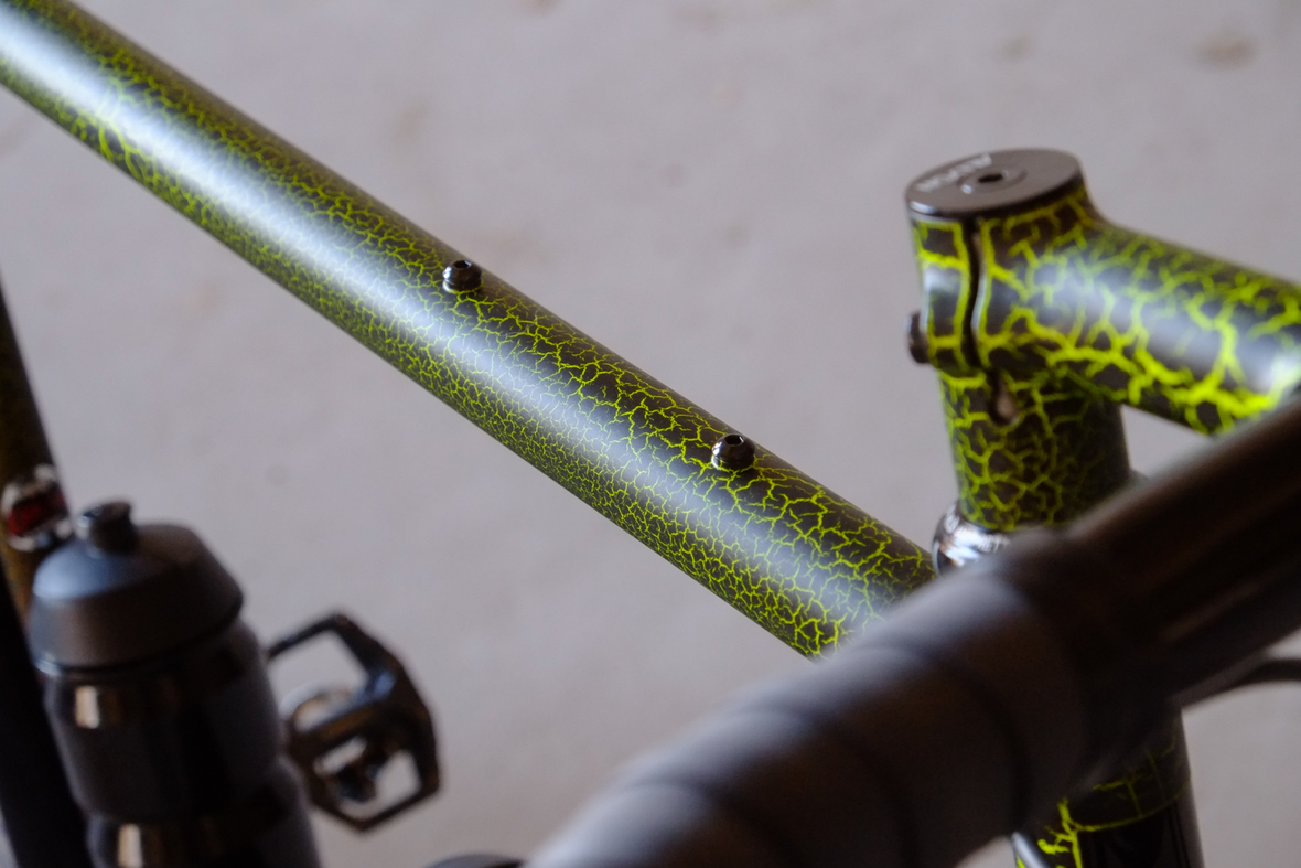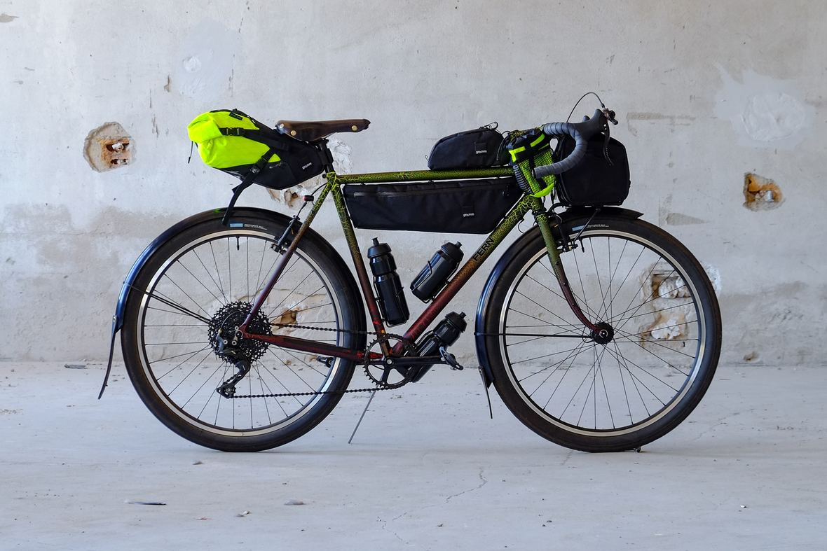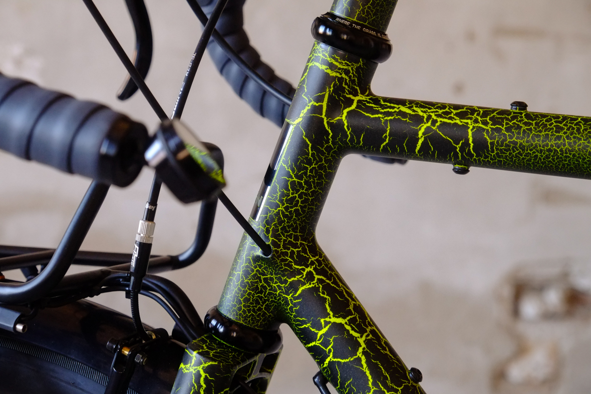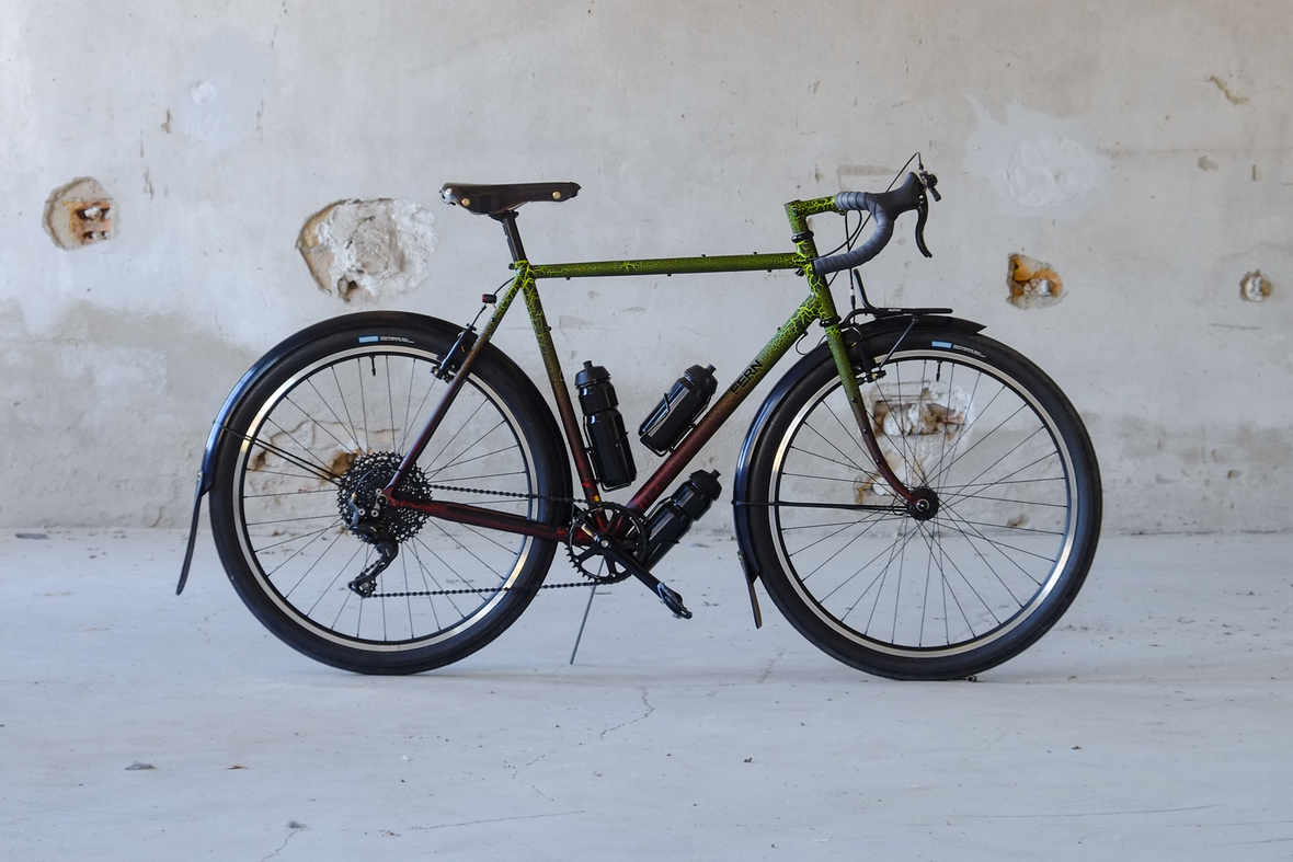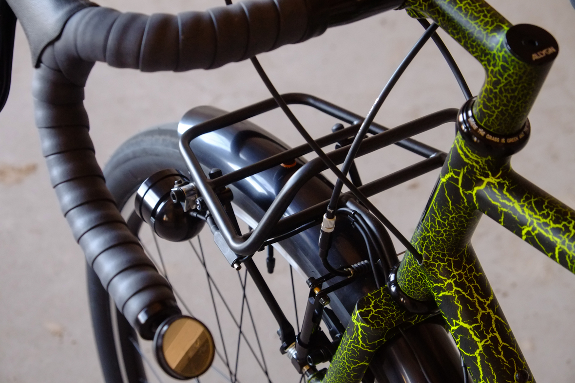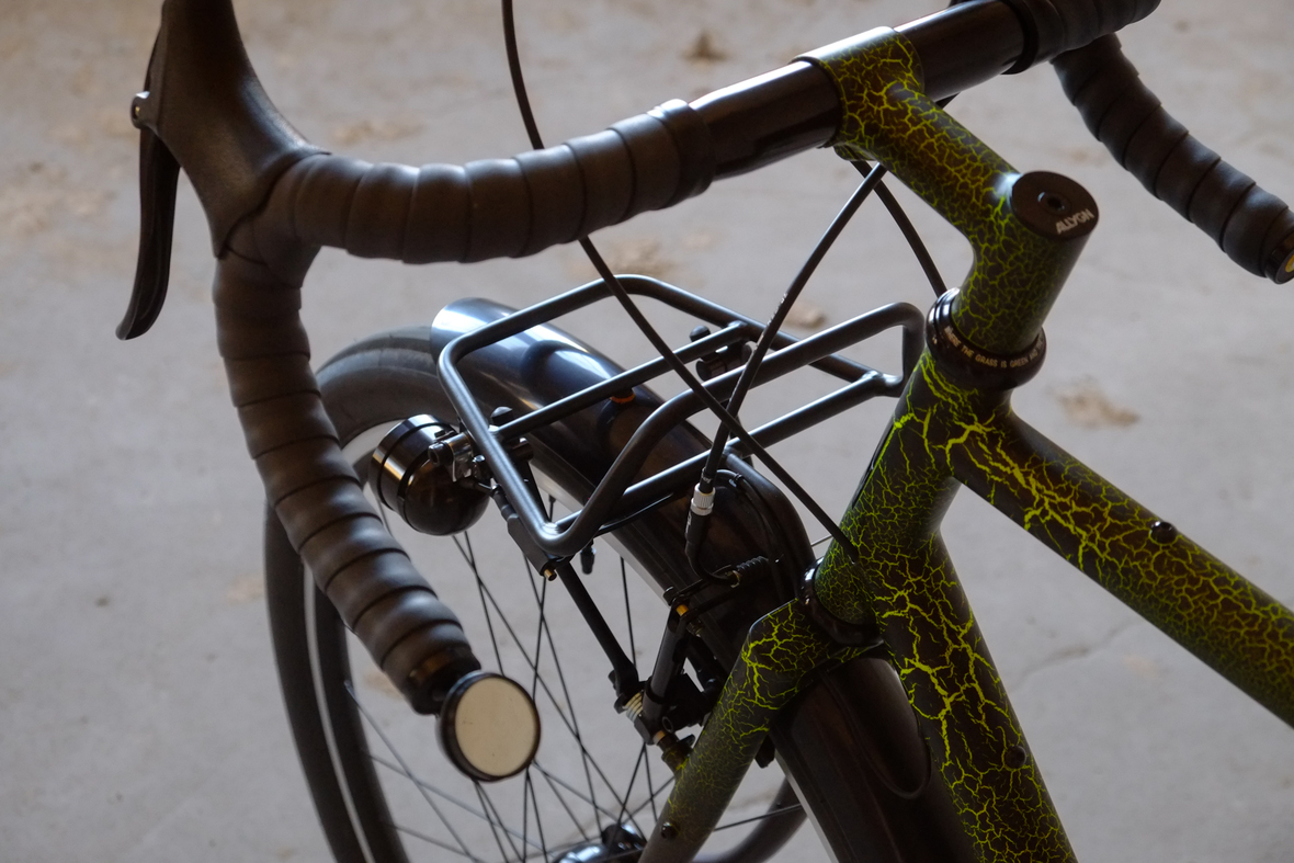 I know Andreas, who is a regular guest at our favourite Berlin Feierabend Bierchen Bicycle Hang Out Shops, for a long time now and I always knew one day I will make a bike for him. Finally his long time dream became reality and we made this super nice classic randonneur bicyle for him, with this fantastic and absolutely not so classic at all punk rock crackle paintsheme created by Velociao and a full set of matching bags made by my love Kristin @gramm-tourpacking .