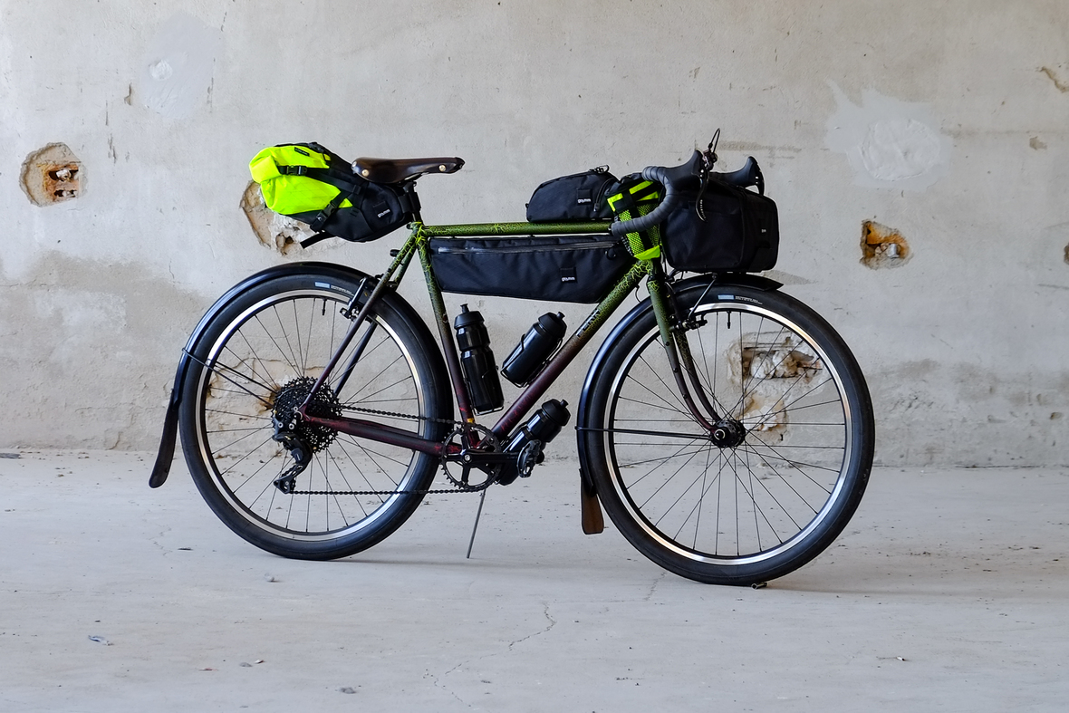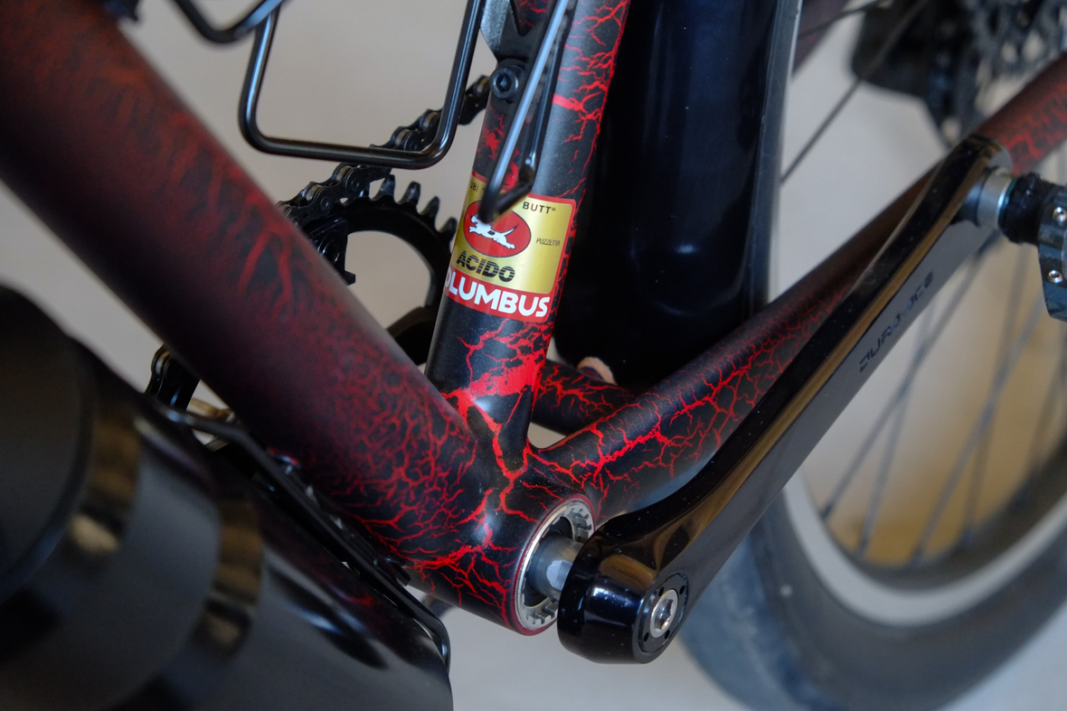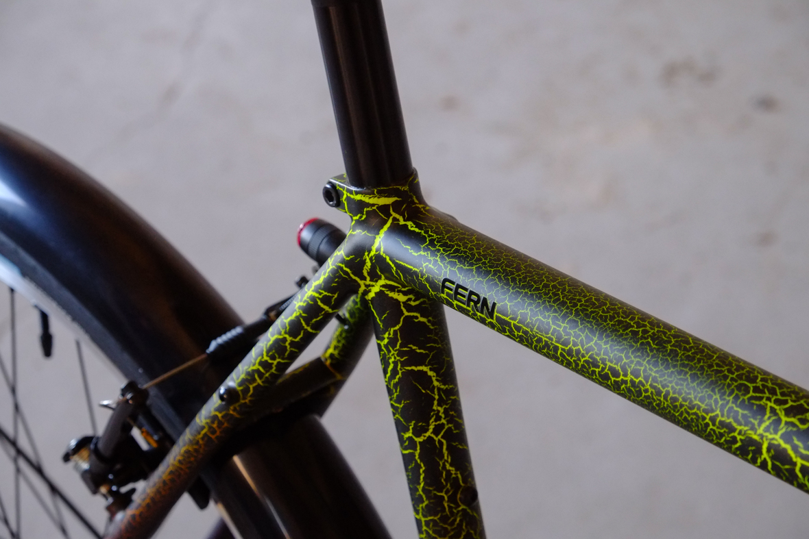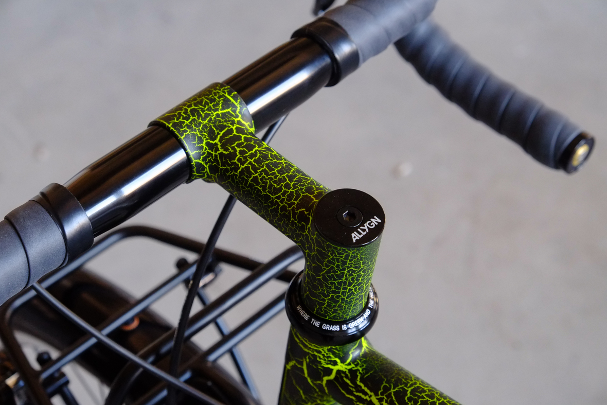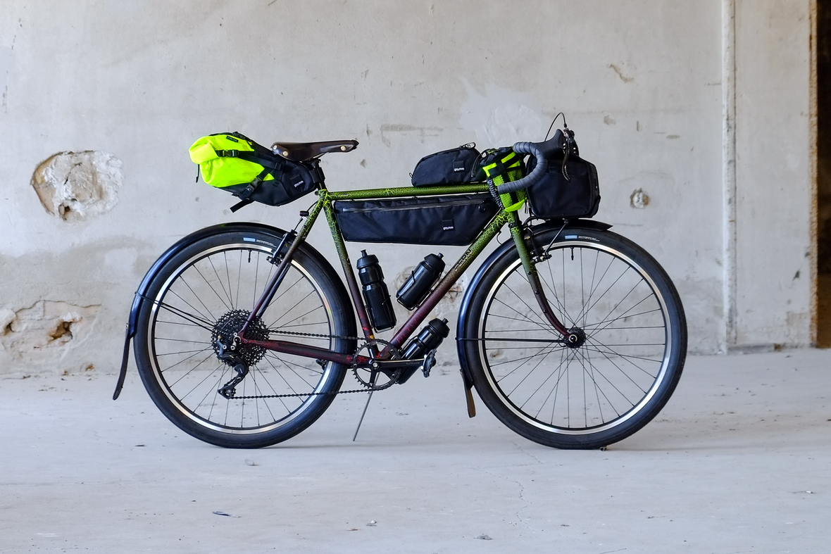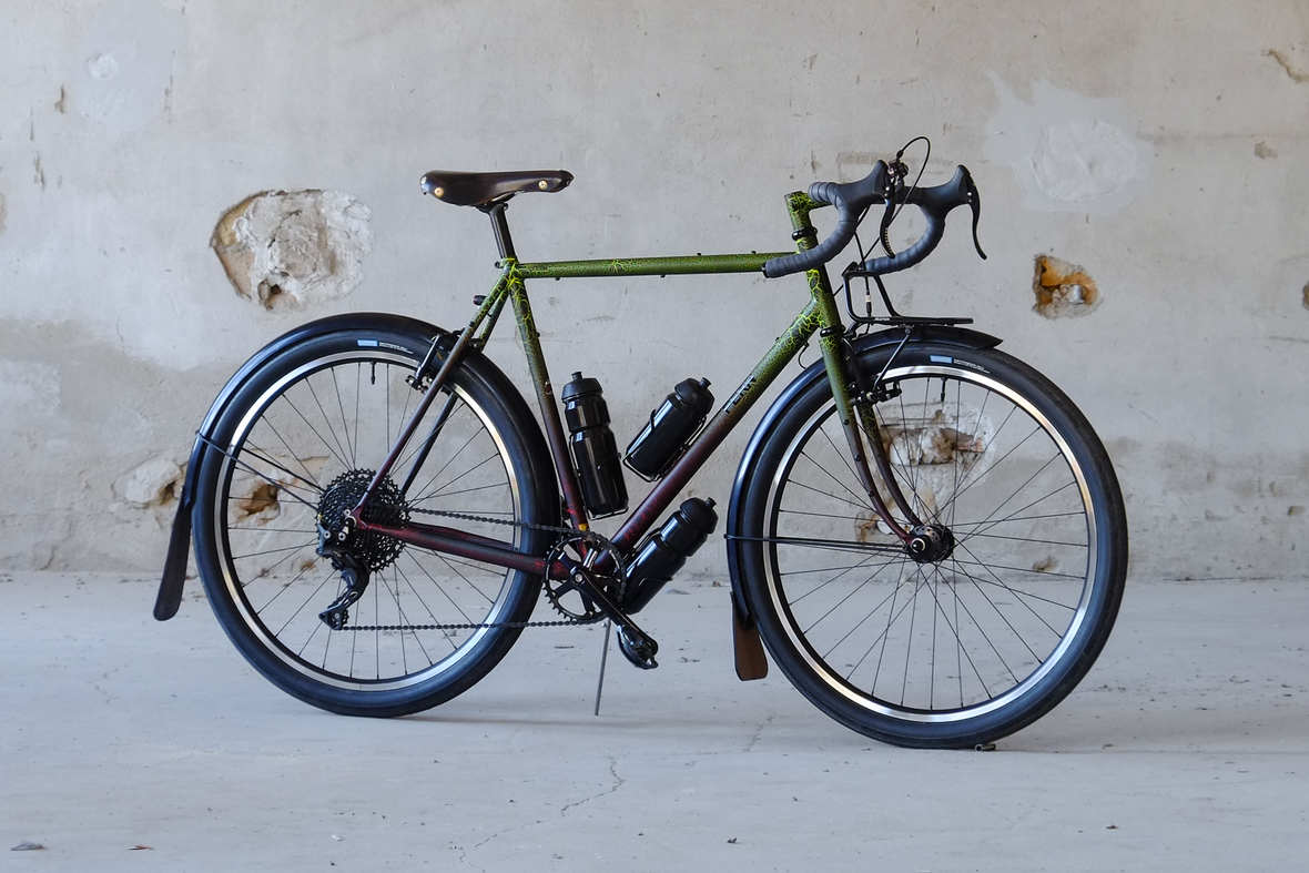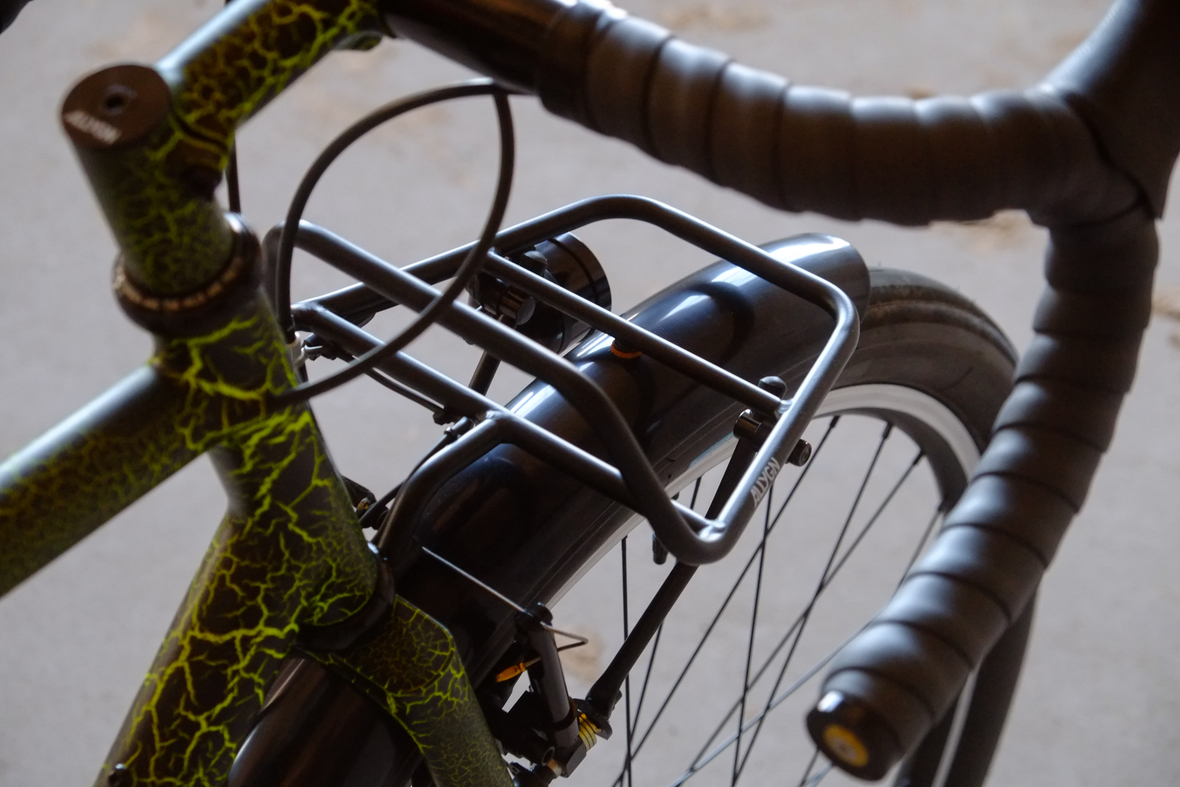 I know Andreas, who is a regular guest at our favourite Berlin Feierabend Bierchen Bicycle Hang Out Shops, for a long time now and I always knew one day I will make a bike for him. Finally his long time dream became reality and we made this super nice classic randonneur bicyle for him, with this fantastic and absolutely not so classic at all punk rock crackle paintsheme created by Velociao and a full set of matching bags made by my love Kristin @gramm-tourpacking .