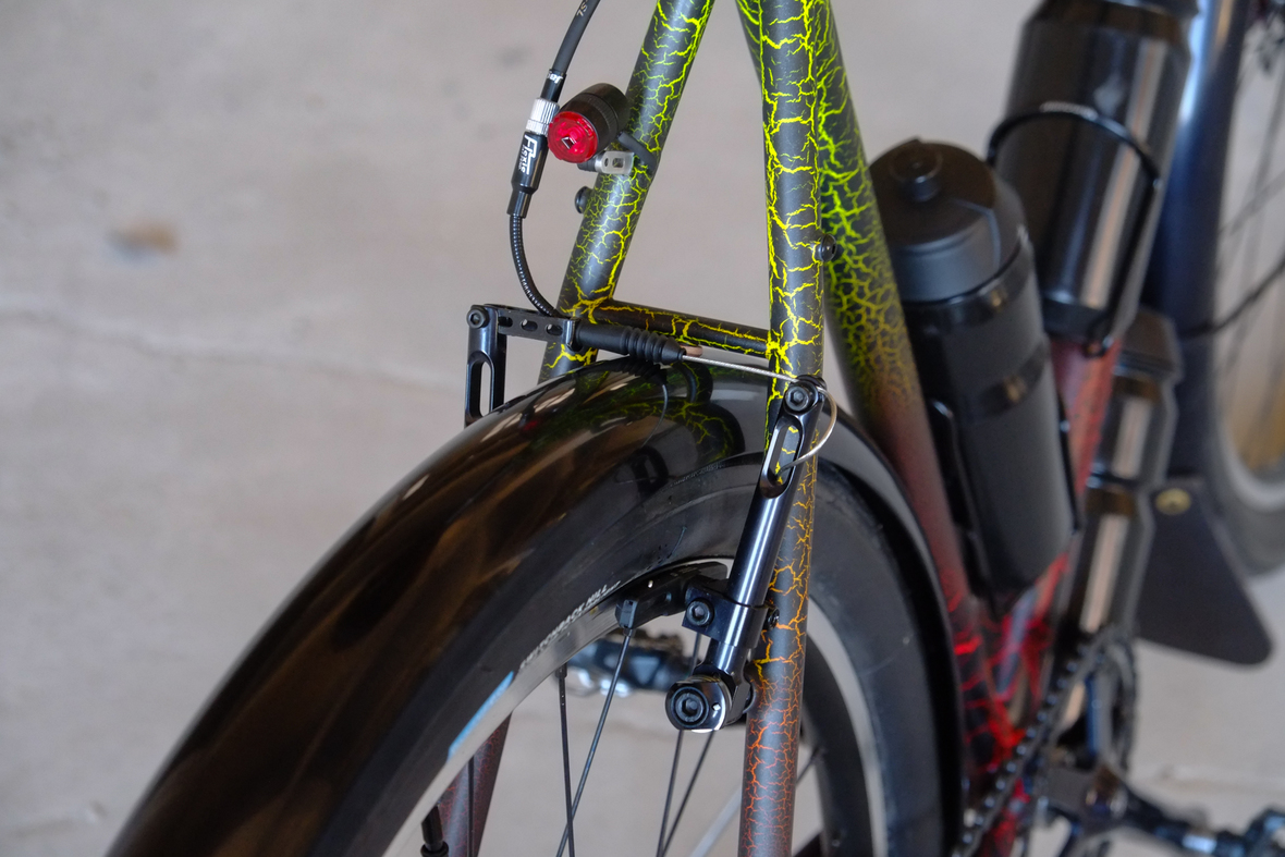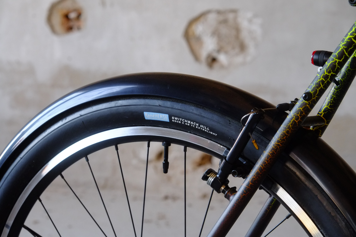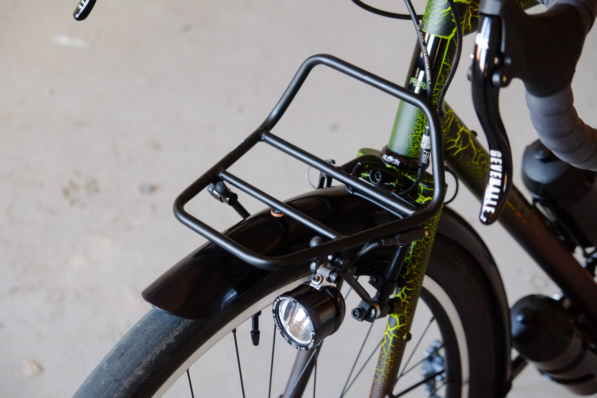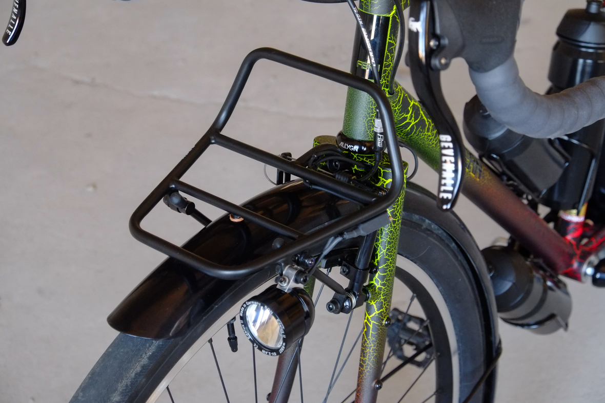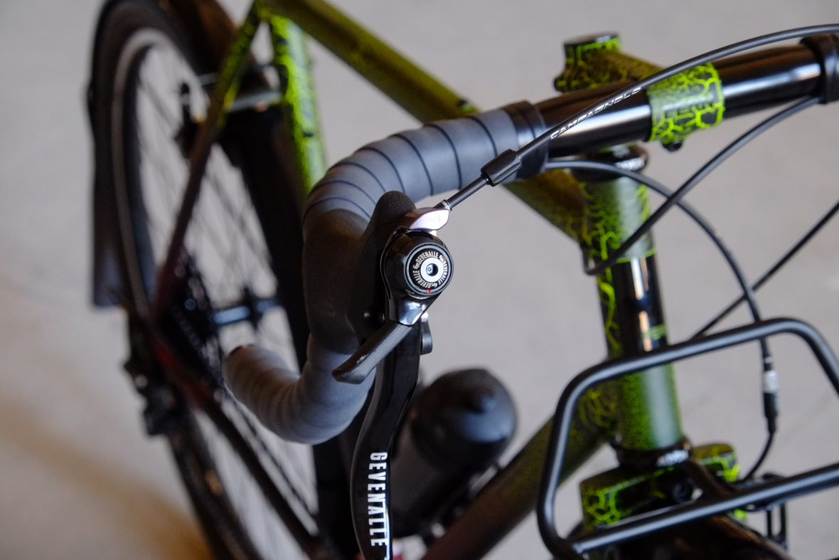 What an amazing bike, featuring all you need for long rides off and on the road, perfect for gravel roads as well as for long distance brevet rides. English style reverse braking sheme with custom flip flopped Paul Component V-brakes. Super nice parts made by our friends @Gilles Berthoud, Rene Herse 650B x 48mm tires, Shifting by Gevenalle, energy and lights as usual by SON.