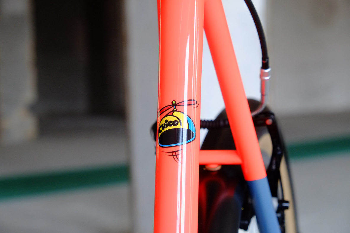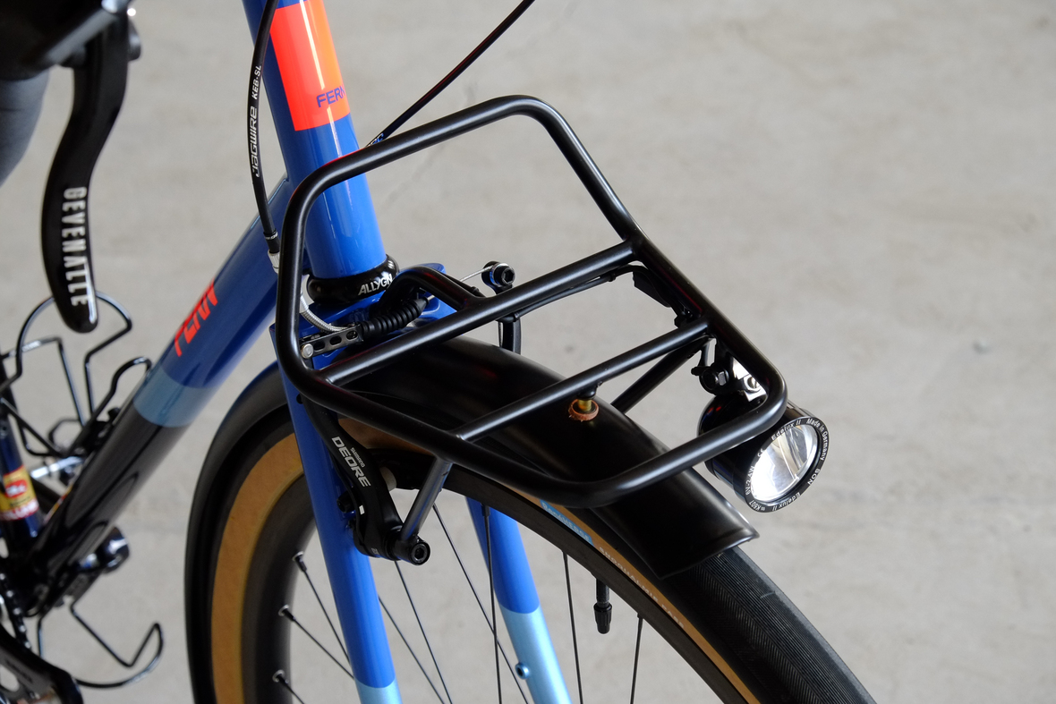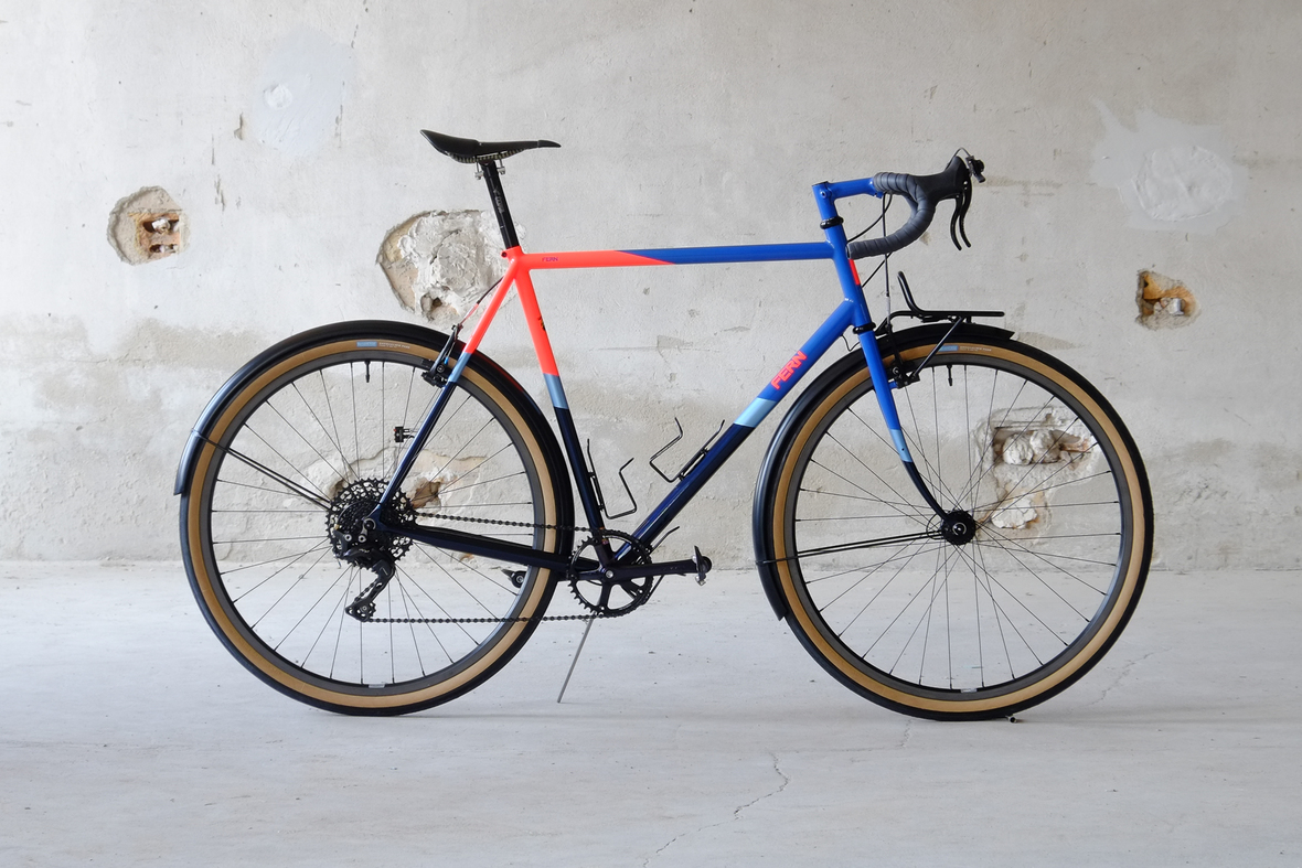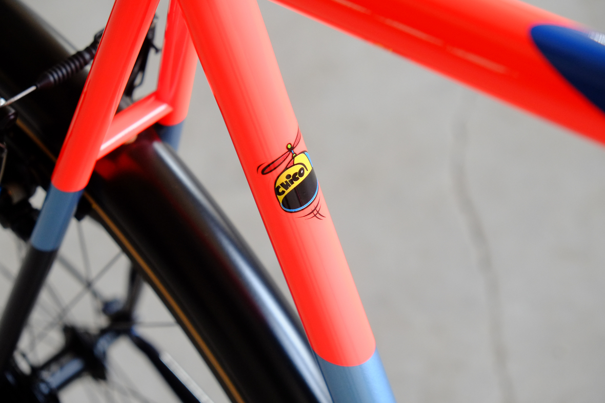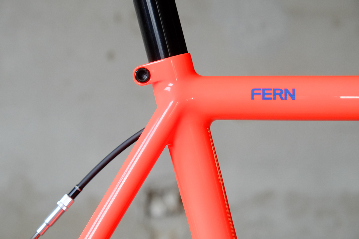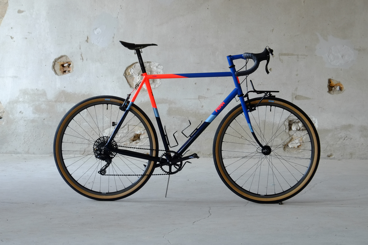 This wonderful Chico 28 finally goes out to my man Mr. Q! Thanks so much for being the most patient and nicest customers we 've had here at Fern, I hope the long time waiting was worth it ;) This bike is featuring a true racing bike geometry, but rolling super smooth on supple Rene Herse 44mm Snoqualmie Pass tires. Maximum speed and absolutely superior comfort on any kind of terrain, no matter if you go for racing on asphalt or for fun gravelriding off the road, the Chico 28 can do it all. The bike is equipped with a Gevenalle powered 1x11 Shimano drivetrain turned by a Wolftooth Drop Stop chainring mounted to a vintage custom anodized Dura Ace 7400 crankset. Fenders made by our friends at Berthoud Cycles, comfy contact points by Tune ,Whiskyparts and ESI grips. Lights and power supply by SON, "Schmidt's Original Nabendynamo". Stem and rack are all handmade by Fern. Awesome stripy paint sheme by our man Robert from Velociao . Have good time rolling on your new steed!