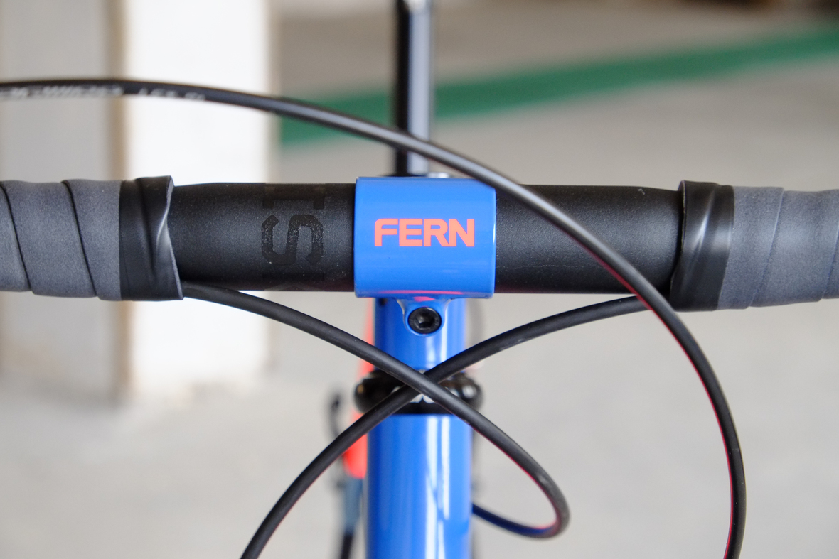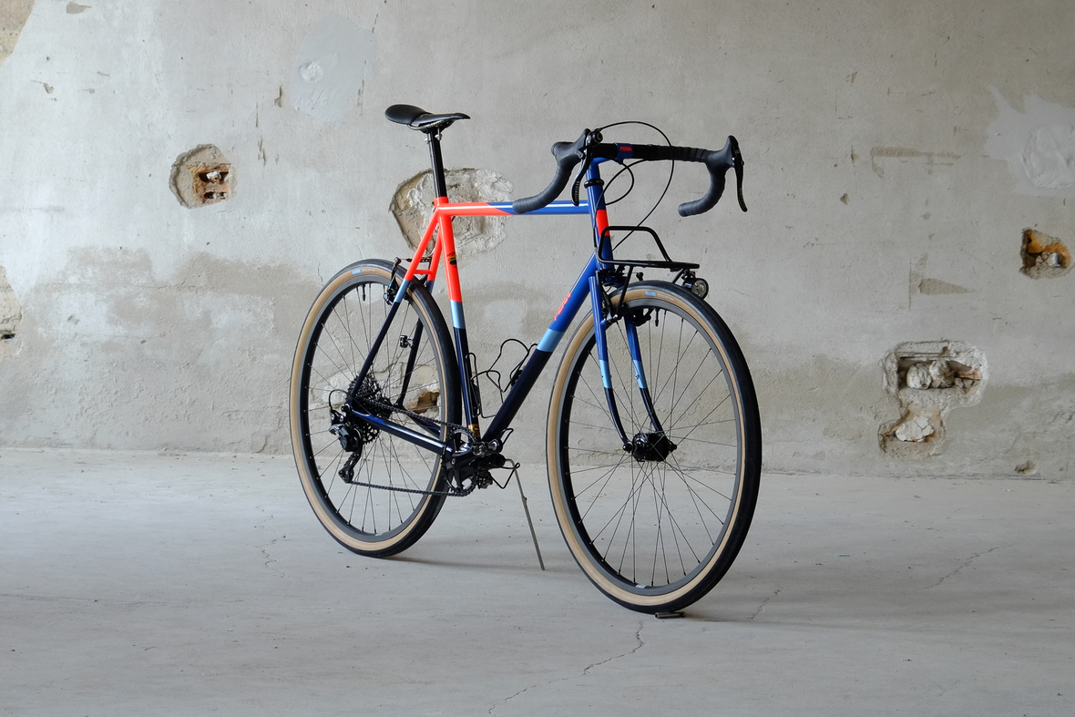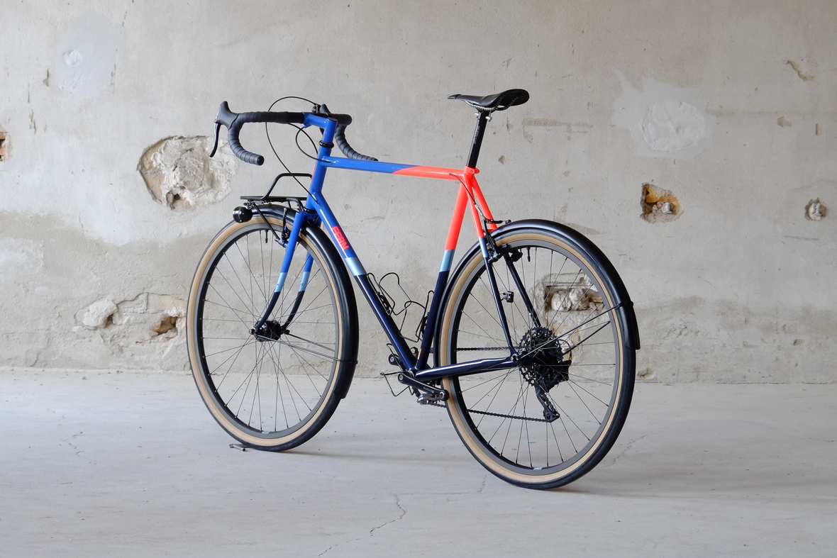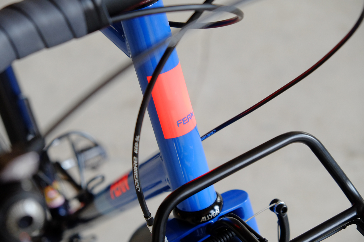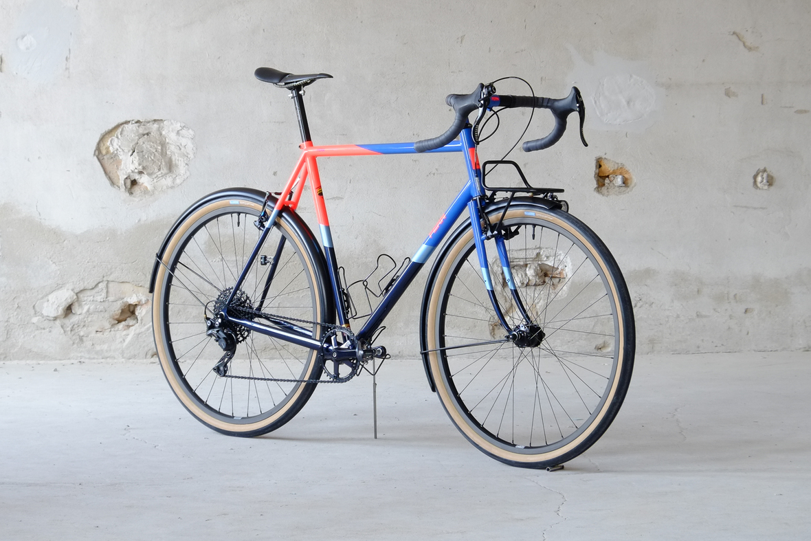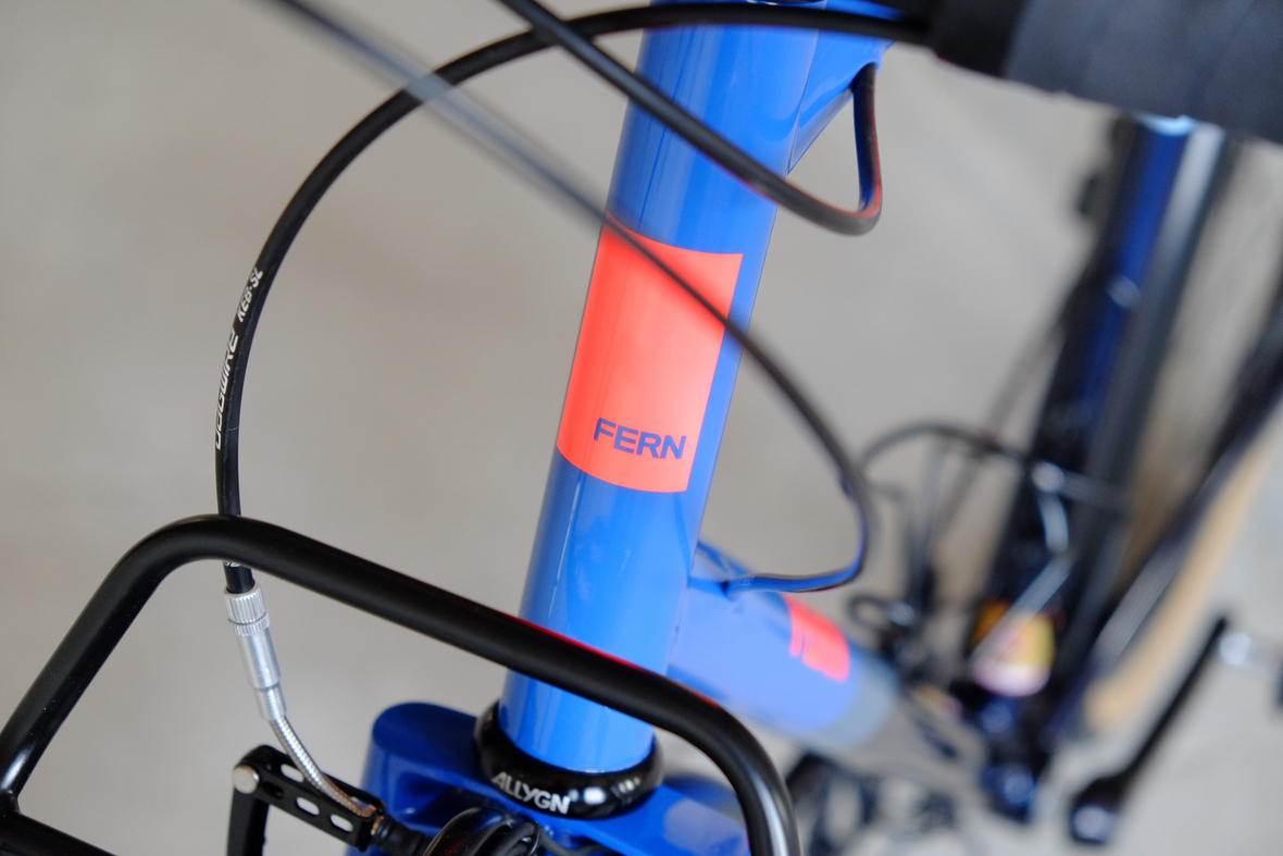 This wonderful Chico 28 finally goes out to my man Mr. Q! Thanks so much for being the most patient and nicest customers we 've had here at Fern, I hope the long time waiting was worth it ;) This bike is featuring a true racing bike geometry, but rolling super smooth on supple Rene Herse 44mm Snoqualmie Pass tires. Maximum speed and absolutely superior comfort on any kind of terrain, no matter if you go for racing on asphalt or for fun gravelriding off the road, the Chico 28 can do it all. The bike is equipped with a Gevenalle powered 1x11 Shimano drivetrain turned by a Wolftooth Drop Stop chainring mounted to a vintage custom anodized Dura Ace 7400 crankset. Fenders made by our friends at Berthoud Cycles, comfy contact points by Tune ,Whiskyparts and ESI grips. Lights and power supply by SON, "Schmidt's Original Nabendynamo". Stem and rack are all handmade by Fern. Awesome stripy paint sheme by our man Robert from Velociao . Have good time rolling on your new steed!