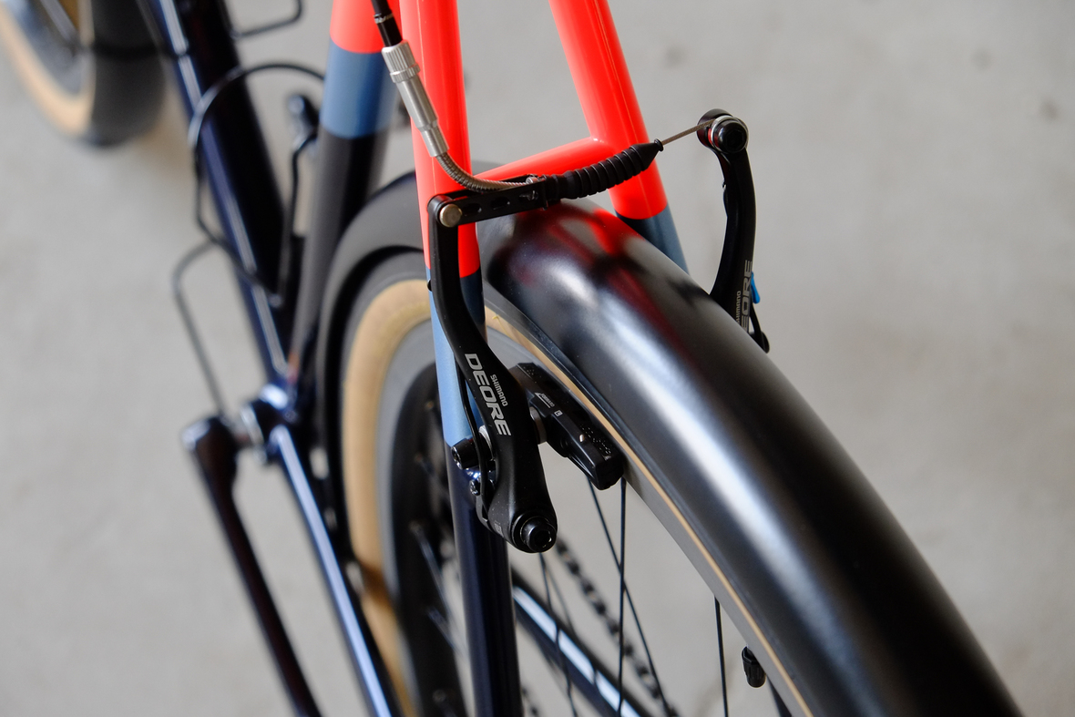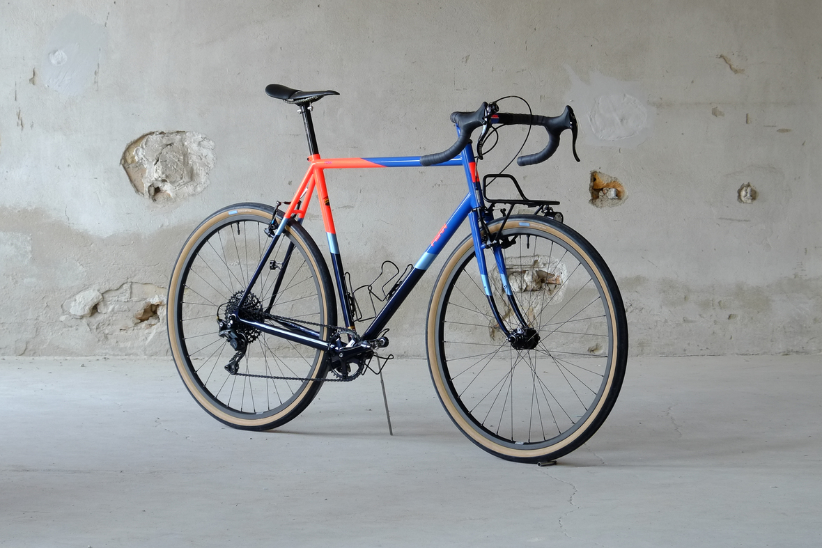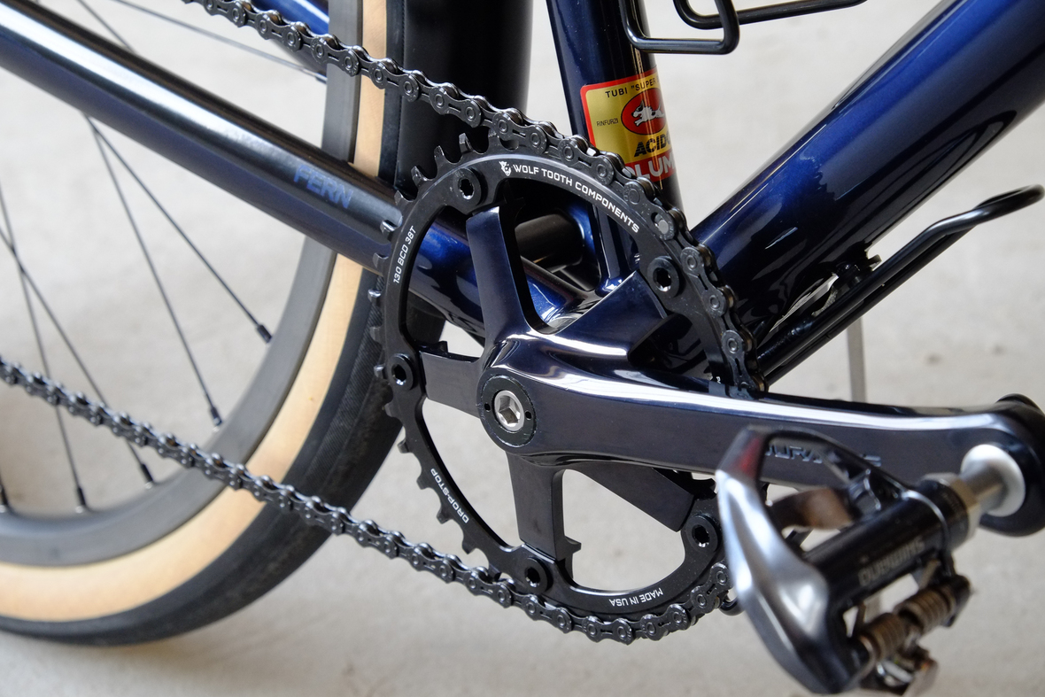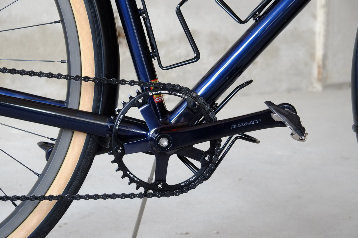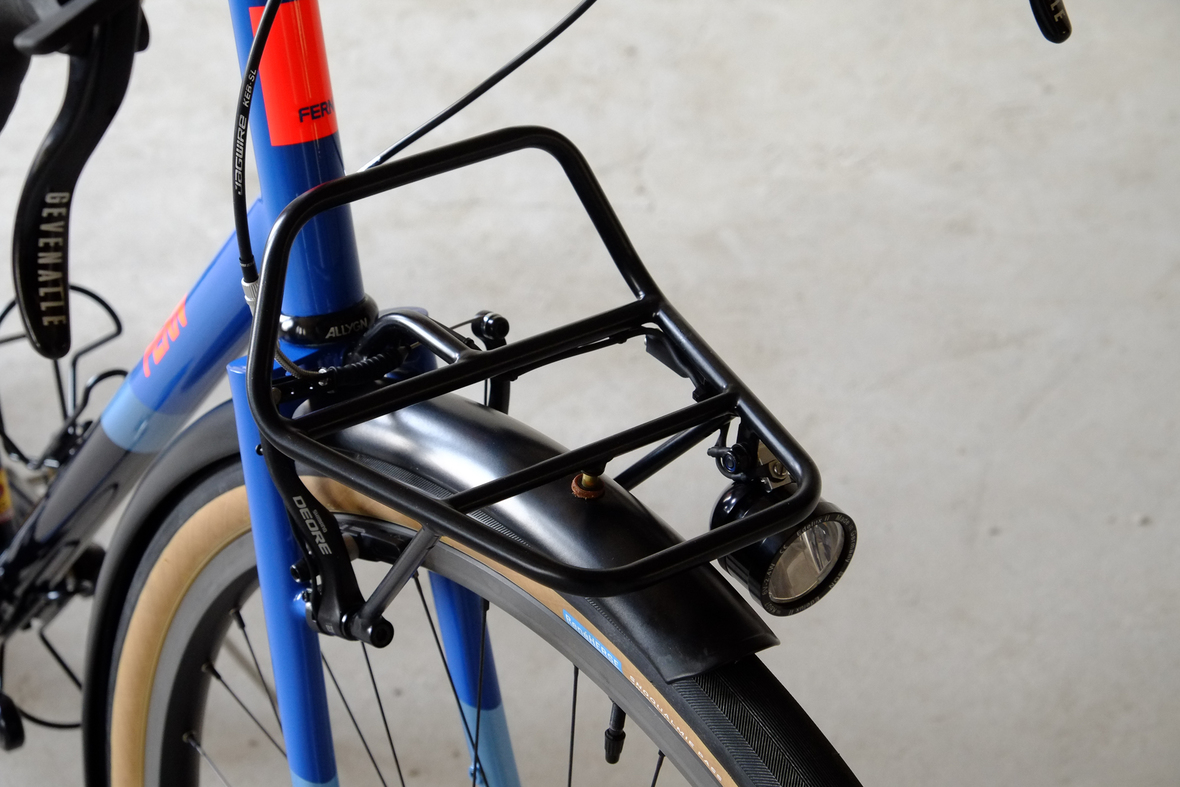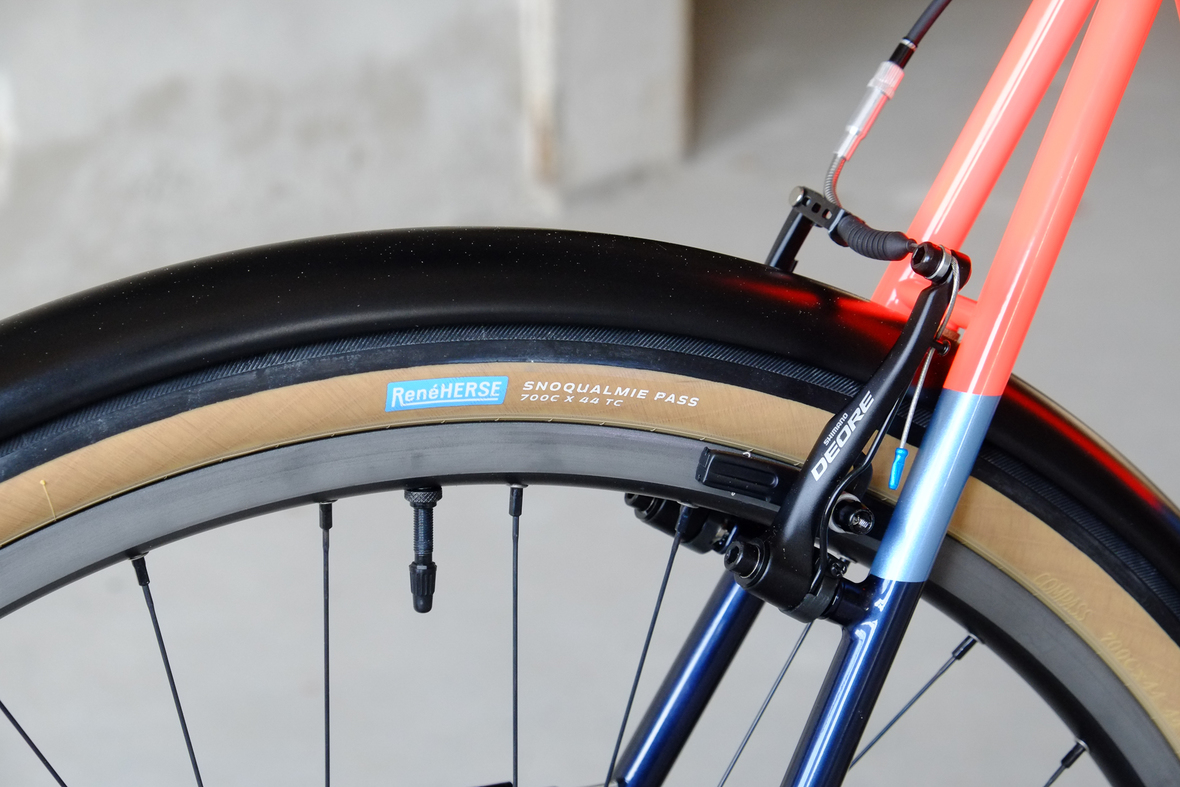 This wonderful Chico 28 finally goes out to my man Mr. Q! Thanks so much for being the most patient and nicest customers we 've had here at Fern, I hope the long time waiting was worth it ;) This bike is featuring a true racing bike geometry, but rolling super smooth on supple Rene Herse 44mm Snoqualmie Pass tires. Maximum speed and absolutely superior comfort on any kind of terrain, no matter if you go for racing on asphalt or for fun gravelriding off the road, the Chico 28 can do it all. The bike is equipped with a Gevenalle powered 1x11 Shimano drivetrain turned by a Wolftooth Drop Stop chainring mounted to a vintage custom anodized Dura Ace 7400 crankset. Fenders made by our friends at Berthoud Cycles, comfy contact points by Tune ,Whiskyparts and ESI grips. Lights and power supply by SON, "Schmidt's Original Nabendynamo". Stem and rack are all handmade by Fern. Awesome stripy paint sheme by our man Robert from Velociao . Have good time rolling on your new steed!