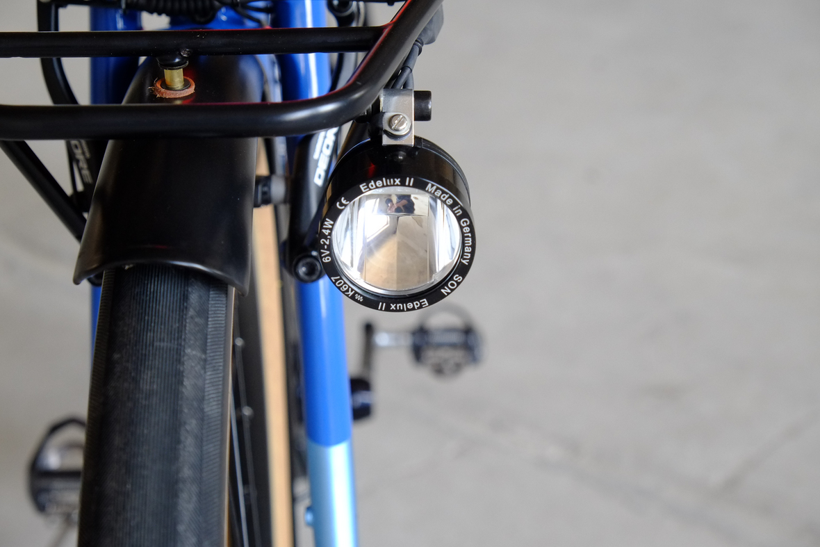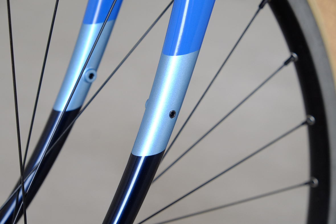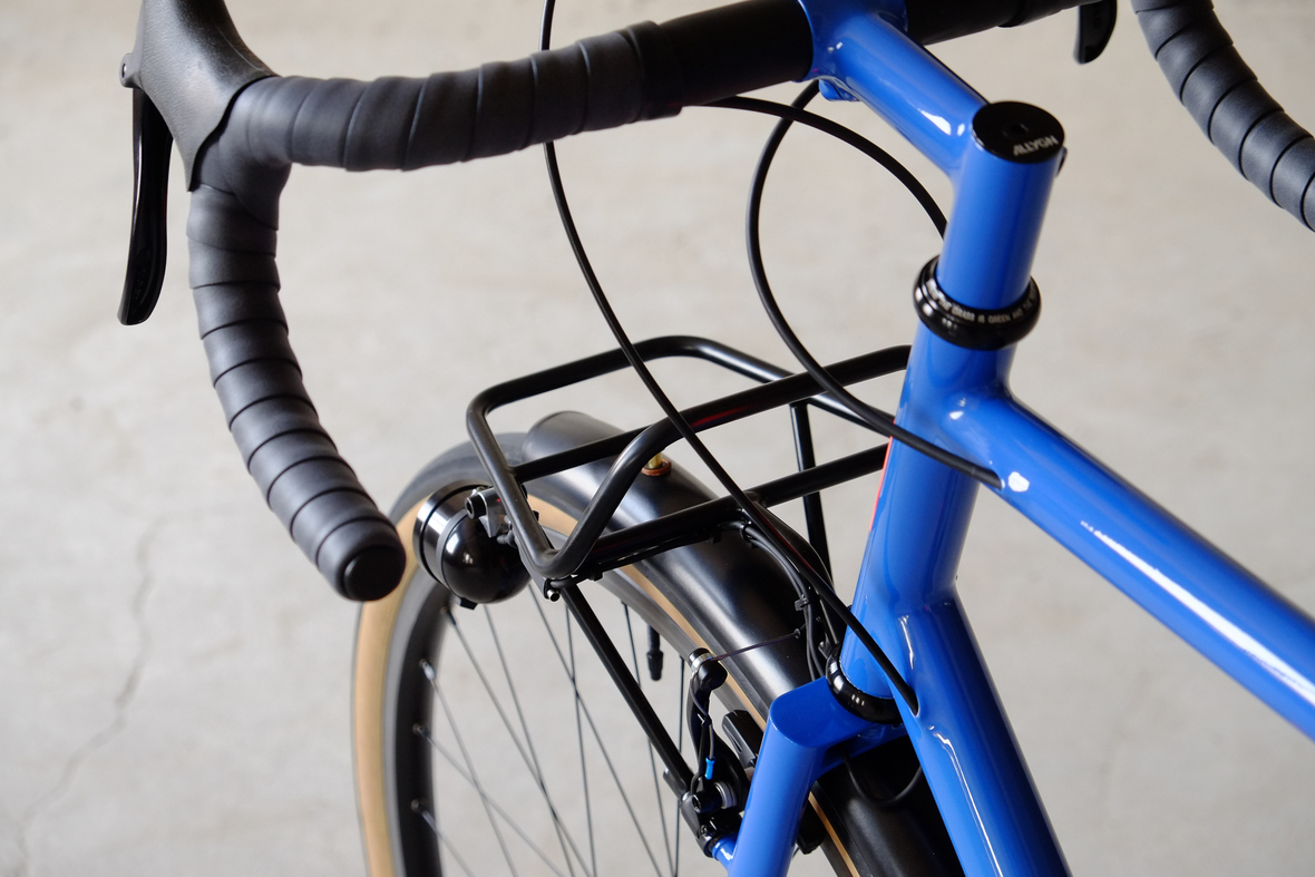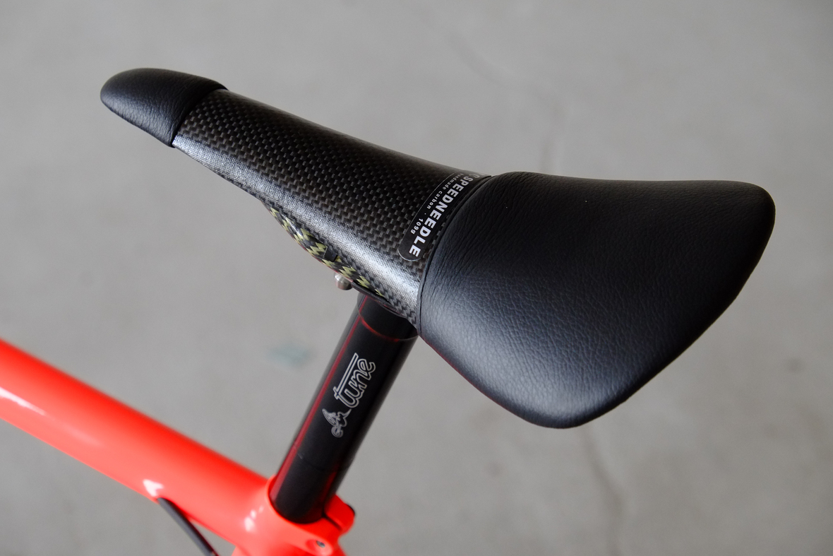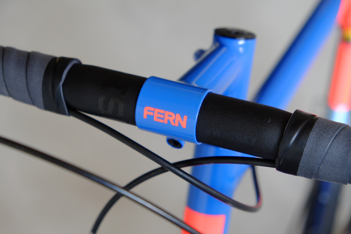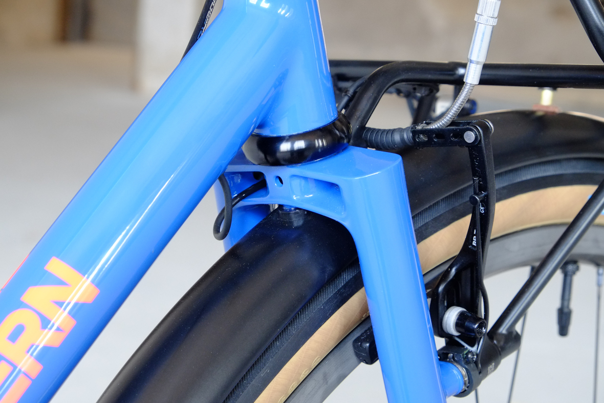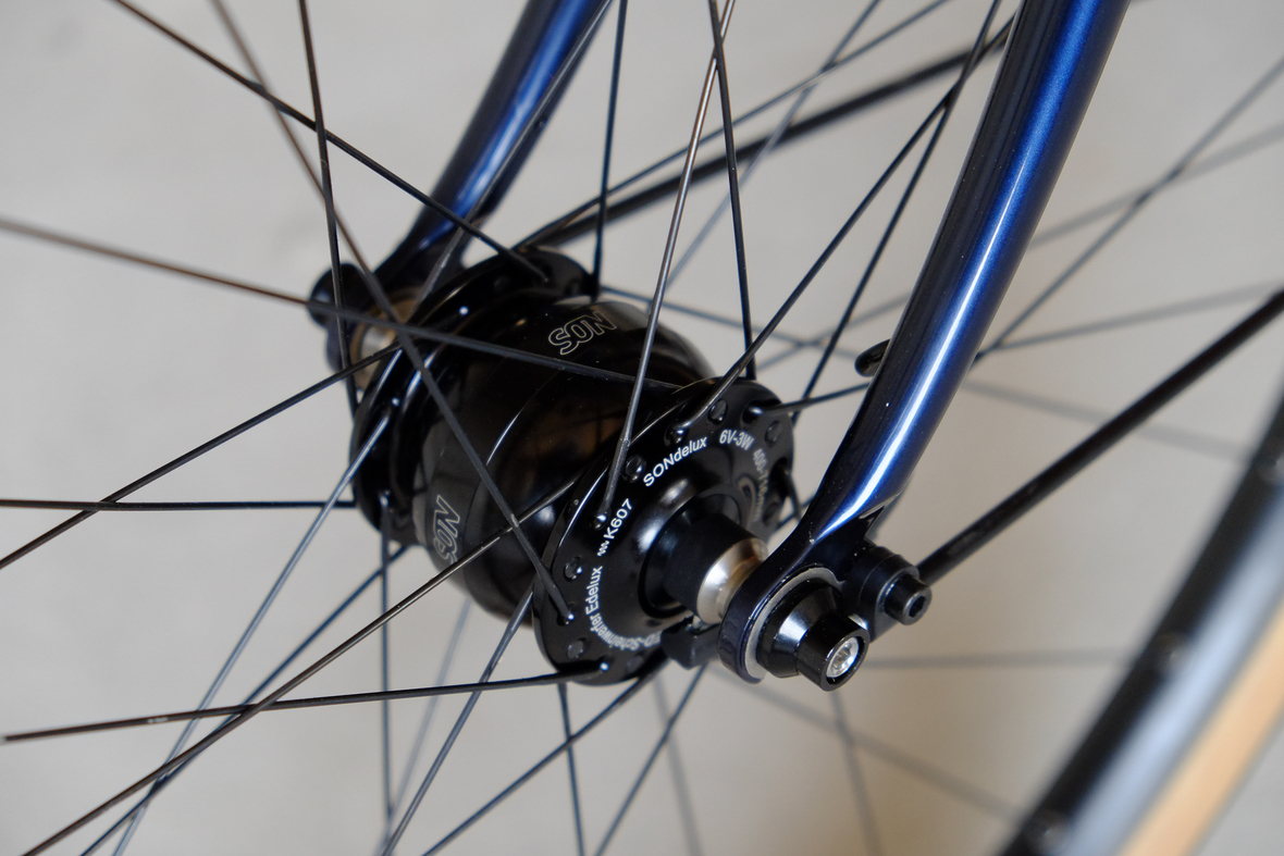 This wonderful Chico 28 finally goes out to my man Mr. Q! Thanks so much for being the most patient and nicest customers we 've had here at Fern, I hope the long time waiting was worth it ;) This bike is featuring a true racing bike geometry, but rolling super smooth on supple Rene Herse 44mm Snoqualmie Pass tires. Maximum speed and absolutely superior comfort on any kind of terrain, no matter if you go for racing on asphalt or for fun gravelriding off the road, the Chico 28 can do it all. The bike is equipped with a Gevenalle powered 1x11 Shimano drivetrain turned by a Wolftooth Drop Stop chainring mounted to a vintage custom anodized Dura Ace 7400 crankset. Fenders made by our friends at Berthoud Cycles, comfy contact points by Tune ,Whiskyparts and ESI grips. Lights and power supply by SON, "Schmidt's Original Nabendynamo". Stem and rack are all handmade by Fern. Awesome stripy paint sheme by our man Robert from Velociao . Have good time rolling on your new steed!