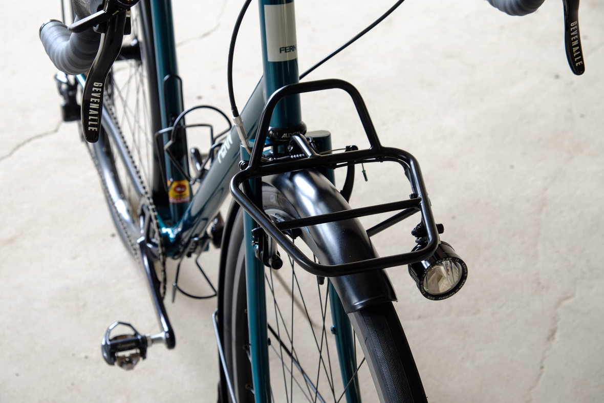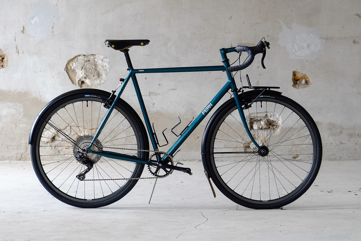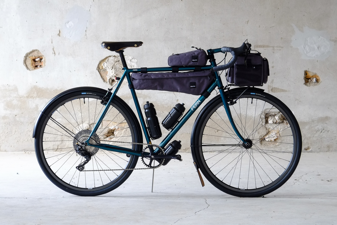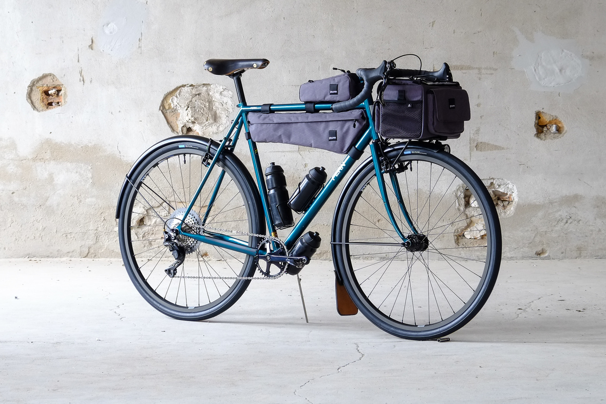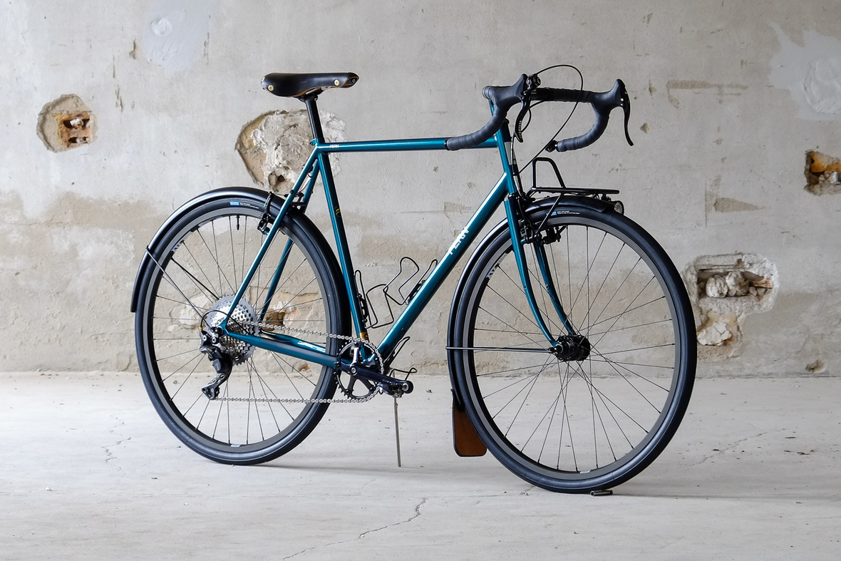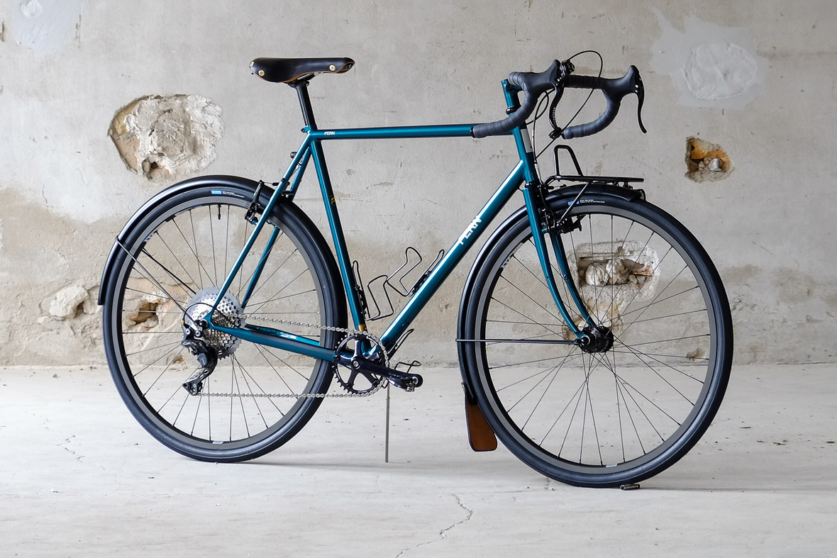 This Icelandic green Chico 28 Randonneur bike will not be ridden in Iceland but through the beautiful Swiss alps. Completely equipped with bags made by my love Kristin Gramm-Tourpacking this bike is ready for any long distance task. The bike comes with our classic and well proven set up of components, featuring as usual super comfy riding on @Rene Herse 38mm Bon Jon Pass extralight tires, mounted tubeless on the unfortunately no longer available super sonic carbide coated CSS Ryde rims. In combination with V-brakes they offer the best braking power ever to be found on rim brakes, equal if not better to the best disc brakes. Simple and reliable 1x11 Shimano XT drive train in combination with Gevenalle shifters gives you all the gearing you would need for any kind mountain pass. Smooth spinning with super low Q-factor vintage and custom anodized Dura Ace 7400 crankset, pimped up with a Wolftooth Drop Stop chainring. Super nice saddle, barend mirror, fenders and mudflap made by our friends at Berthoud Cycles. Lights and power supply by SON , "Schmidt's Original Nabendynamo".