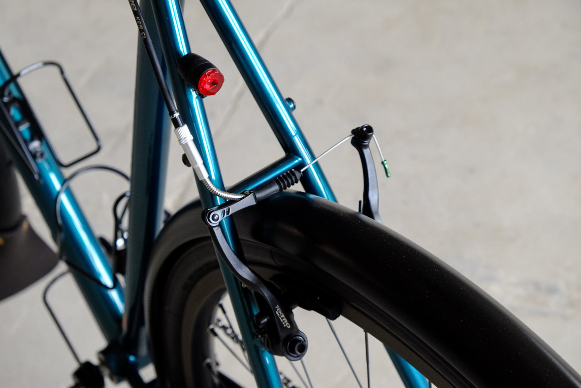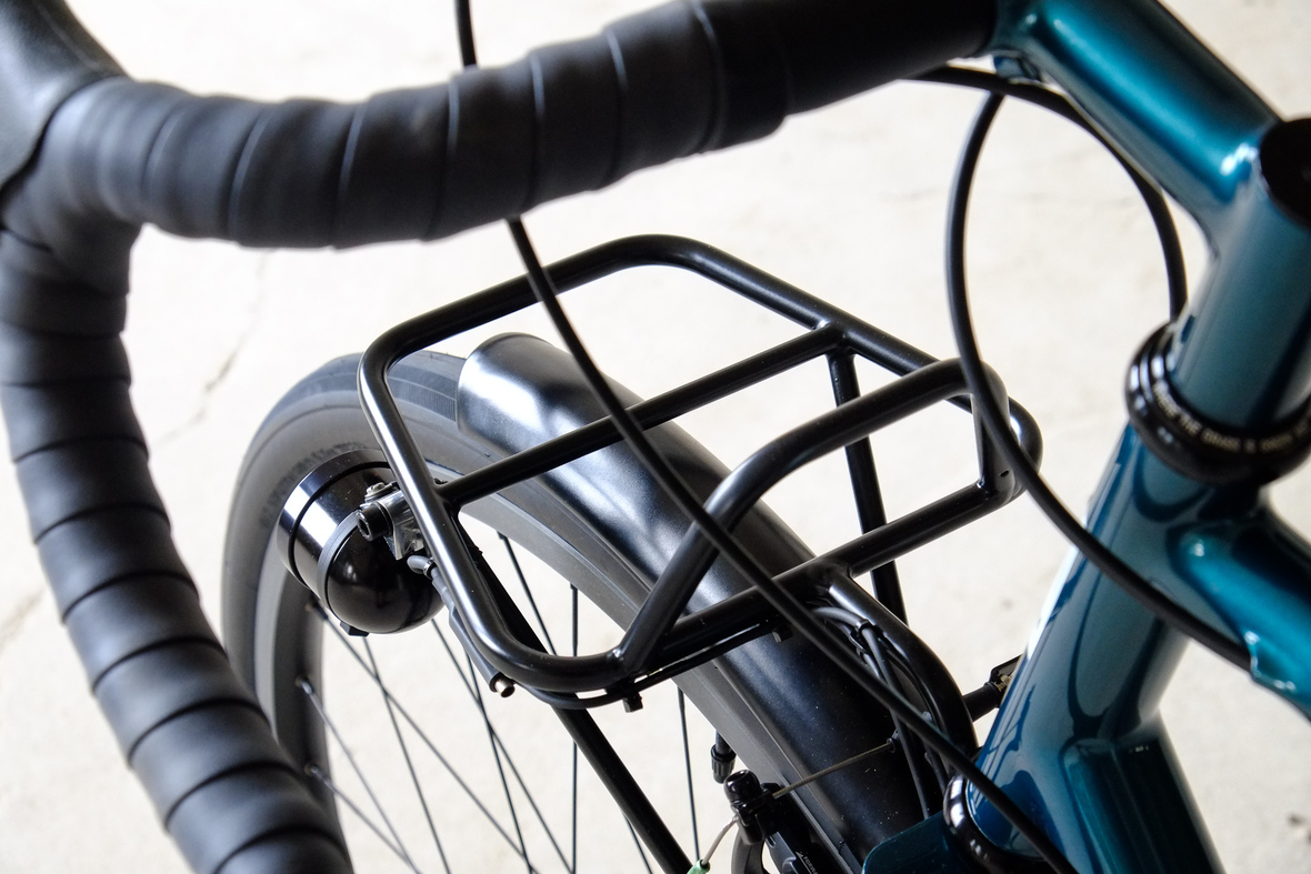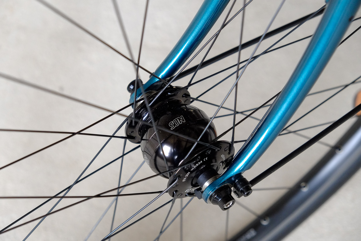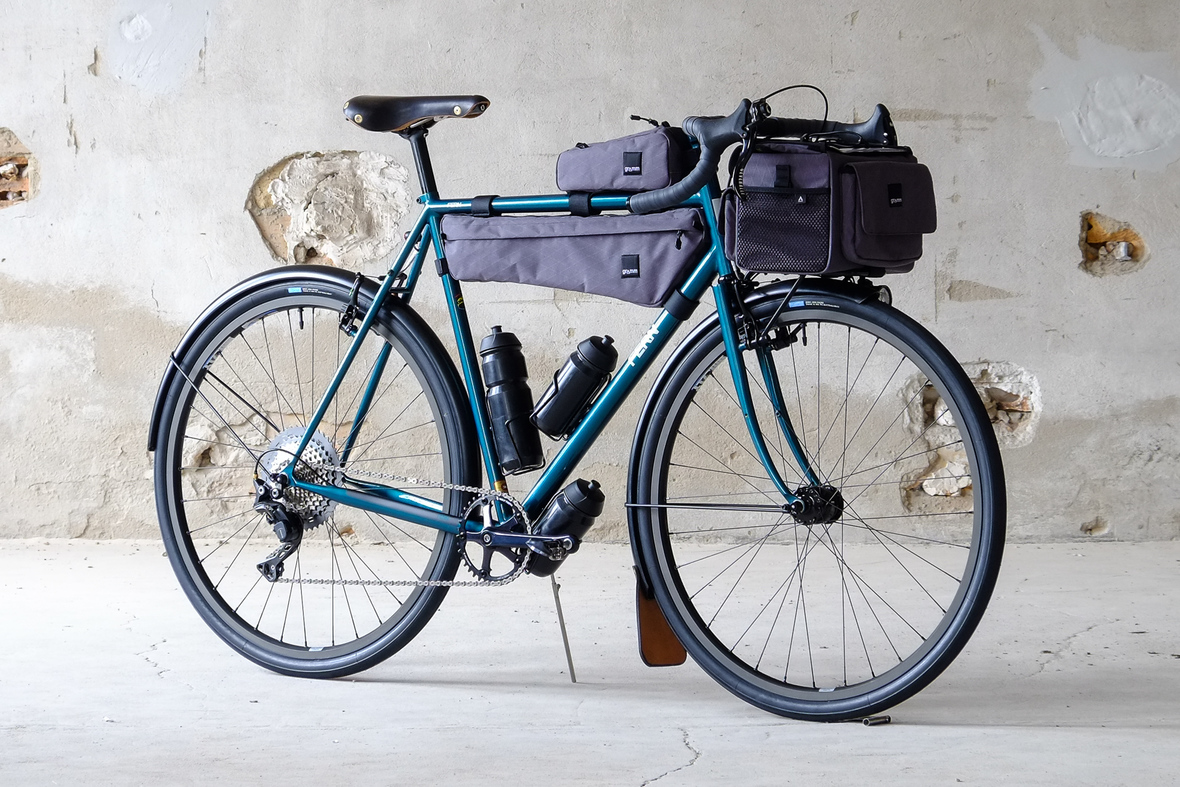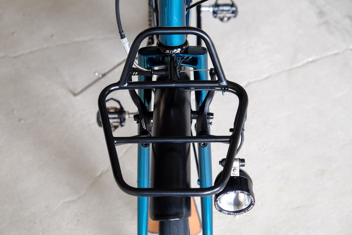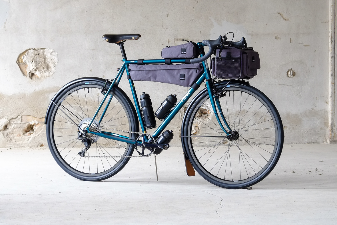 This Icelandic green Chico 28 Randonneur bike will not be ridden in Iceland but through the beautiful Swiss alps. Completely equipped with bags made by my love Kristin Gramm-Tourpacking this bike is ready for any long distance task. The bike comes with our classic and well proven set up of components, featuring as usual super comfy riding on @Rene Herse 38mm Bon Jon Pass extralight tires, mounted tubeless on the unfortunately no longer available super sonic carbide coated CSS Ryde rims. In combination with V-brakes they offer the best braking power ever to be found on rim brakes, equal if not better to the best disc brakes. Simple and reliable 1x11 Shimano XT drive train in combination with Gevenalle shifters gives you all the gearing you would need for any kind mountain pass. Smooth spinning with super low Q-factor vintage and custom anodized Dura Ace 7400 crankset, pimped up with a Wolftooth Drop Stop chainring. Super nice saddle, barend mirror, fenders and mudflap made by our friends at Berthoud Cycles. Lights and power supply by SON , "Schmidt's Original Nabendynamo".