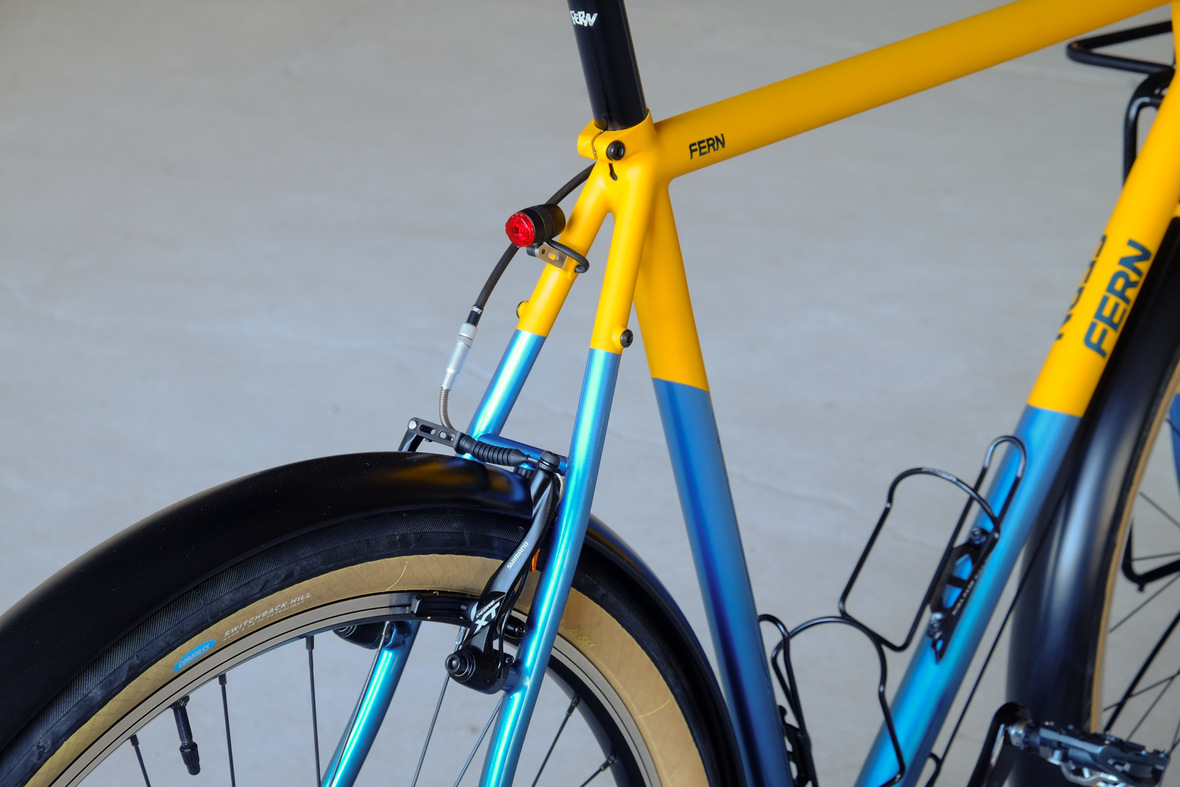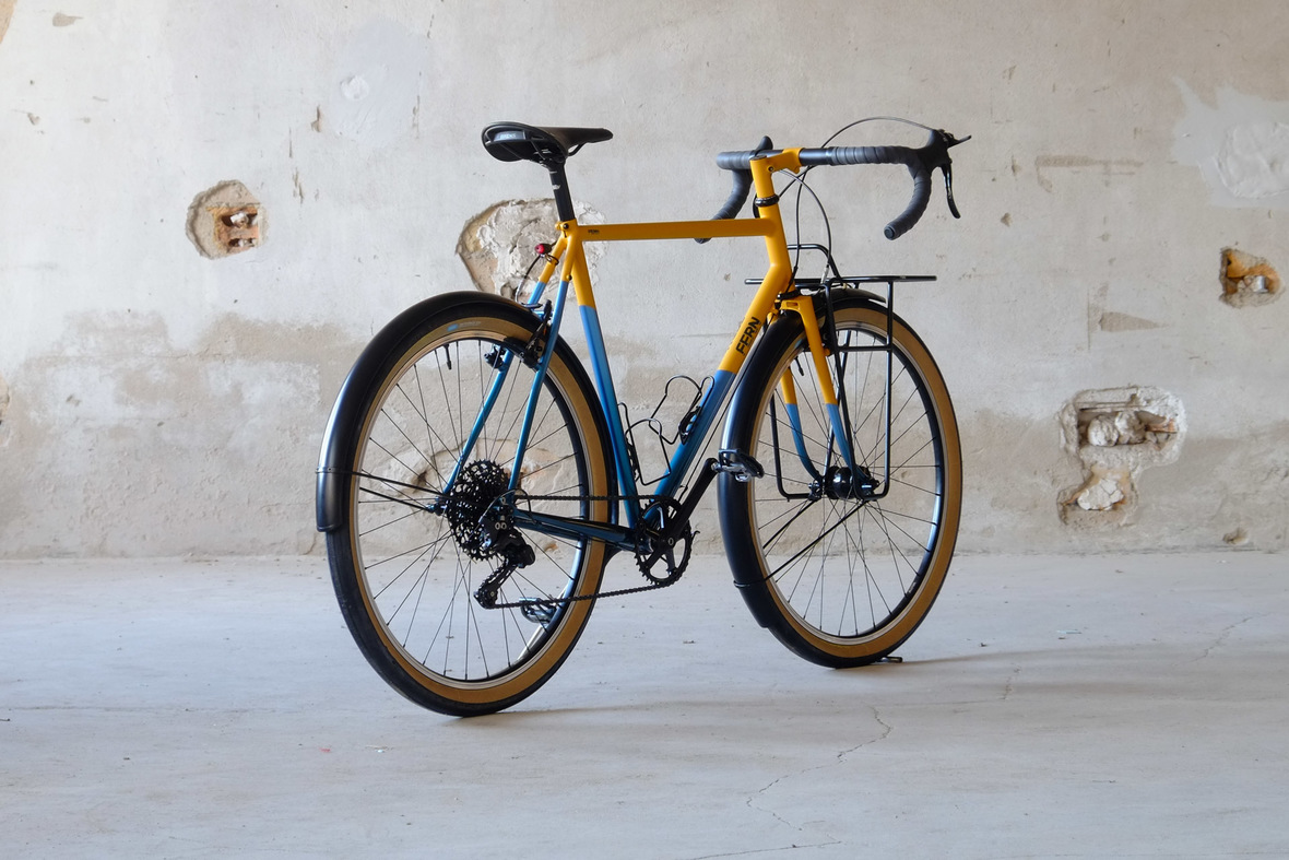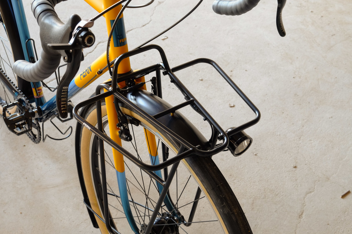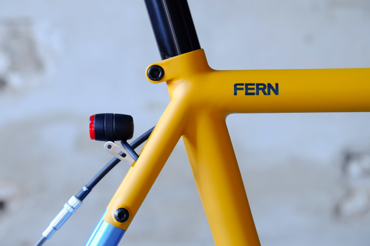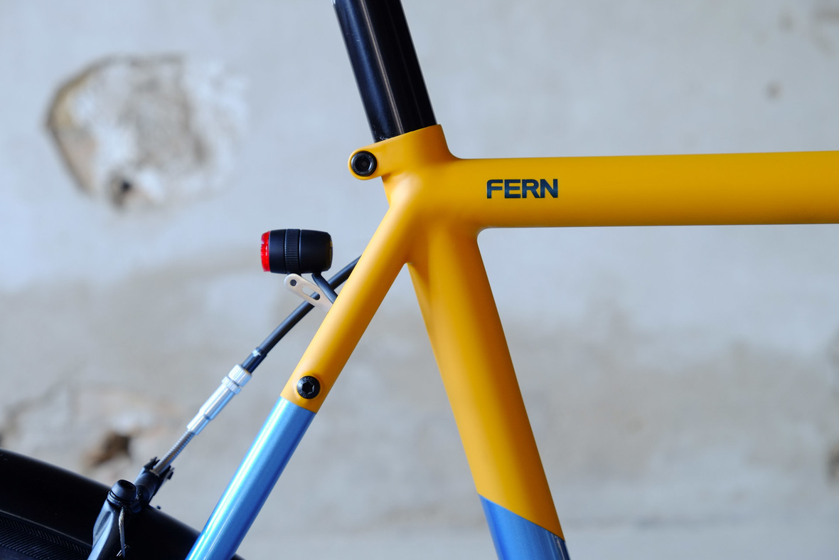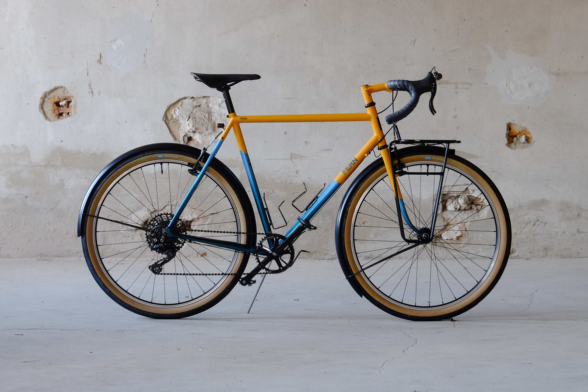 The brand new Chico+ is the newest addition to our line up of custom bikes, featuring a classic style randonneur geometry pimped up with the 650B 48mm Rene Herse Switchbackhill extralight tires, for maximum speed and absolutely superior comfort on any kind of terrain. No matter if you go for serious brevet riding on asphalt or for fun gravelriding off the road, you will always have the right bike for it. The bike is equipped with a Gevenalle powered 1x11 Shimano drivetrain turned by a Wolftooth chainring mounted to a vintage custom anodized Dura Ace 7400 crankset. Fenders made by our friends at Cycles Berthoud , super comfy contact points by Brooks and ESI. Lights and power supply by SON, Schmidt's Original Nabendynamo. Stems and racks are all made by Fern. Awesome matte/glossy paintsheme by our man Robert from Velociao .