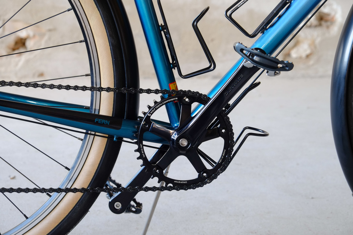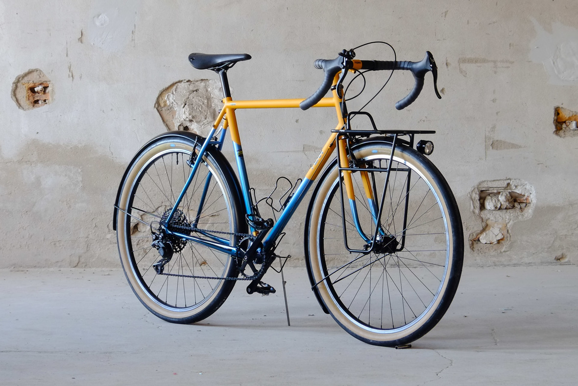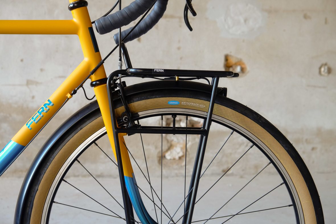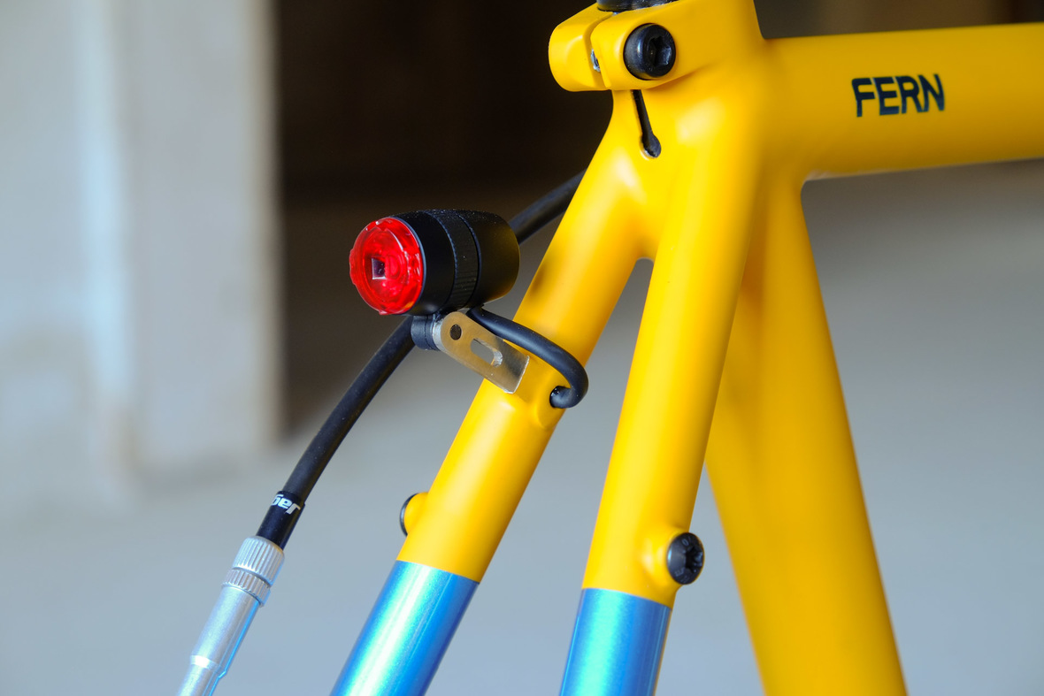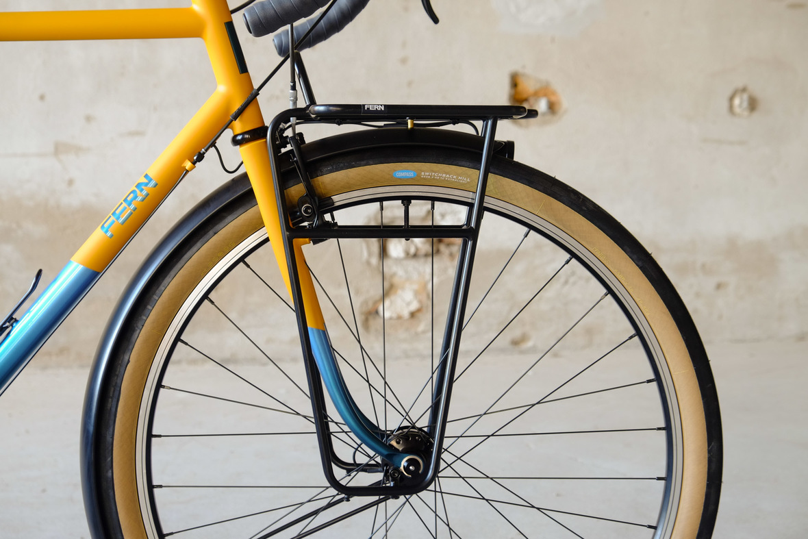 The brand new Chico+ is the newest addition to our line up of custom bikes, featuring a classic style randonneur geometry pimped up with the 650B 48mm Rene Herse Switchbackhill extralight tires, for maximum speed and absolutely superior comfort on any kind of terrain. No matter if you go for serious brevet riding on asphalt or for fun gravelriding off the road, you will always have the right bike for it. The bike is equipped with a Gevenalle powered 1x11 Shimano drivetrain turned by a Wolftooth chainring mounted to a vintage custom anodized Dura Ace 7400 crankset. Fenders made by our friends at Cycles Berthoud , super comfy contact points by Brooks and ESI. Lights and power supply by SON, Schmidt's Original Nabendynamo. Stems and racks are all made by Fern. Awesome matte/glossy paintsheme by our man Robert from Velociao .