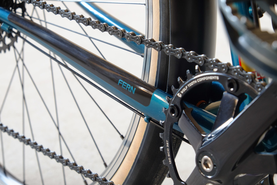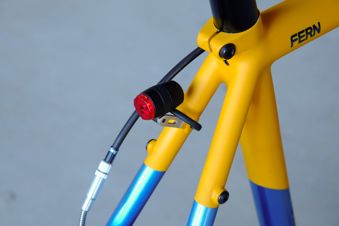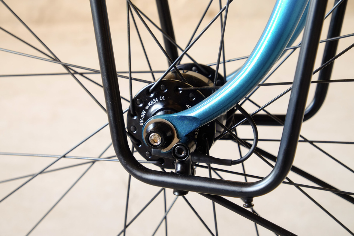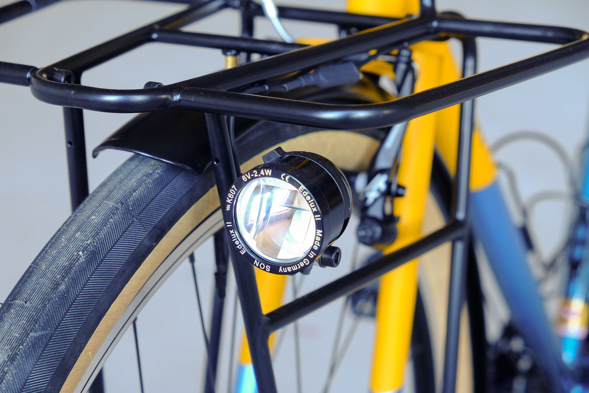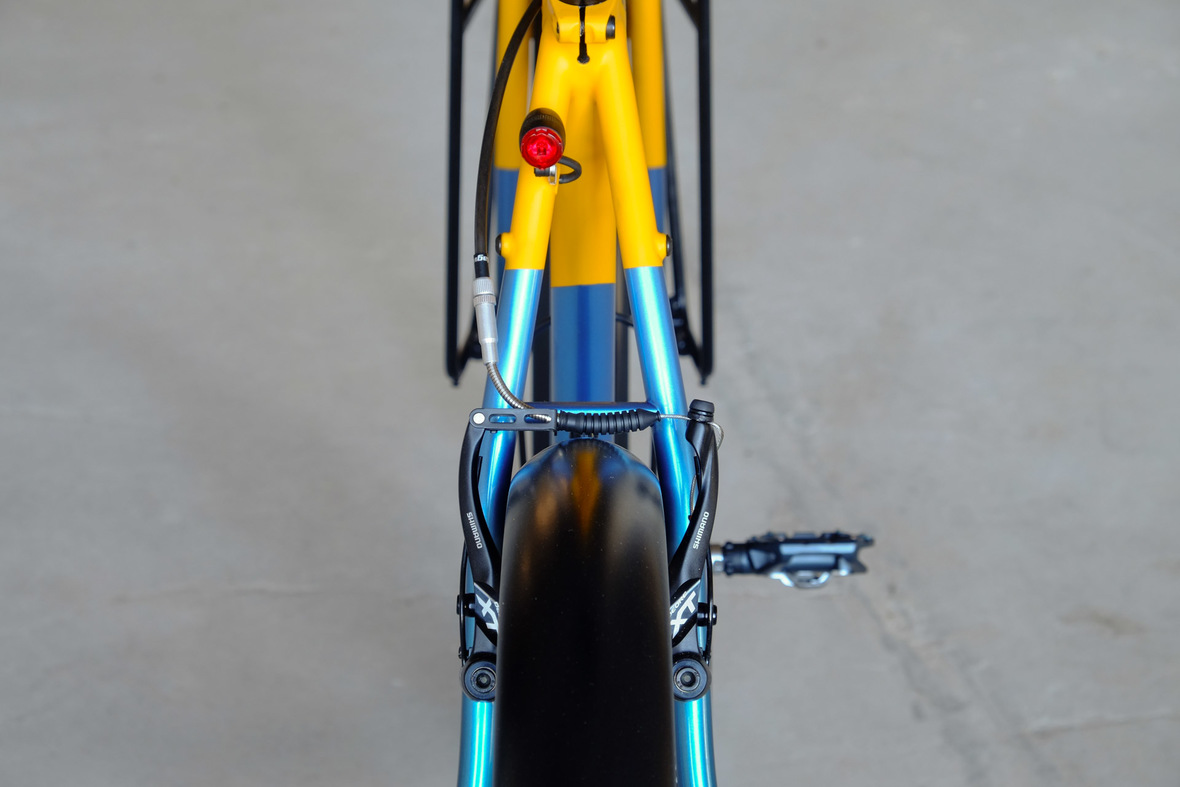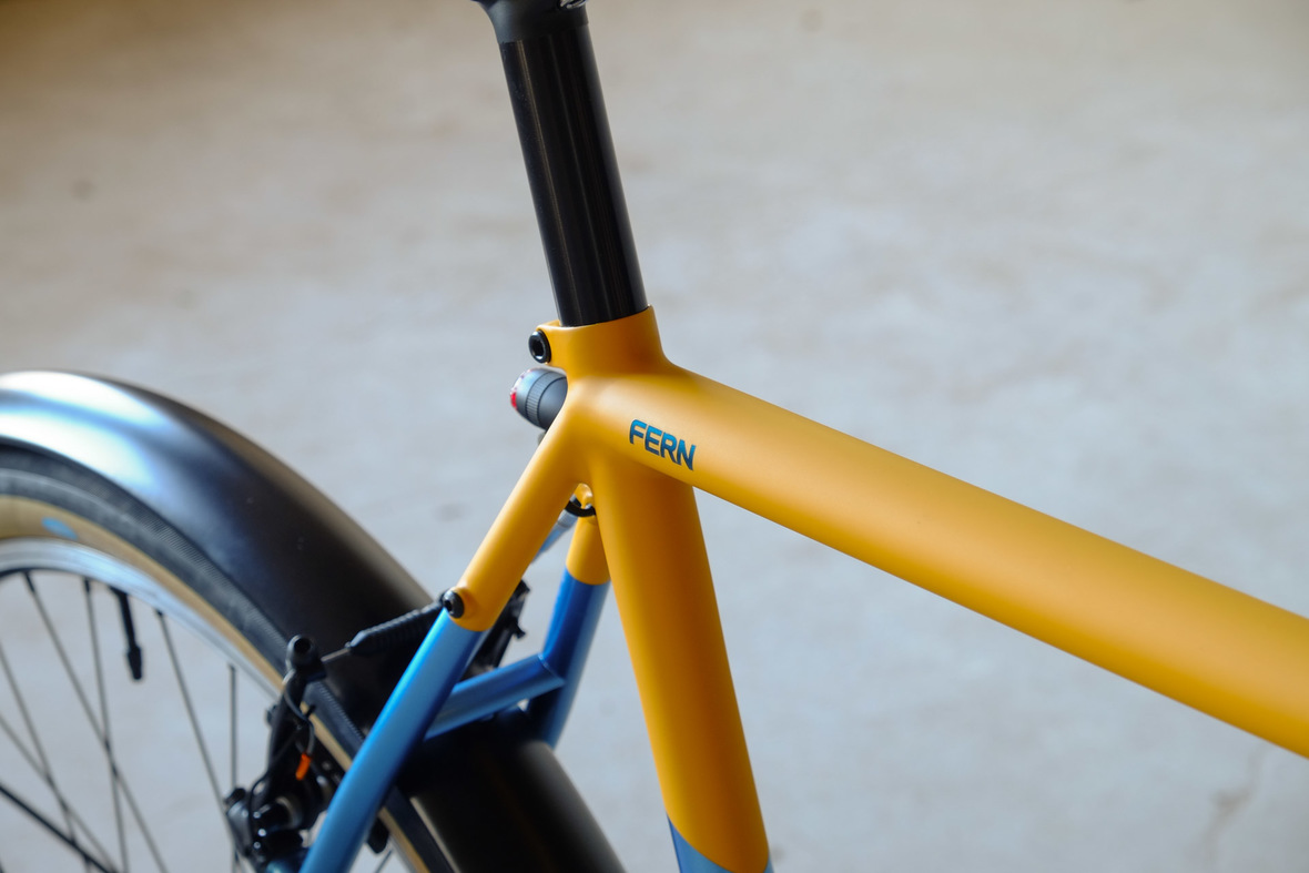 The brand new Chico+ is the newest addition to our line up of custom bikes, featuring a classic style randonneur geometry pimped up with the 650B 48mm Rene Herse Switchbackhill extralight tires, for maximum speed and absolutely superior comfort on any kind of terrain. No matter if you go for serious brevet riding on asphalt or for fun gravelriding off the road, you will always have the right bike for it. The bike is equipped with a Gevenalle powered 1x11 Shimano drivetrain turned by a Wolftooth chainring mounted to a vintage custom anodized Dura Ace 7400 crankset. Fenders made by our friends at Cycles Berthoud , super comfy contact points by Brooks and ESI. Lights and power supply by SON, Schmidt's Original Nabendynamo. Stems and racks are all made by Fern. Awesome matte/glossy paintsheme by our man Robert from Velociao .