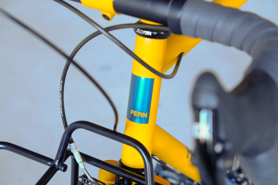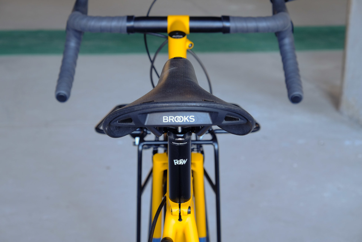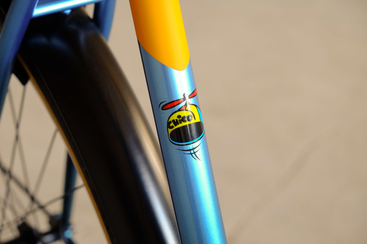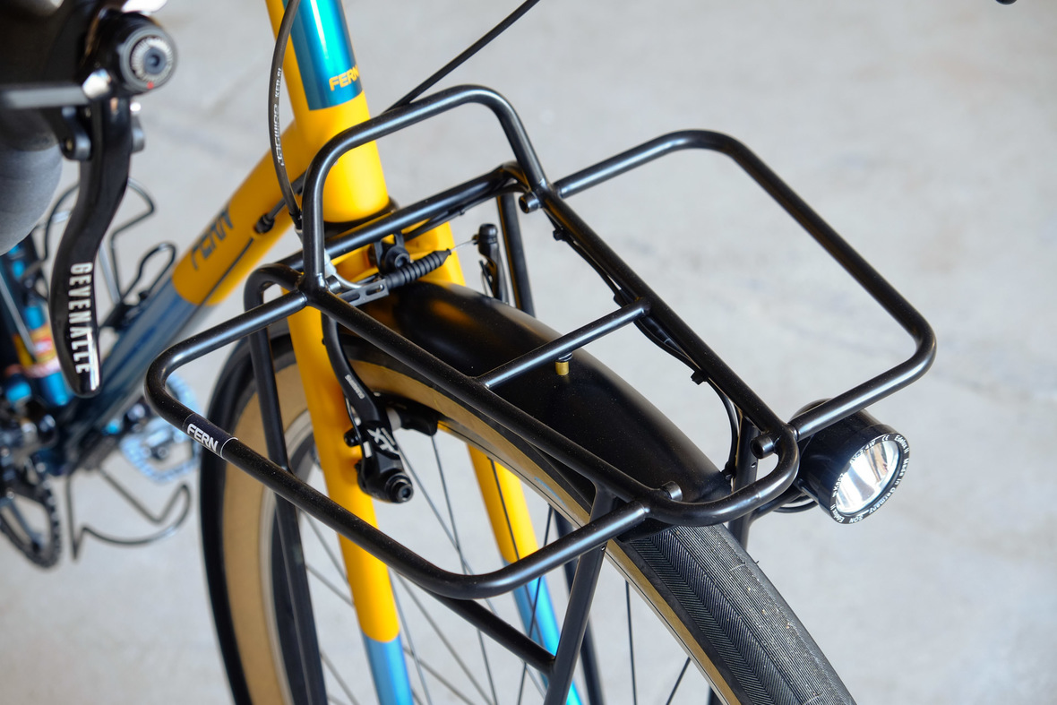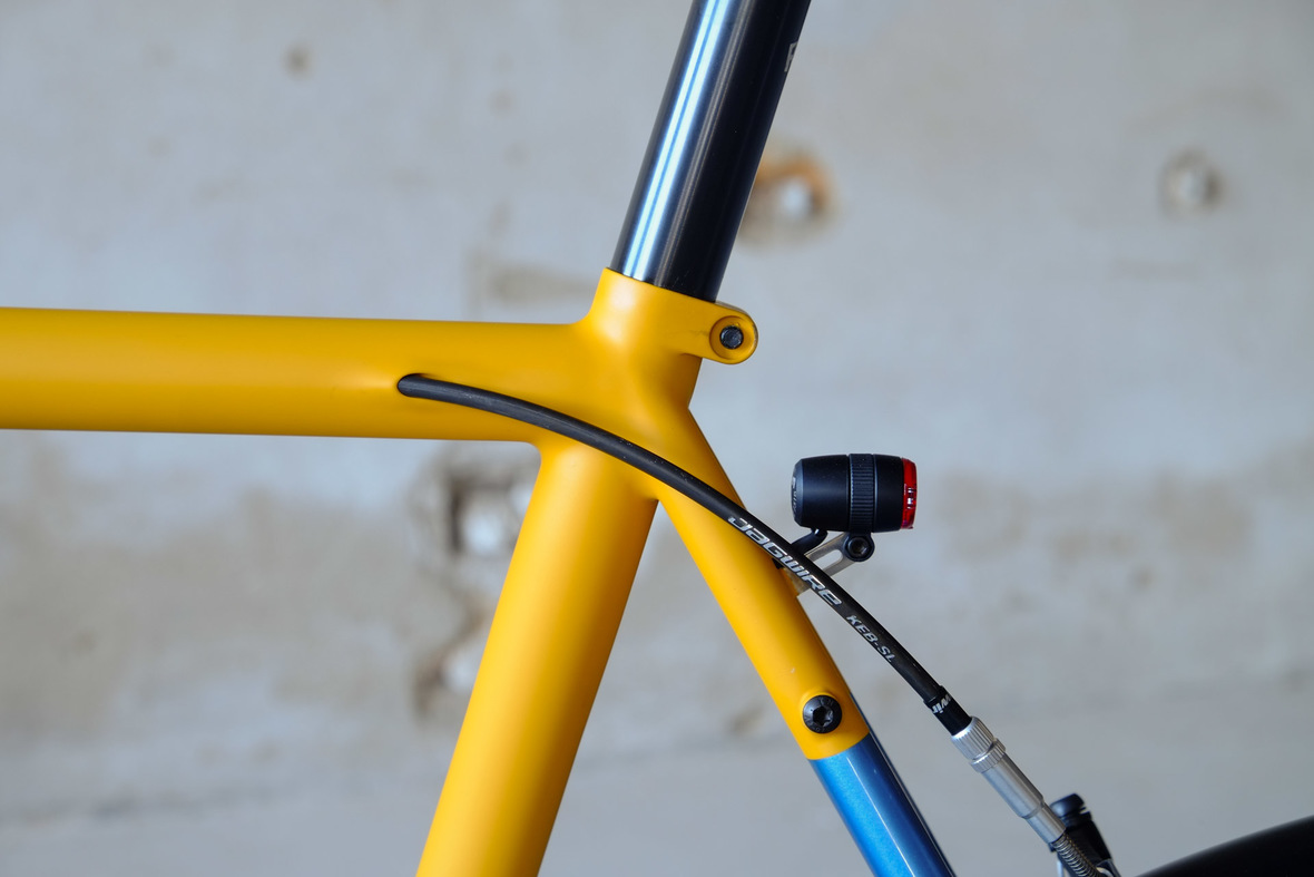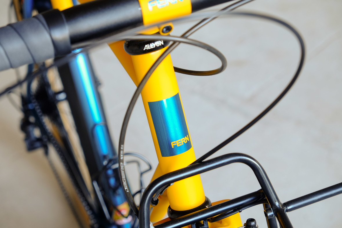 The brand new Chico+ is the newest addition to our line up of custom bikes, featuring a classic style randonneur geometry pimped up with the 650B 48mm Rene Herse Switchbackhill extralight tires, for maximum speed and absolutely superior comfort on any kind of terrain. No matter if you go for serious brevet riding on asphalt or for fun gravelriding off the road, you will always have the right bike for it. The bike is equipped with a Gevenalle powered 1x11 Shimano drivetrain turned by a Wolftooth chainring mounted to a vintage custom anodized Dura Ace 7400 crankset. Fenders made by our friends at Cycles Berthoud , super comfy contact points by Brooks and ESI. Lights and power supply by SON, Schmidt's Original Nabendynamo. Stems and racks are all made by Fern. Awesome matte/glossy paintsheme by our man Robert from Velociao .