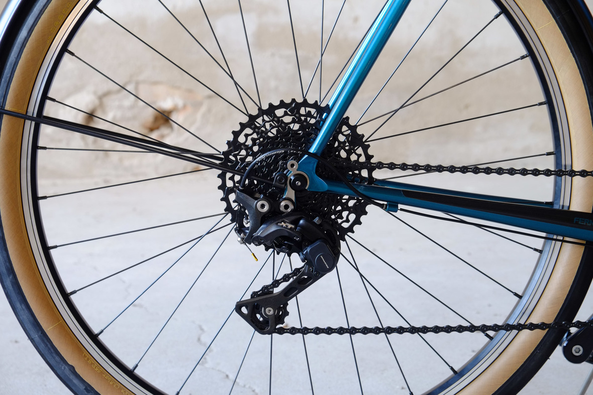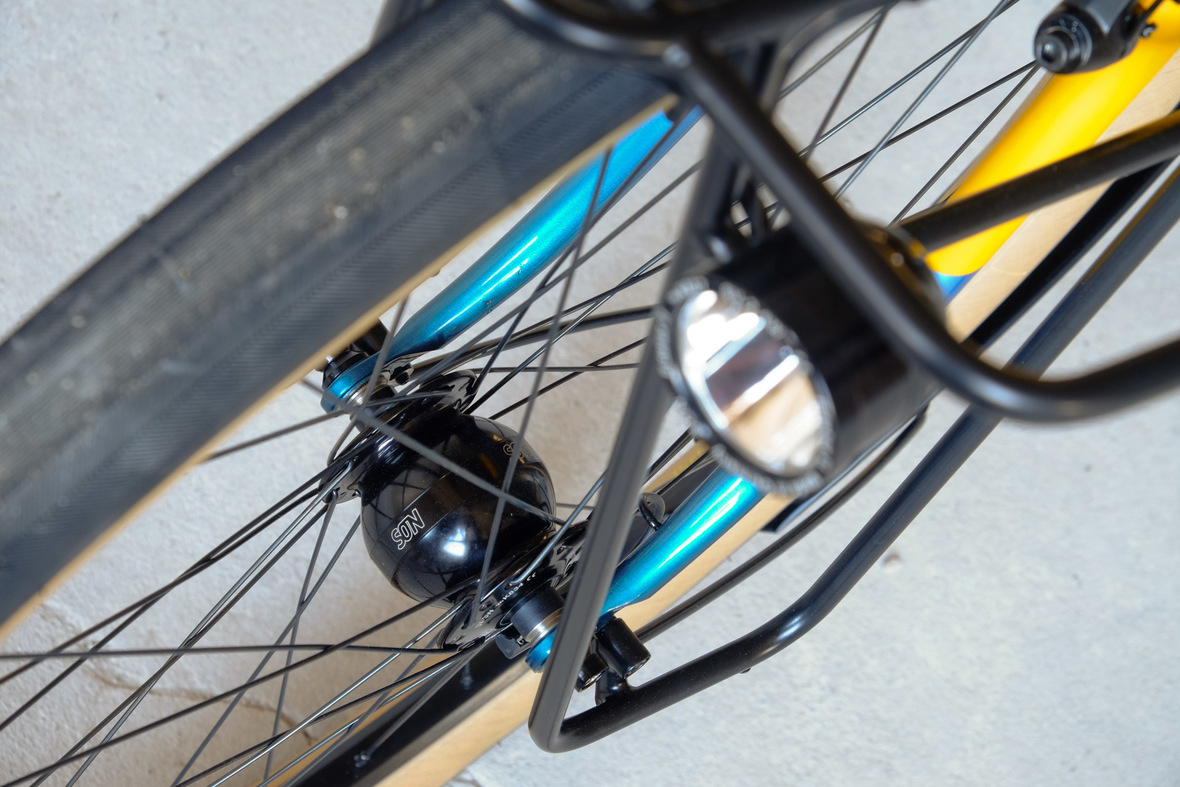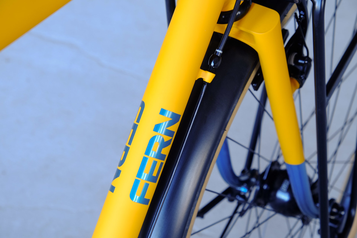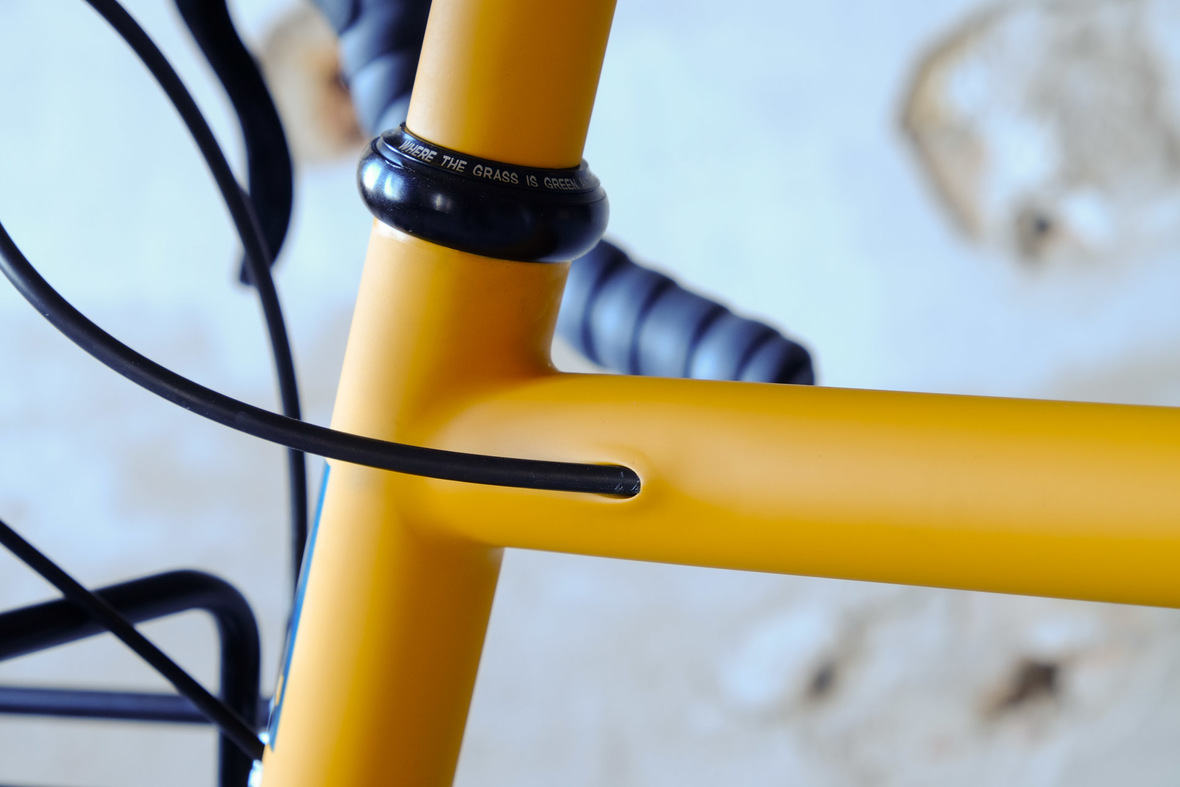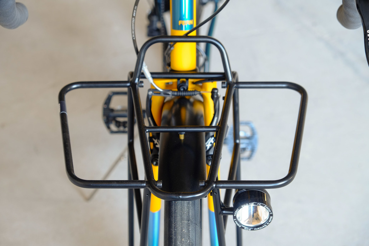 The brand new Chico+ is the newest addition to our line up of custom bikes, featuring a classic style randonneur geometry pimped up with the 650B 48mm Rene Herse Switchbackhill extralight tires, for maximum speed and absolutely superior comfort on any kind of terrain. No matter if you go for serious brevet riding on asphalt or for fun gravelriding off the road, you will always have the right bike for it. The bike is equipped with a Gevenalle powered 1x11 Shimano drivetrain turned by a Wolftooth chainring mounted to a vintage custom anodized Dura Ace 7400 crankset. Fenders made by our friends at Cycles Berthoud , super comfy contact points by Brooks and ESI. Lights and power supply by SON, Schmidt's Original Nabendynamo. Stems and racks are all made by Fern. Awesome matte/glossy paintsheme by our man Robert from Velociao .