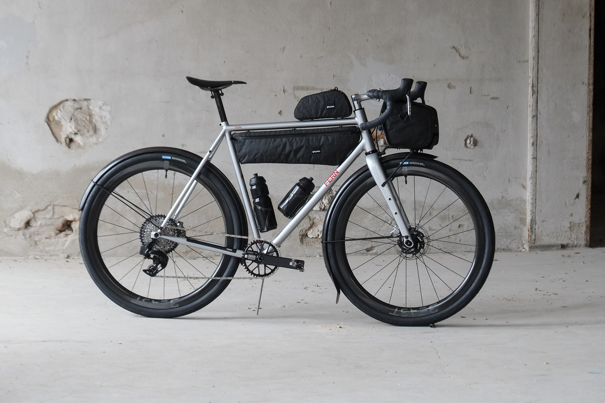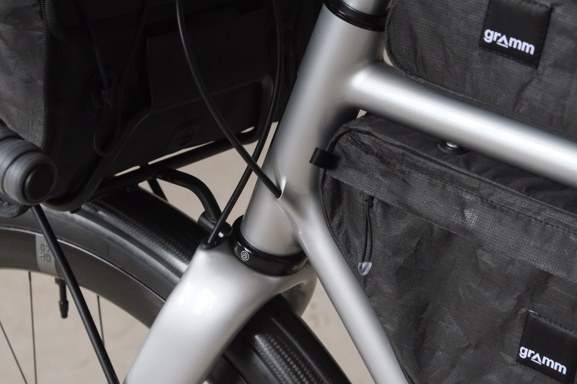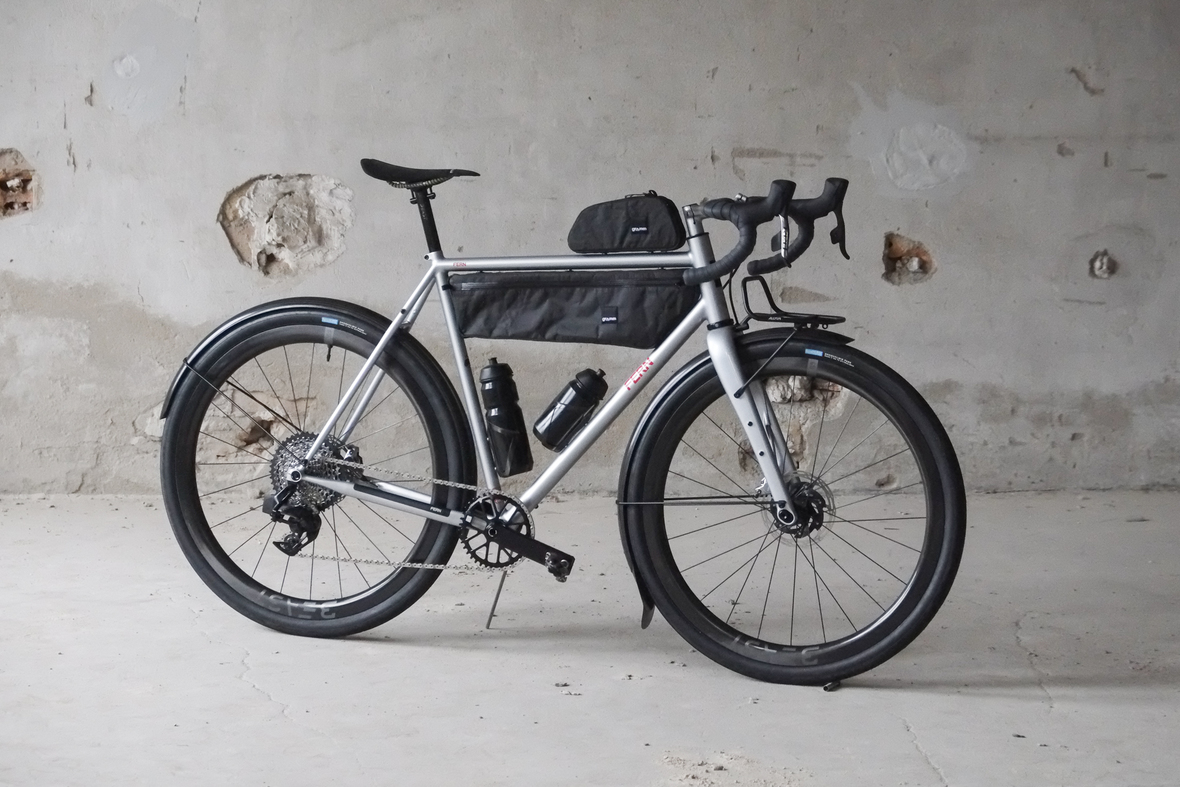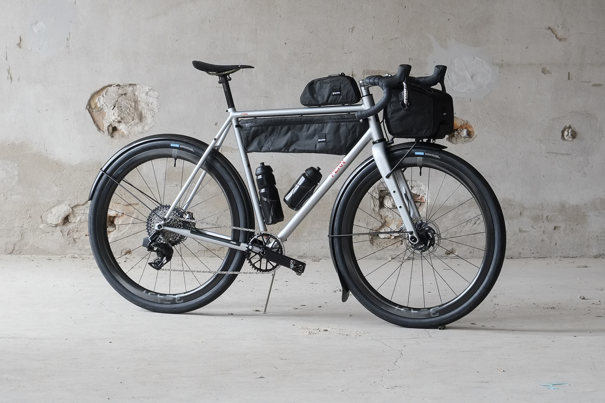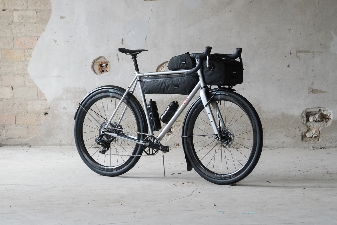 First of all, very fast!! The bike should also feature classic lines, but build up with super modern components. Lots of carbon parts, electronic shifting, high end CNC machined engine/drive train parts and as the icing on the cake custom made Gramm Tourpacking bags which are color matching the interior of that car. Robert @Velociao.com did a great job with recreating the original silver Porsche color paint job!