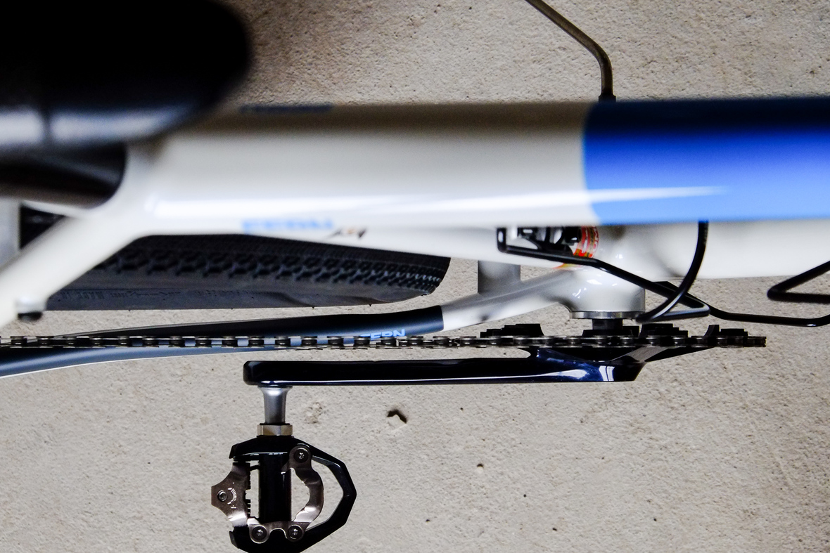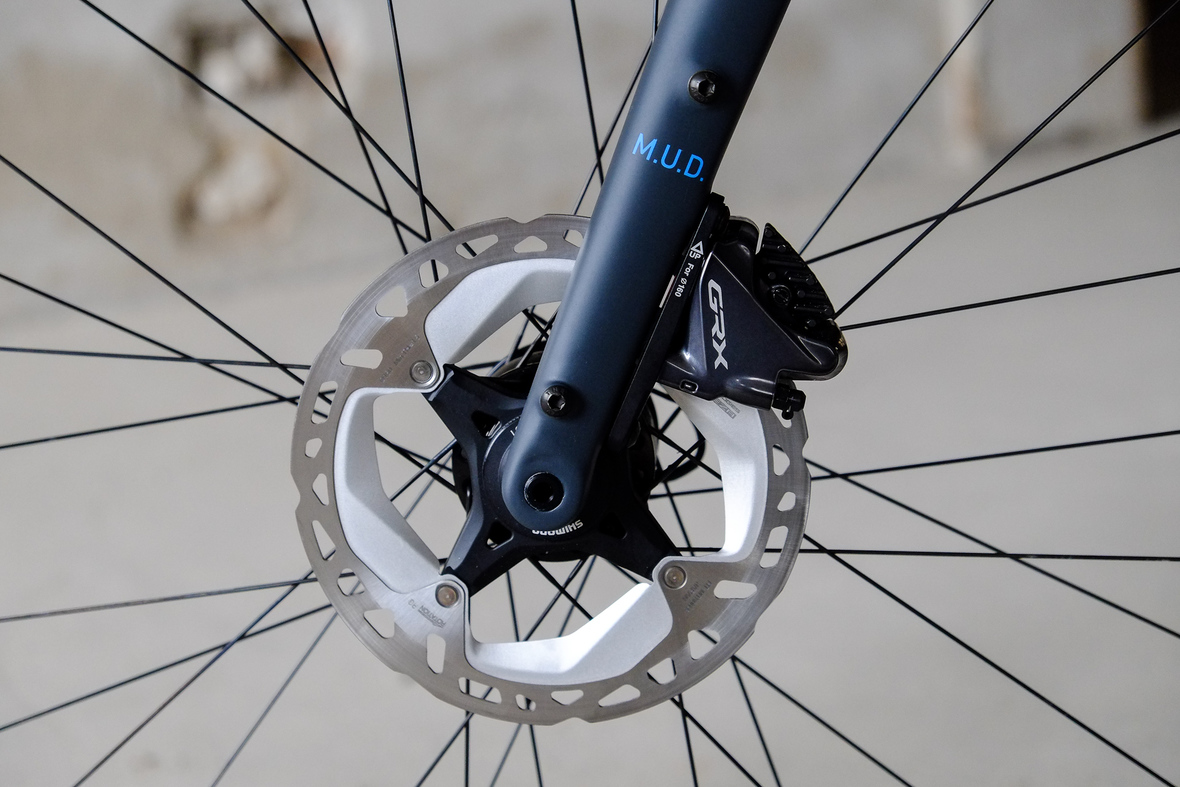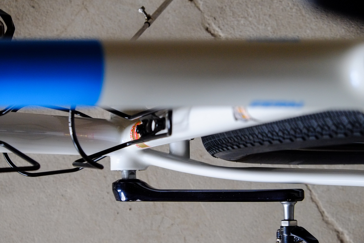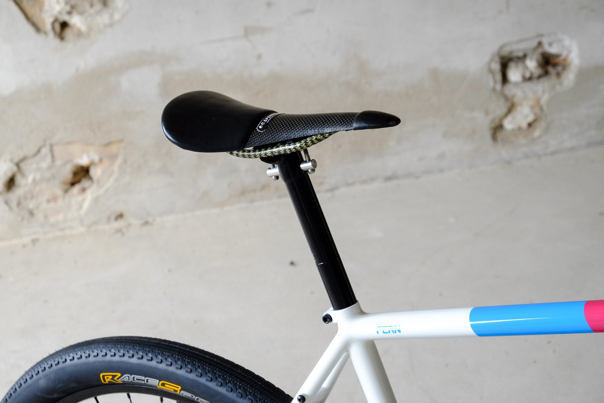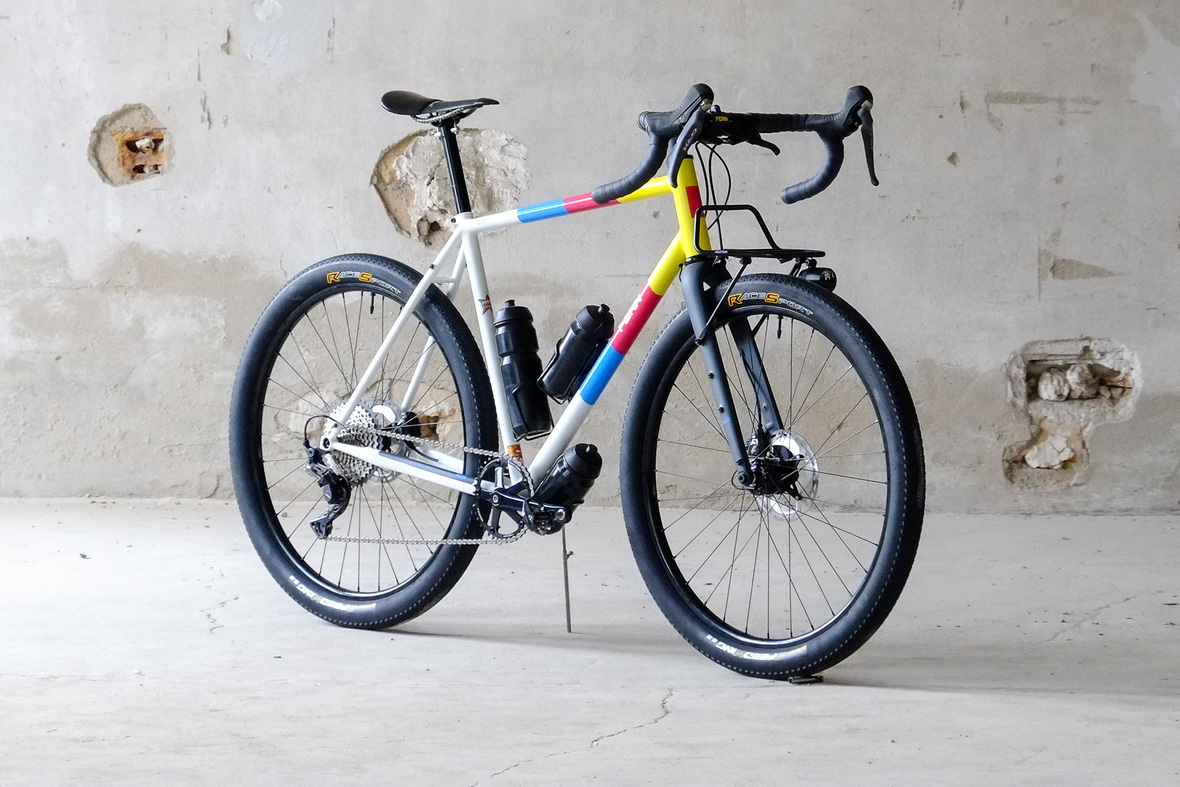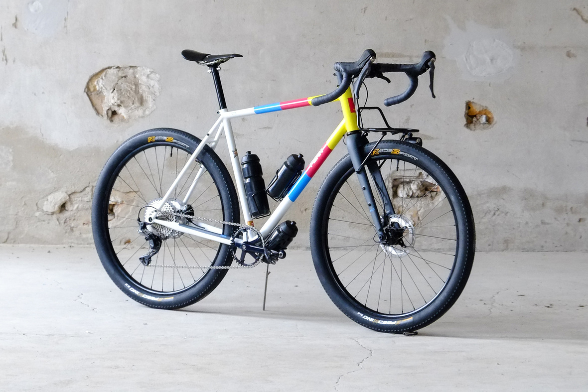 The bike is equipped with the new Shimano GRX 1x11 group, superlight post and seat by Tune, power supply by SON. Running super smooth on 650B 55mm Conti Speedkings mounted on superlight Stan's Crest rims, this beast goes really fast!
