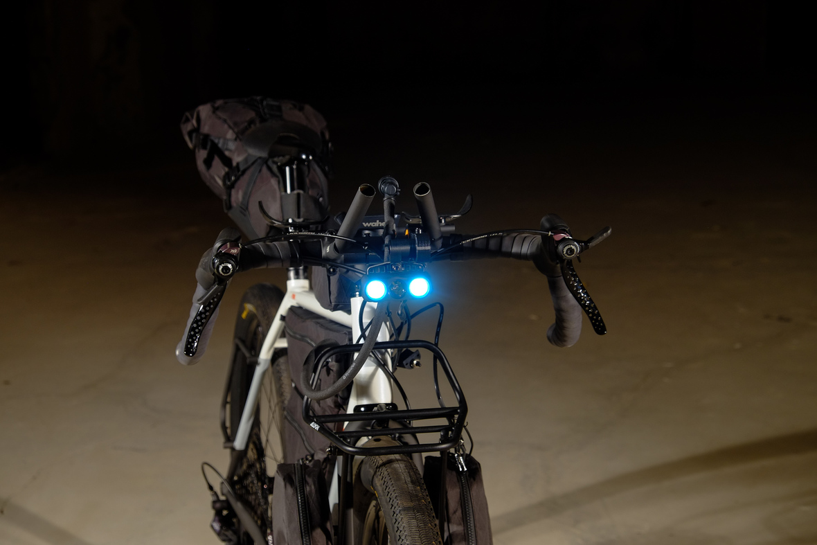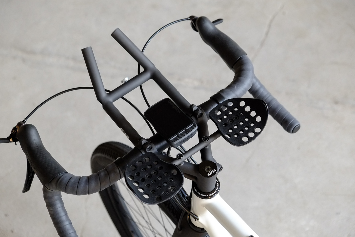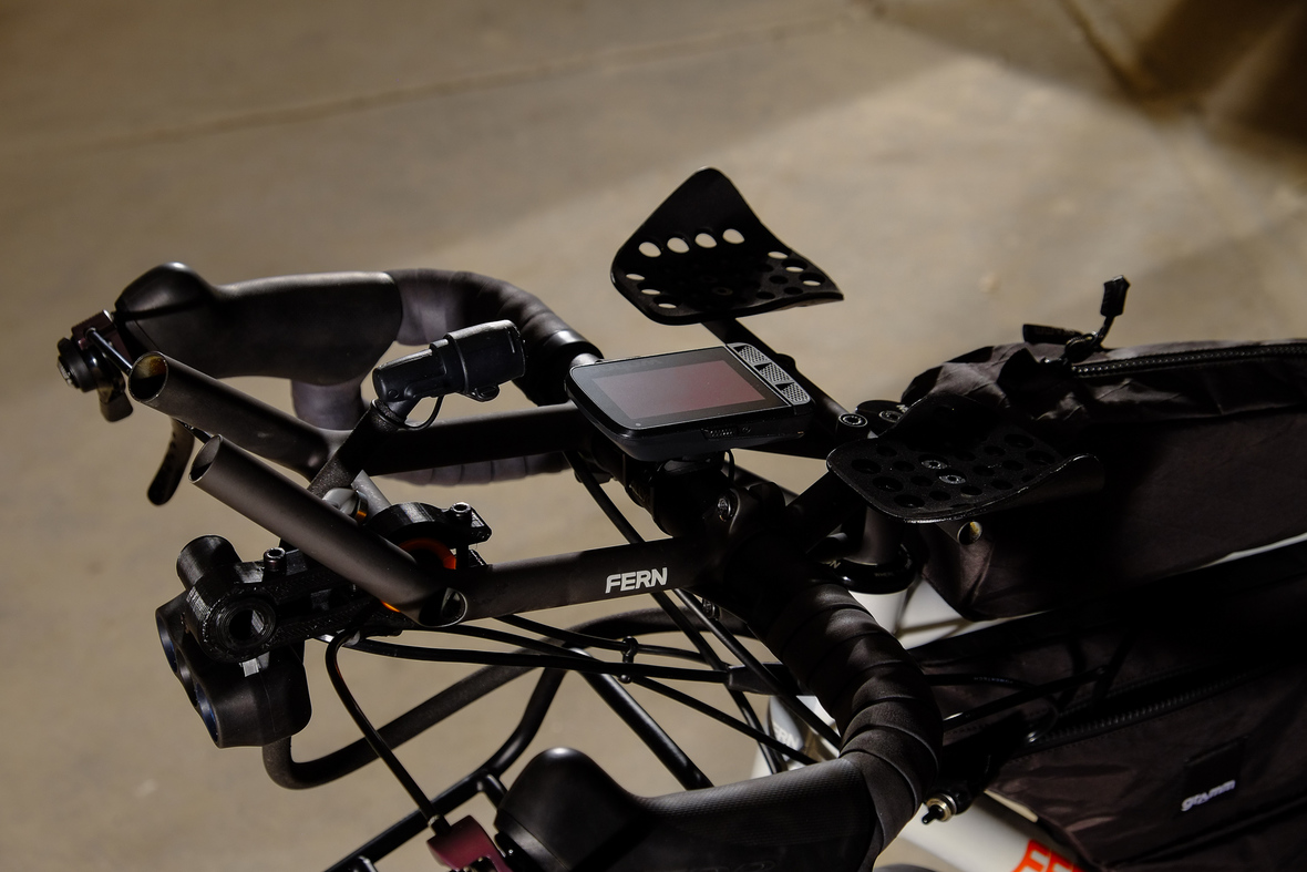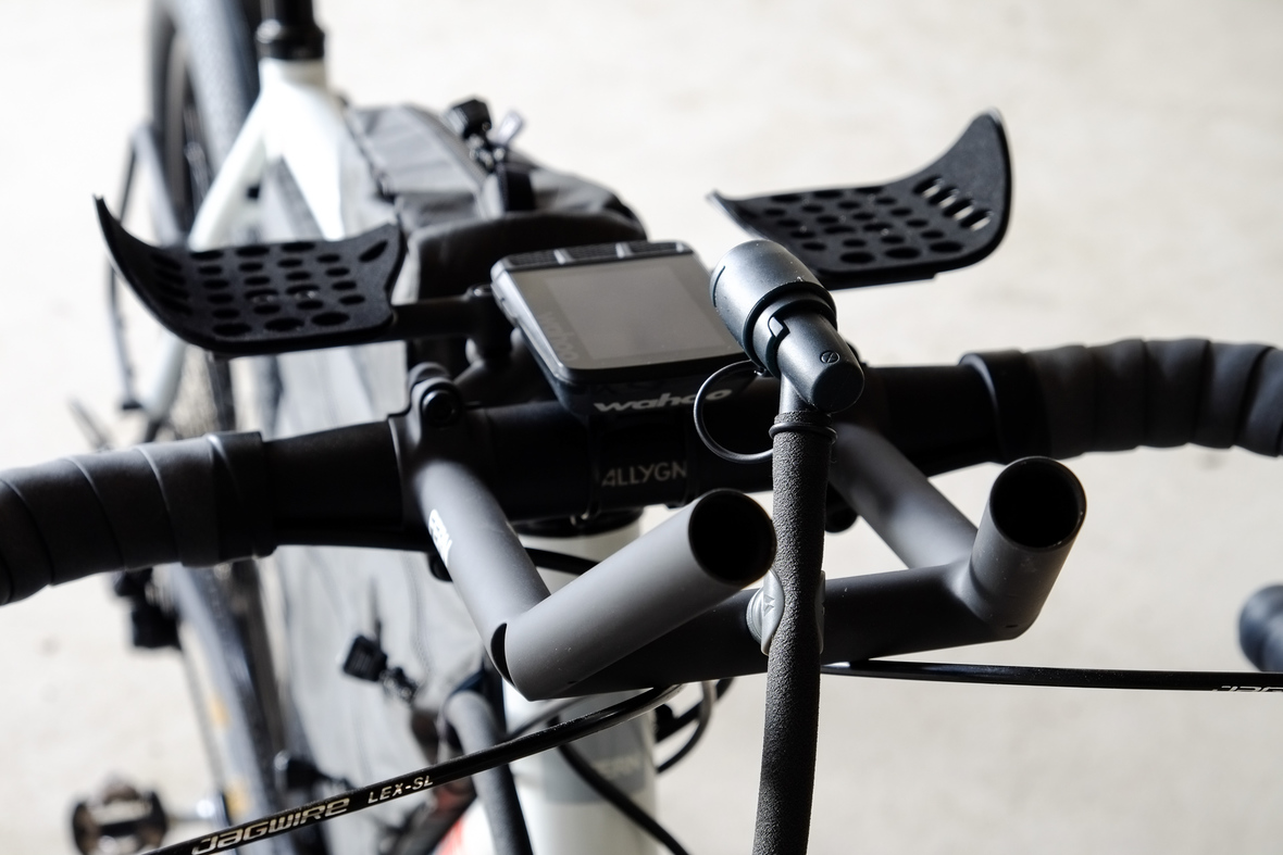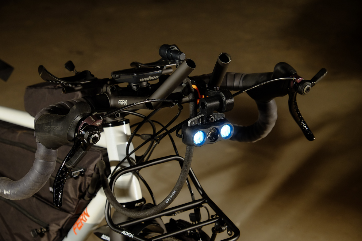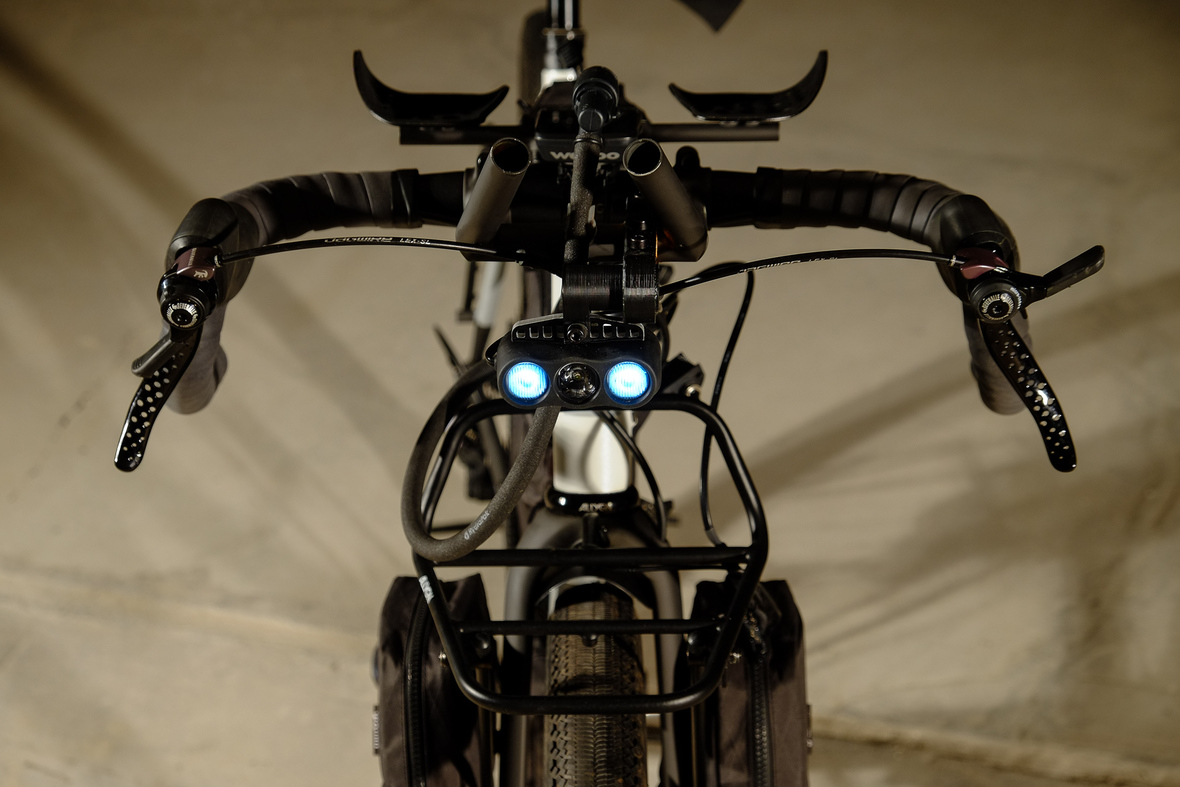 Probably the most exciting feature on this bicycle is the fully adaptable driver orientatet cockpit which features a Stem-Aerobar-Combo which is also fully removable for normal offroad riding. The Aerobar has an inegrated magnetic waterhose holder which is attached to a hydra pack inside the framebag. The Slinghot stem design allows you to position your GPS device in the perfect center handlebar position. Aerobar crossbar allows to mount additional devices such as the amazing K-Lite Bikepacker headlights for example.