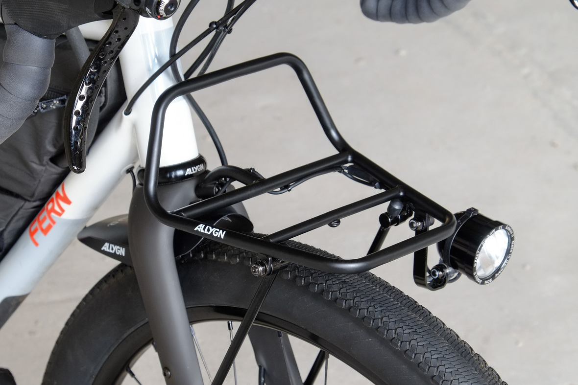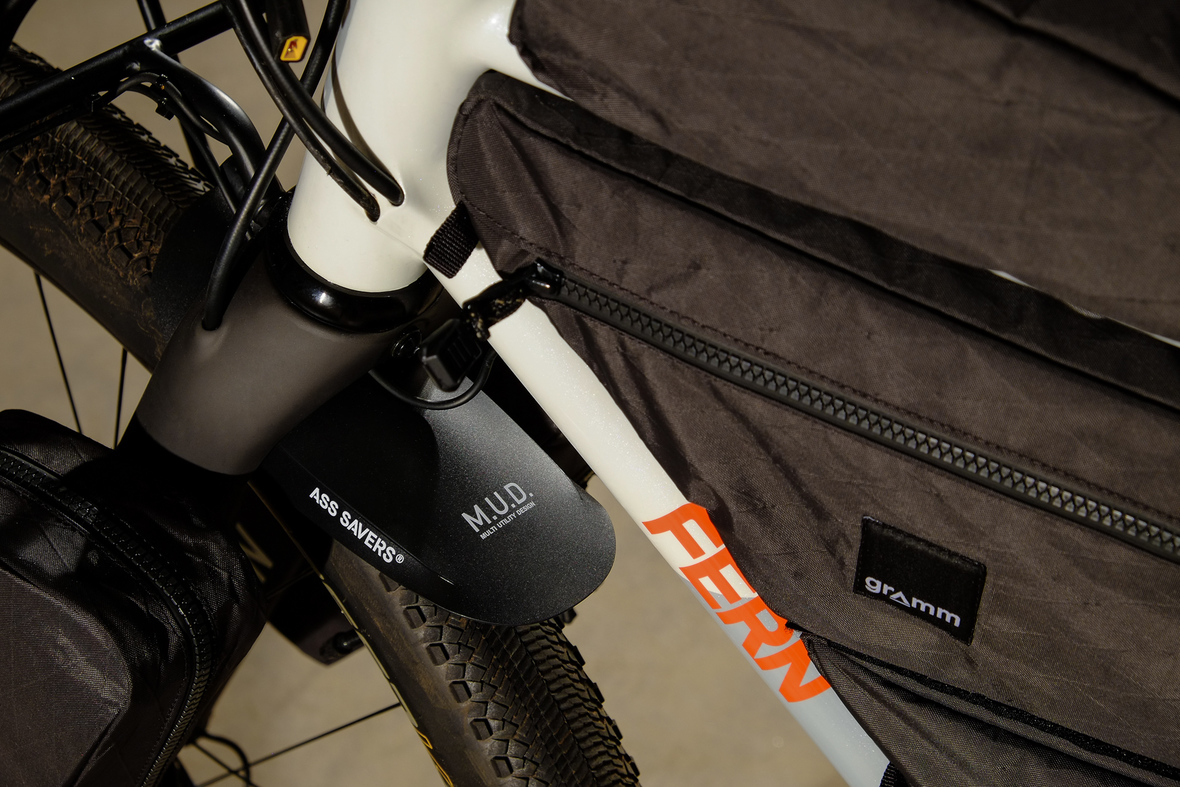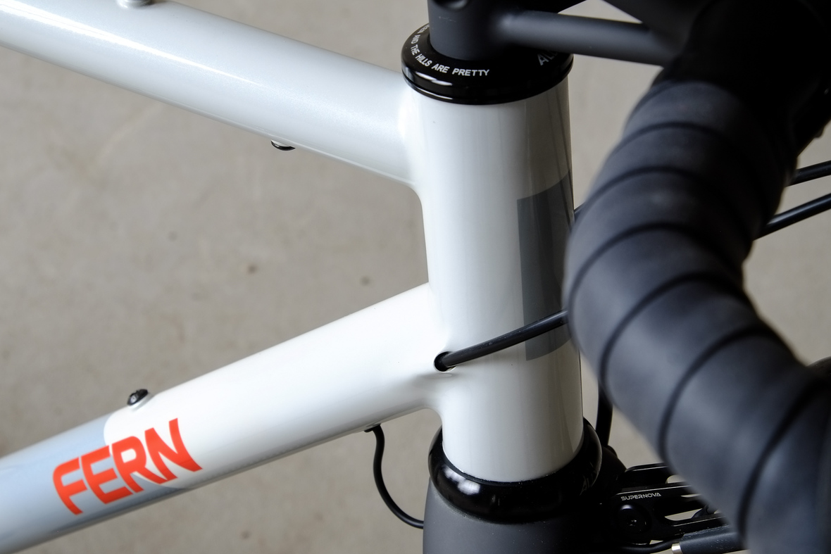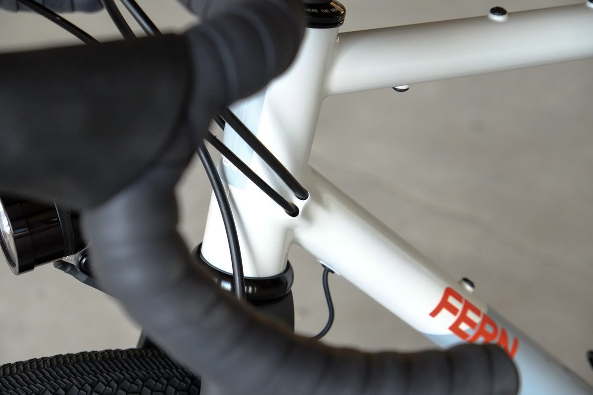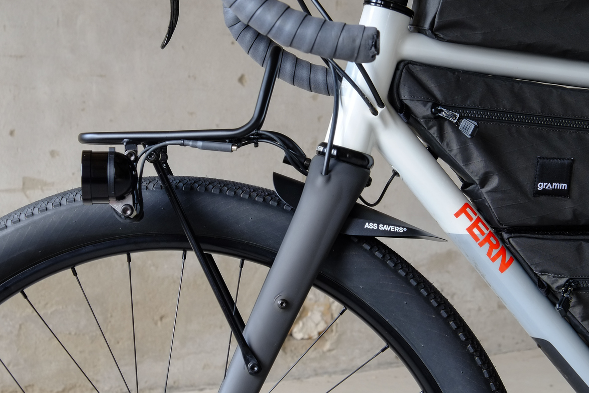 This bike features a fillet brazed frame made only from the finest ultra thin walled Columbus tubing, full internal cable routing and Fern's own 160mm direct flatmout standard. The bike is equipped with our brand new framebuilder owned component company ALLYGN Diamond frontrack, which will be availble in a limited edition bundle including a Gramm Tourpacking strap and a cust om Allygn X Ass Savers Mudder Mini front fender now! Check out ALLYGN for more infos!