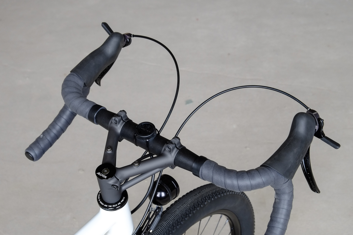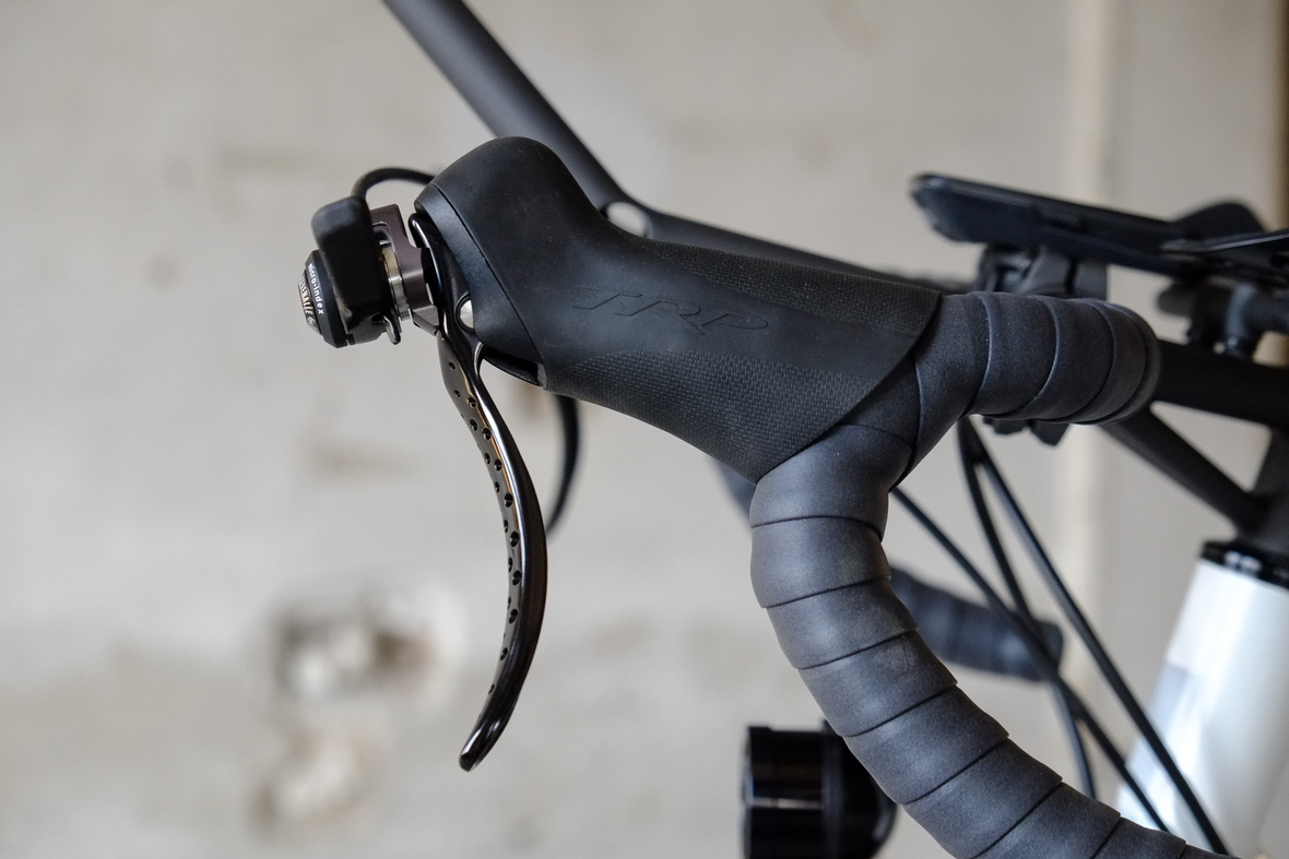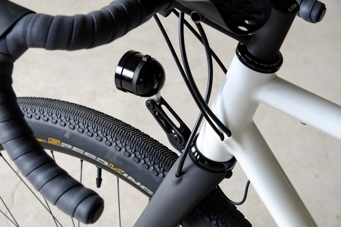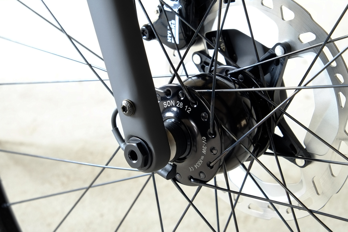 Wide range 1x12sp shifting is provided by our friends at Gevenalle, shifters mounted to TRP Hylex Hydraulic brakes. Left shifter for One-Up dropper seatpost actuation! Superlight wheelset with Stan's no tubes Crest Rims, Conti Speedkings for speed on and off the roads. Power supply and lights by SON. Comfy contact points bei ESI and Tune.