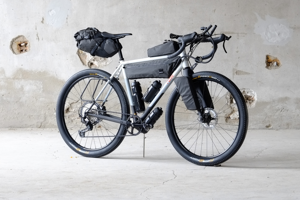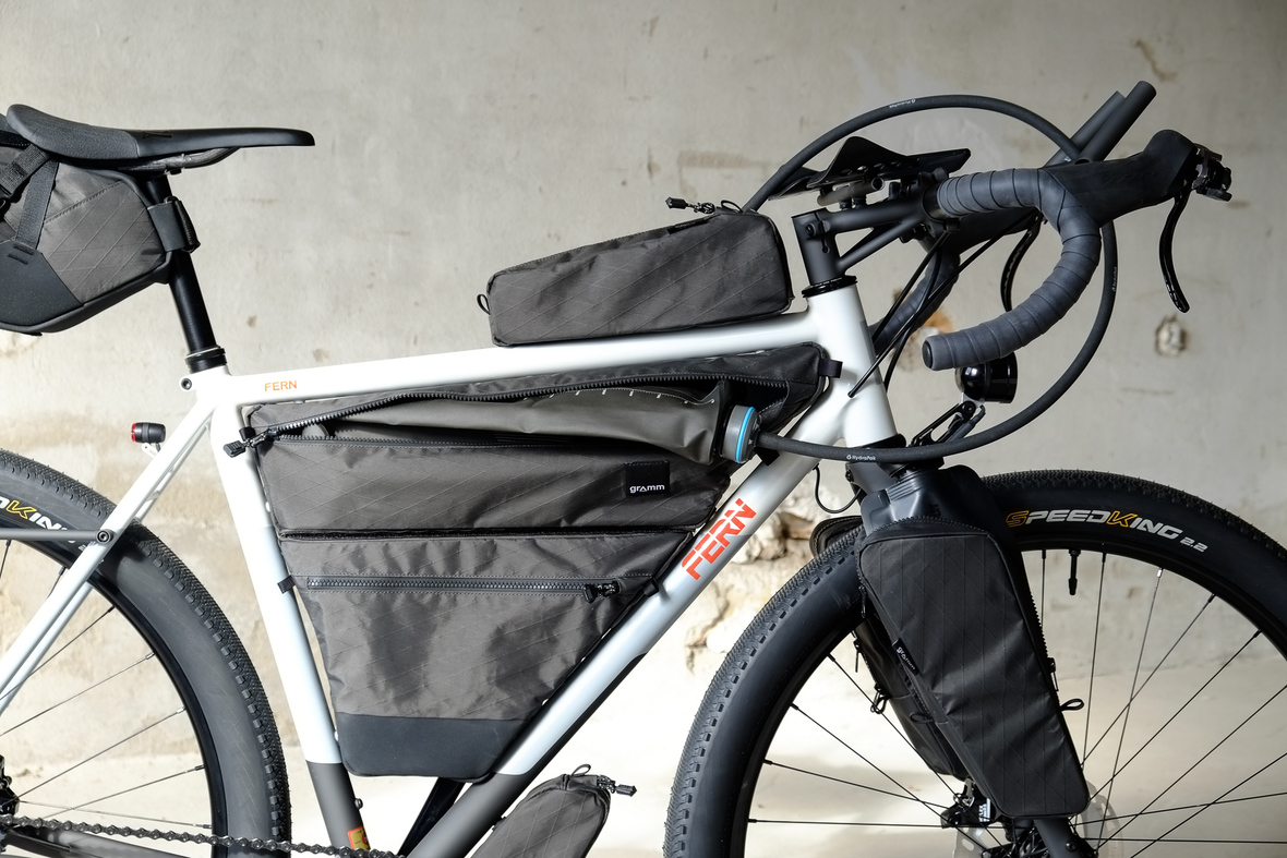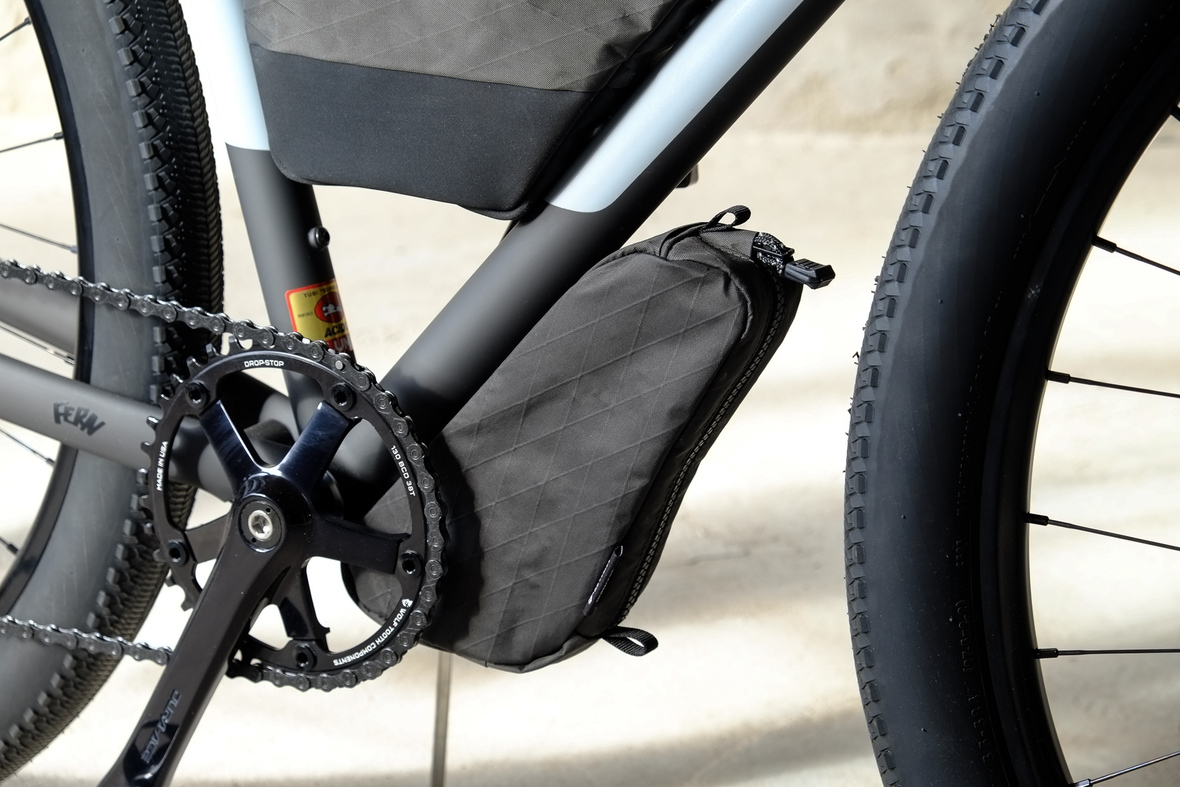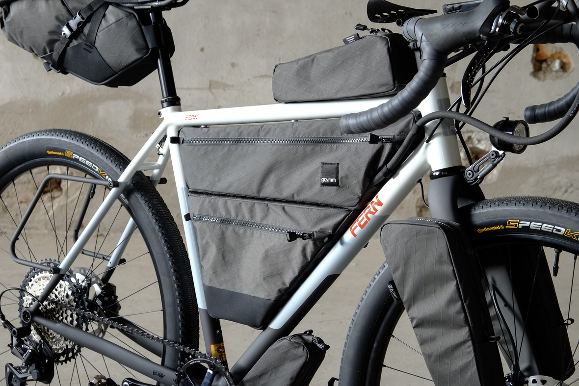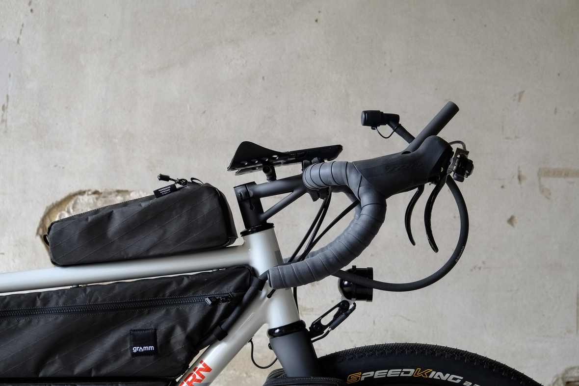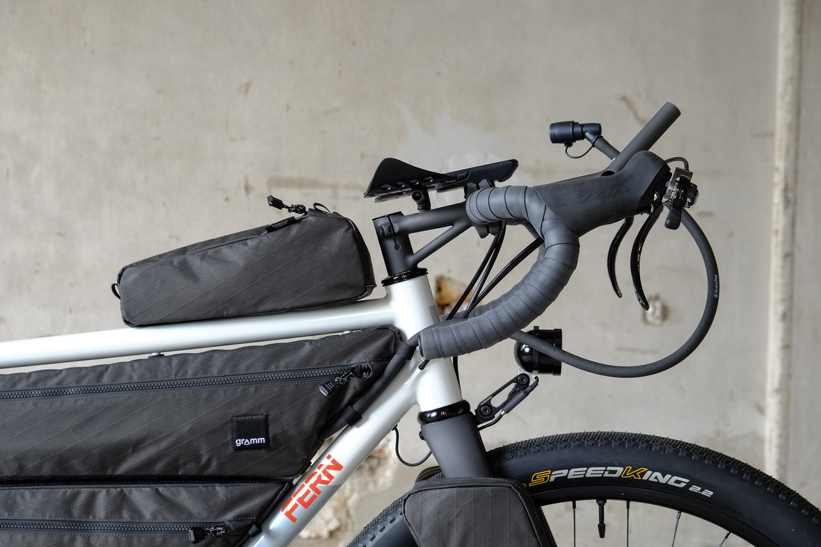 The bike also features the complete package of custom Gramm Tourpacking bags perfectly matching the design and lines of this bike. Bolt on Dual Framebag, custom designed Dropper Seat Bag, bolt on Top Tube Bag, special under downtube bag, and the brand new Gramm Anything Bags!