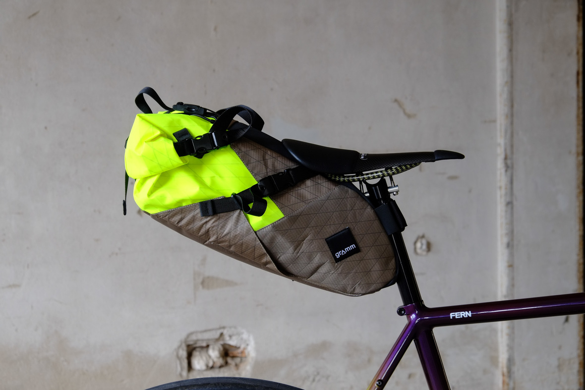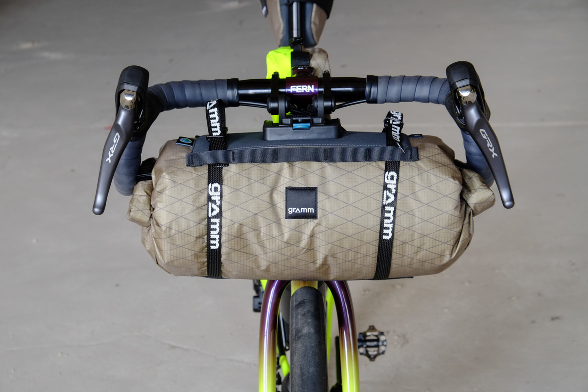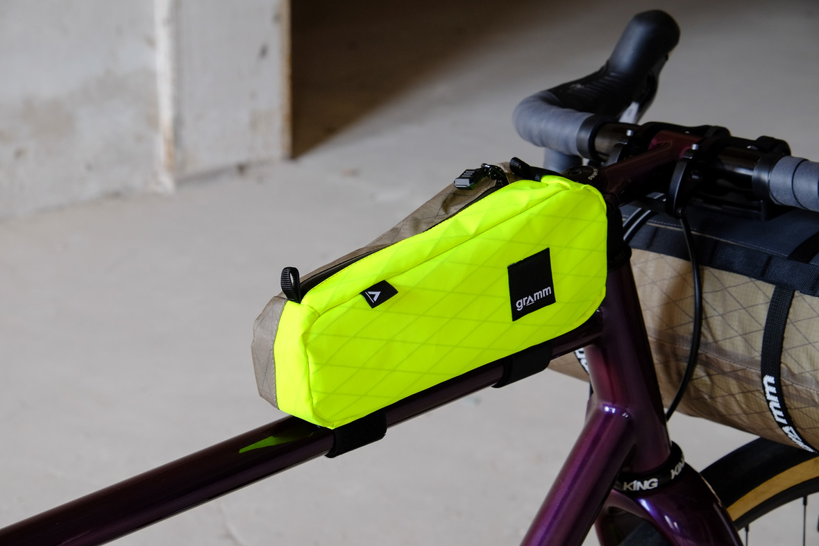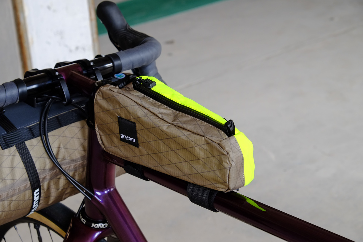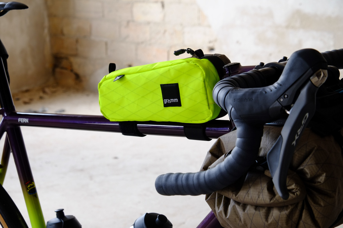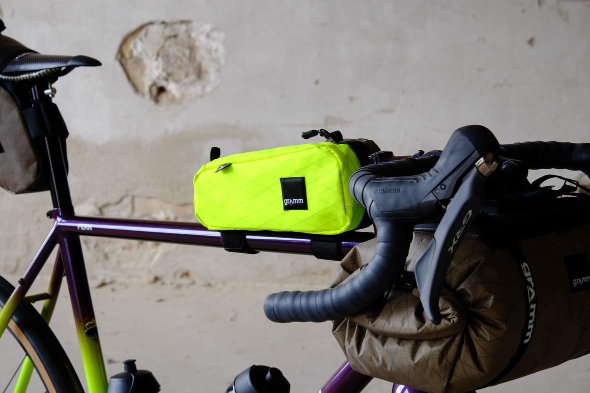 The bags Kristin from Gramm Tourpacking created for this bike are just amazing and feature a custom two-face top tube bag, matching seatbag and handlebar roll.
