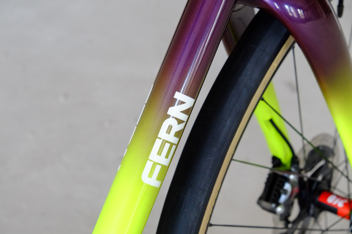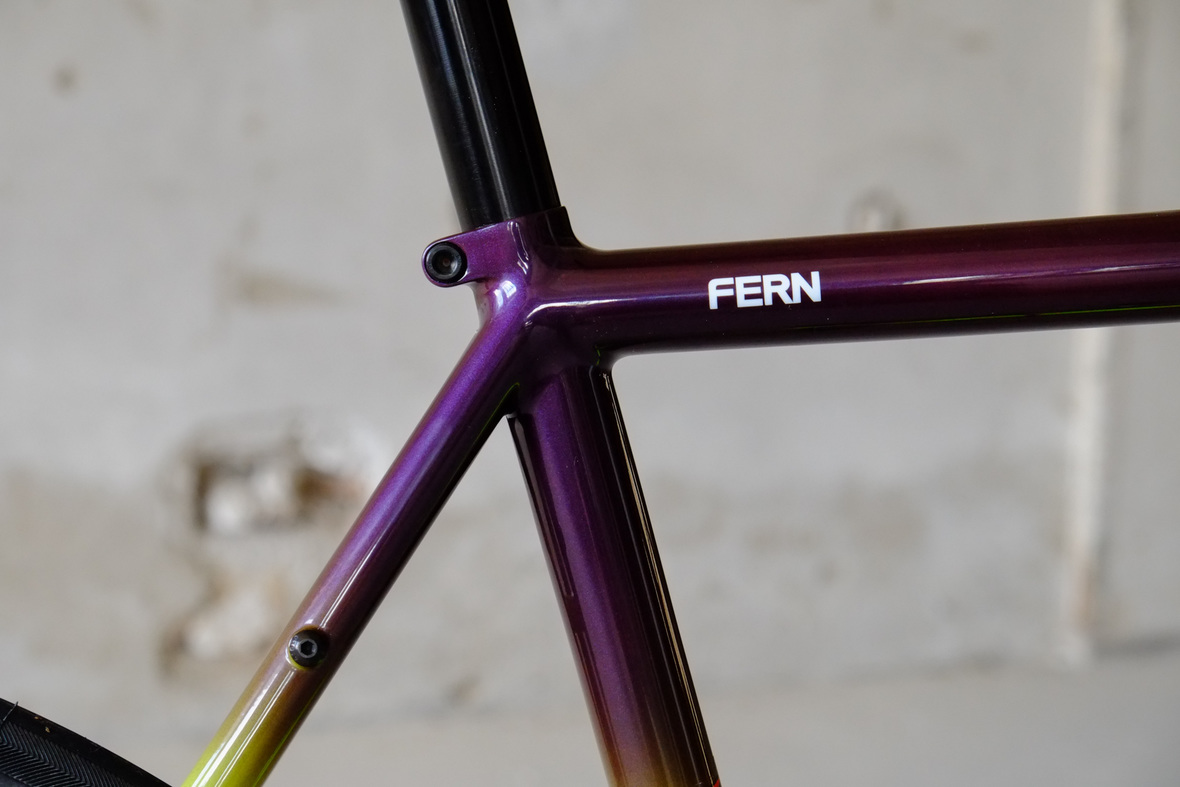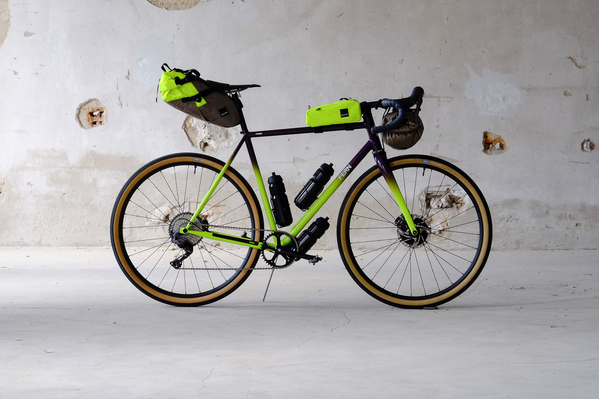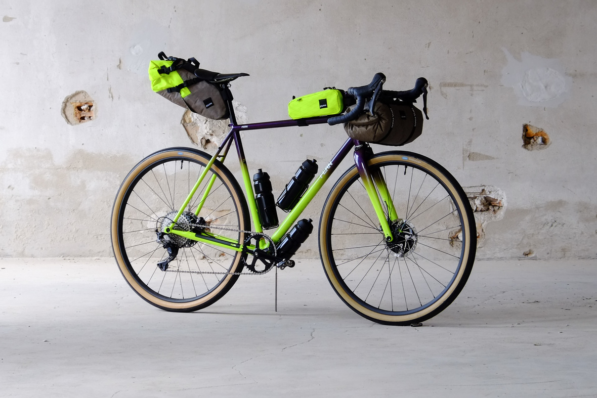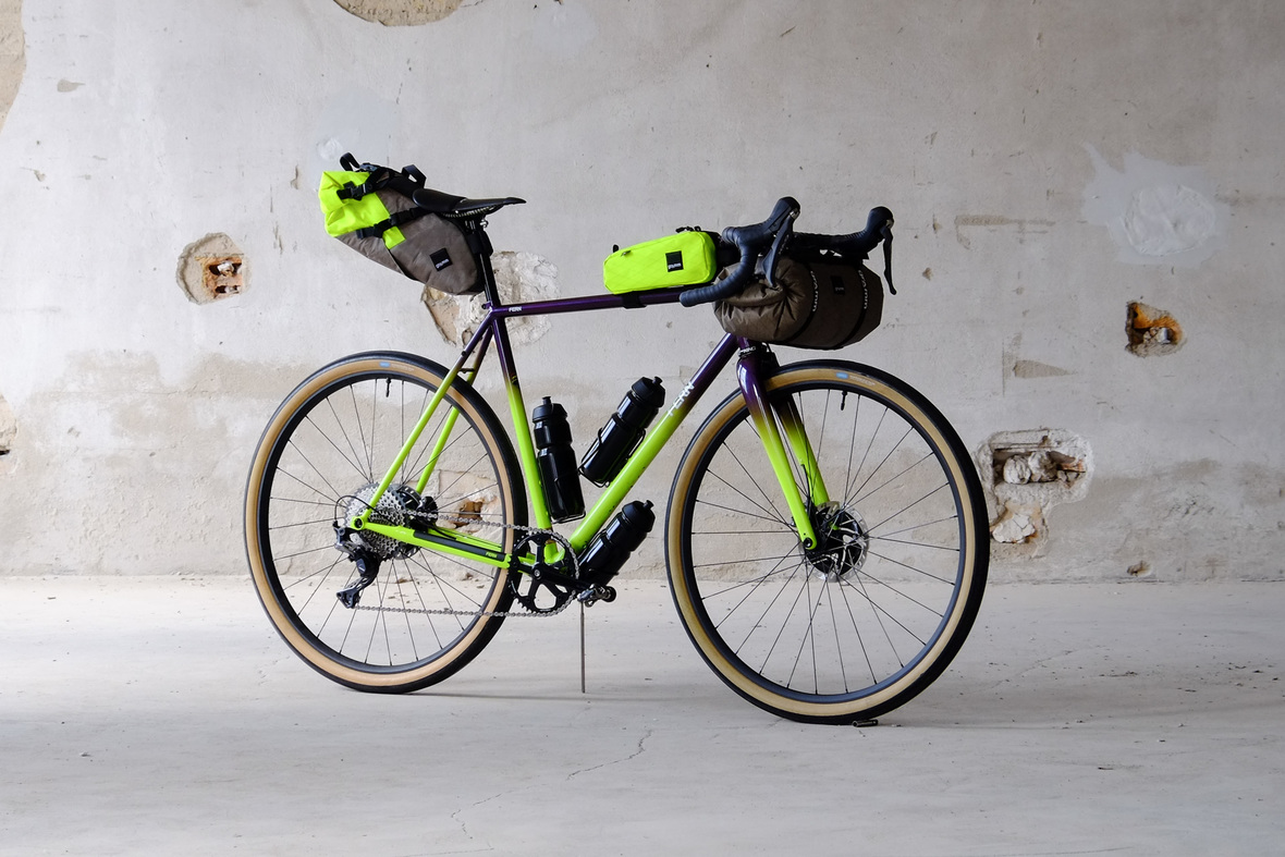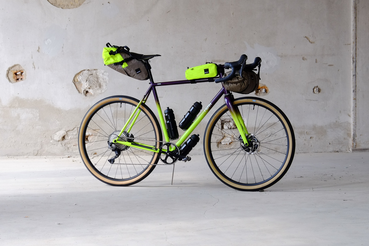 The bags Kristin from Gramm Tourpacking created for this bike are just amazing and feature a custom two-face top tube bag, matching seatbag and handlebar roll.
