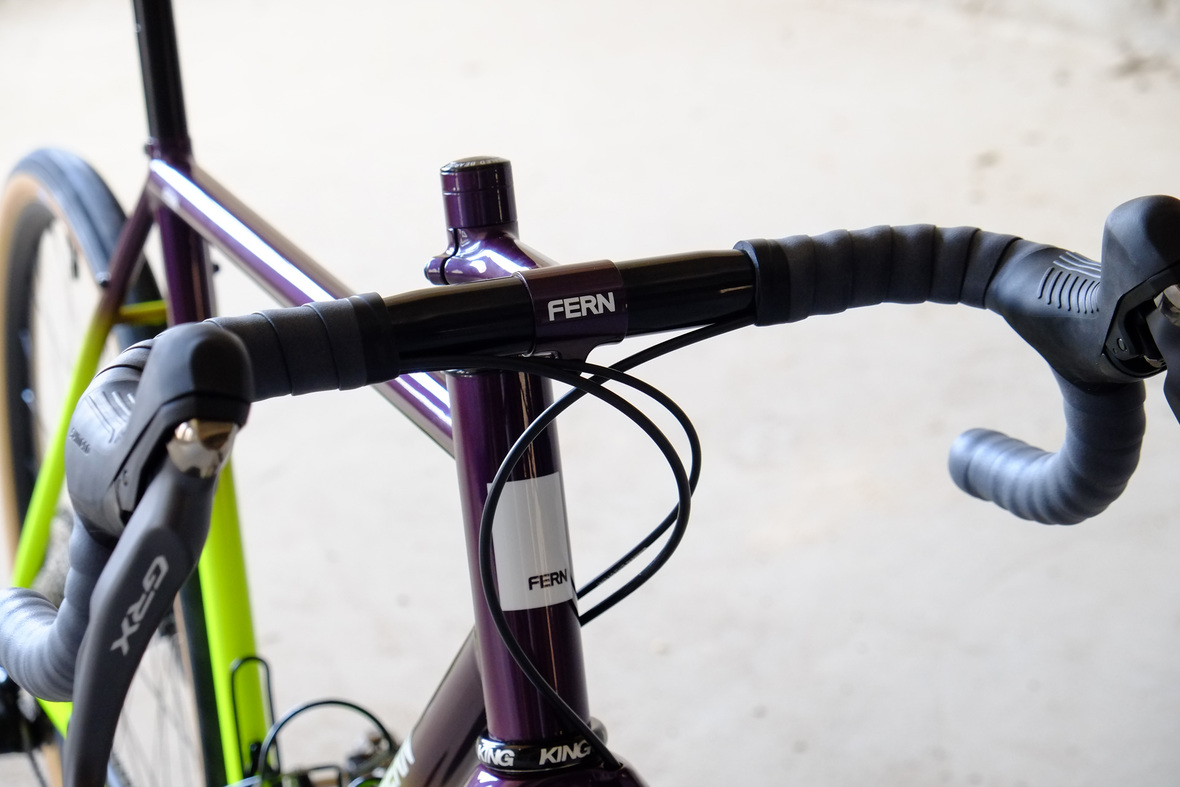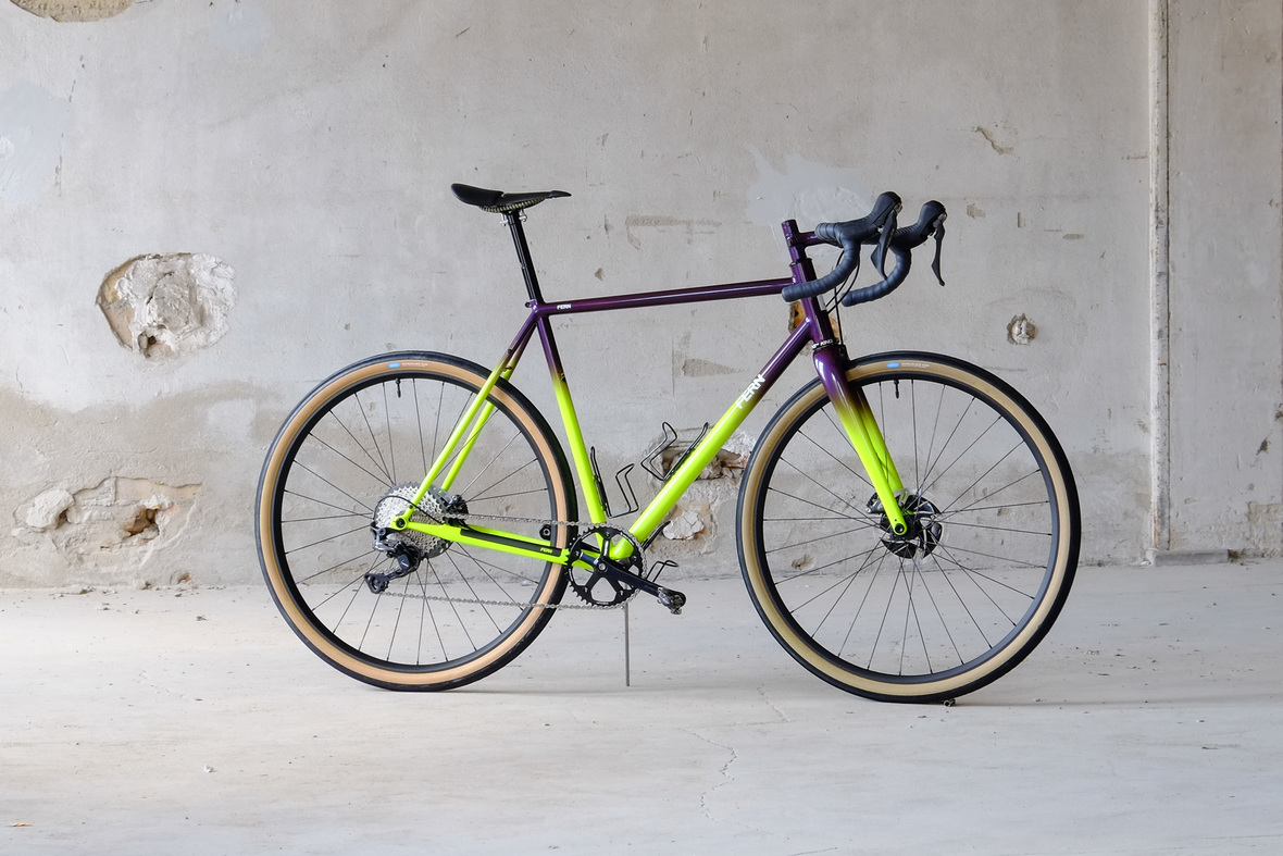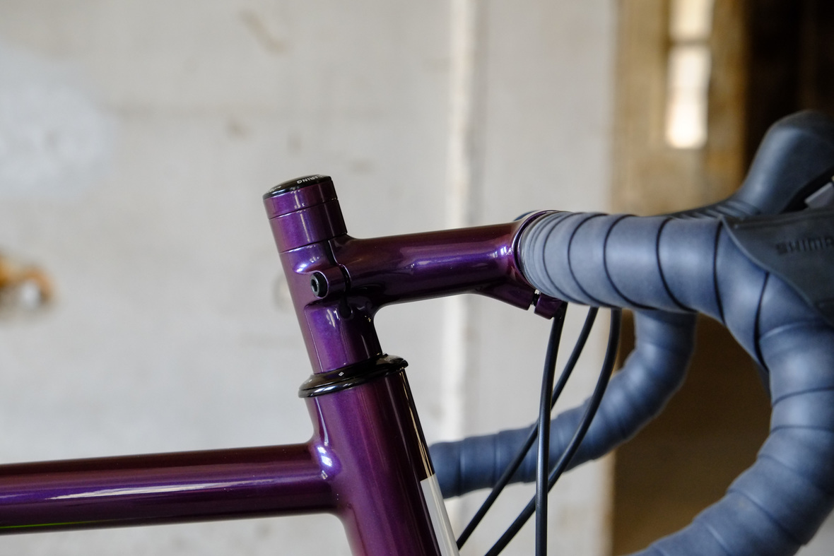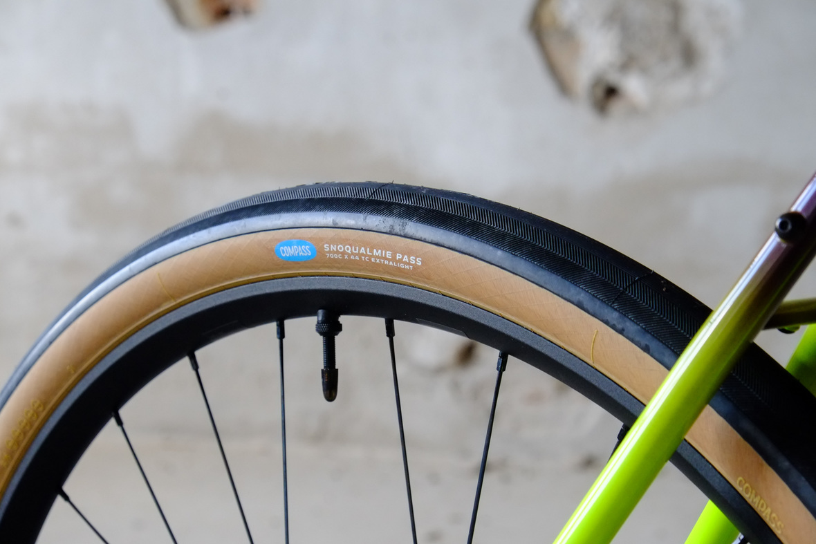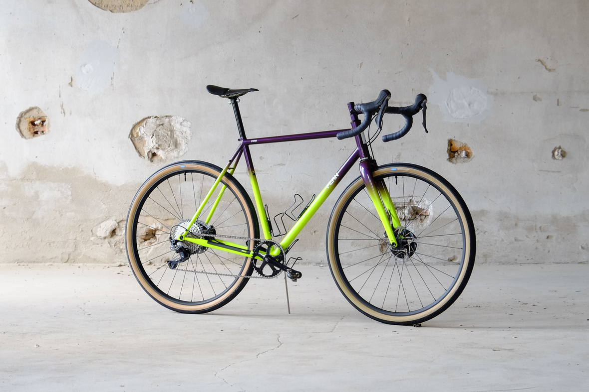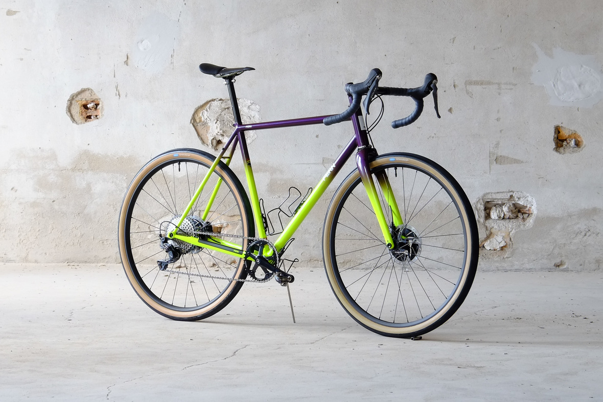 Smooth and super fast rolling on Rene Herse 700cx44mm Snoqalmie tires, Shimano GRX drivetrain is pimped up with our signature vintage Dura Ace crankset and BB, additional super light parts made by Tune bringing down the weight of this beast to 9.3kg!