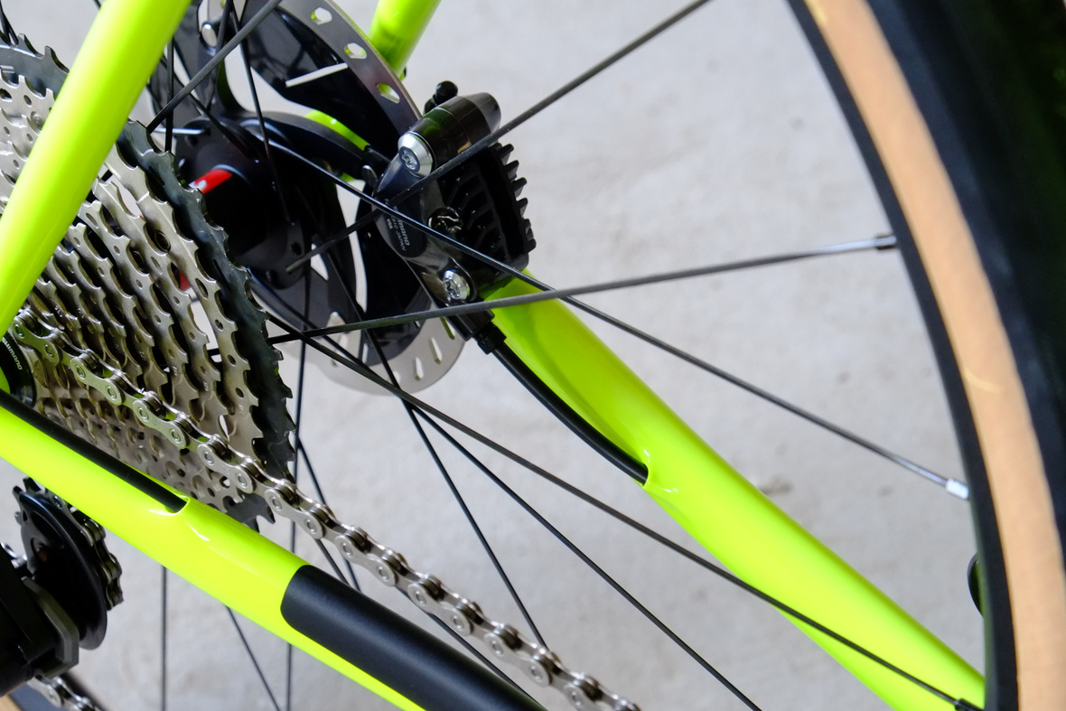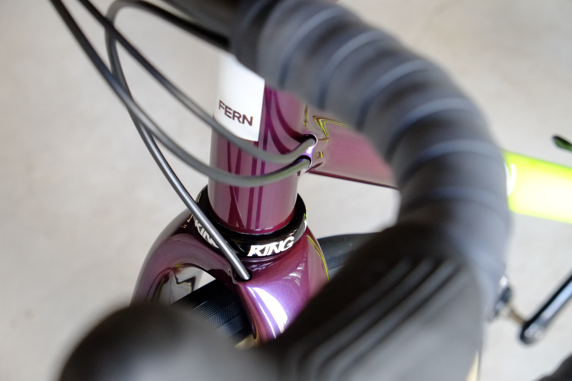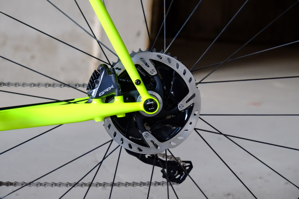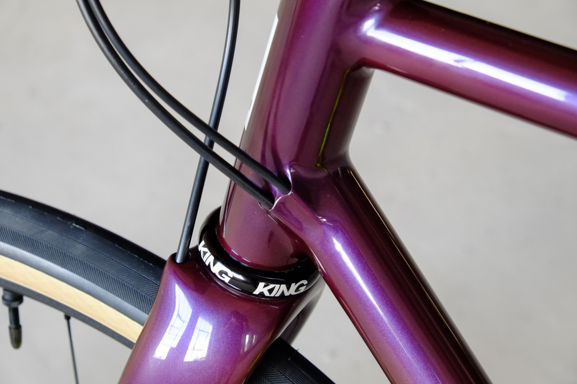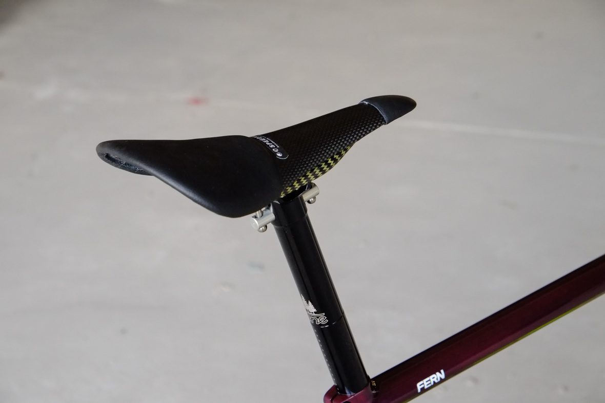 Smooth and super fast rolling on Rene Herse 700cx44mm Snoqalmie tires, Shimano GRX drivetrain is pimped up with our signature vintage Dura Ace crankset and BB, additional super light parts made by Tune bringing down the weight of this beast to 9.3kg!