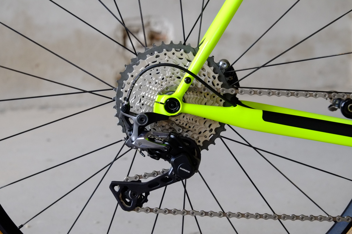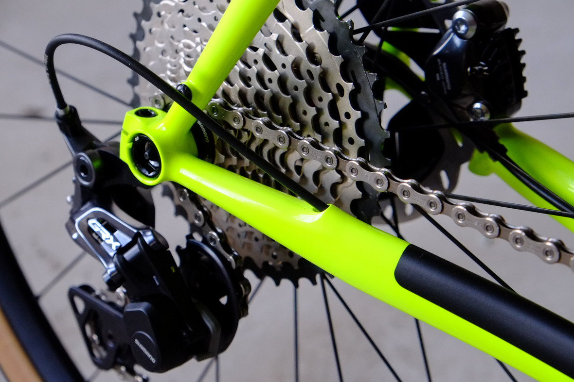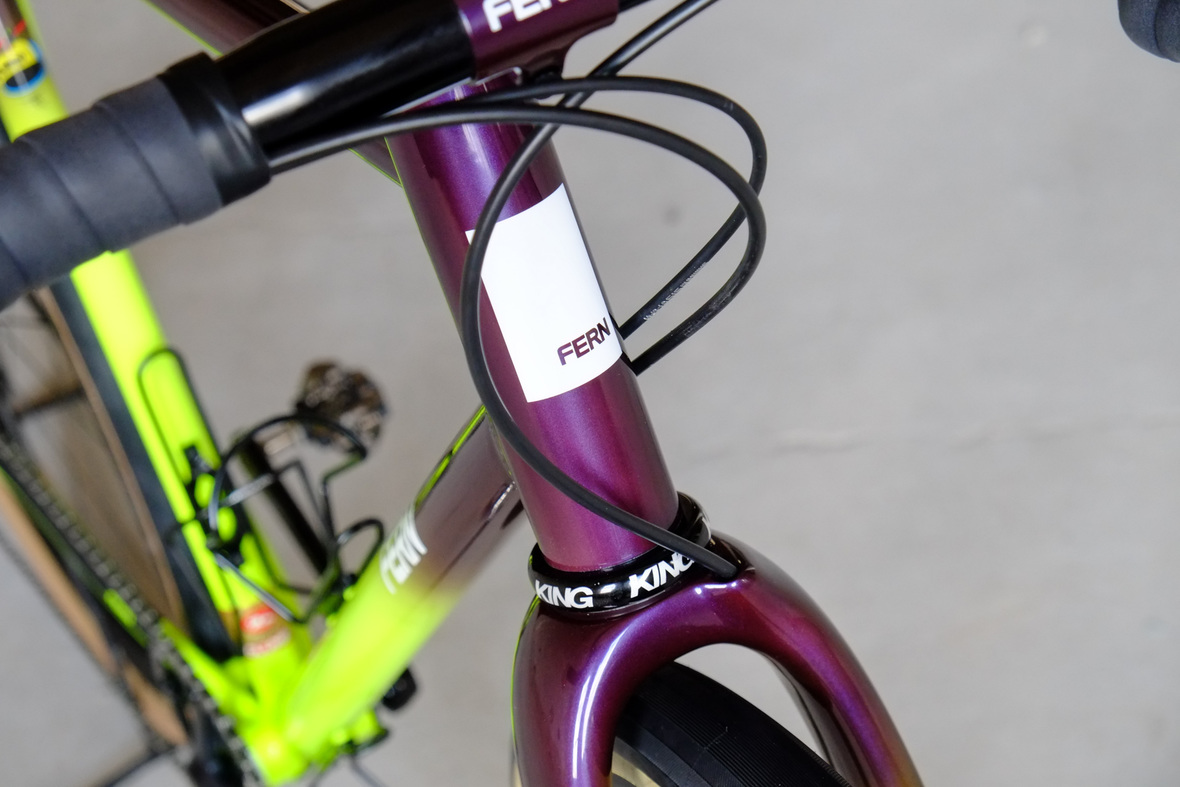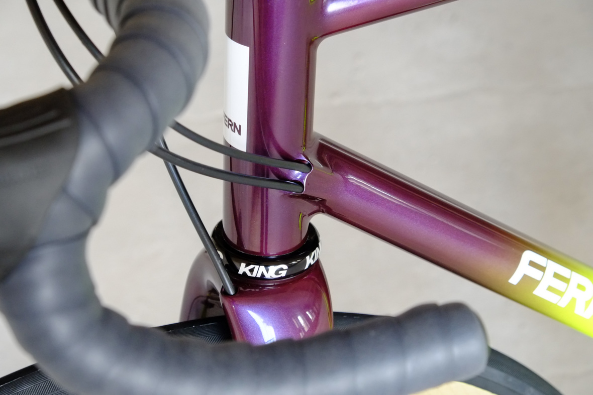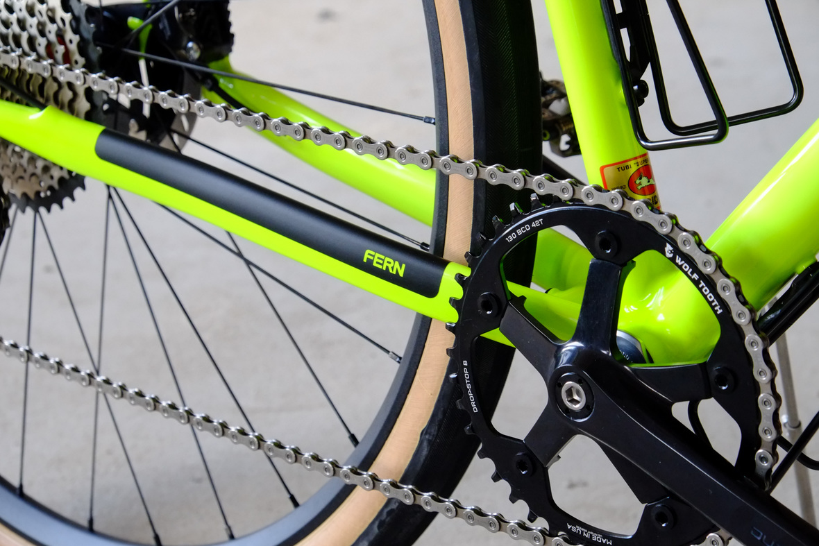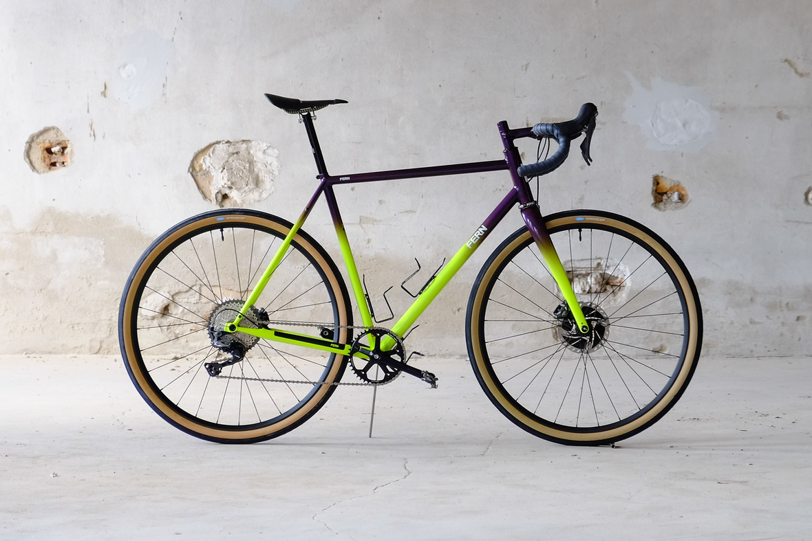 Smooth and super fast rolling on Rene Herse 700cx44mm Snoqalmie tires, Shimano GRX drivetrain is pimped up with our signature vintage Dura Ace crankset and BB, additional super light parts made by Tune bringing down the weight of this beast to 9.3kg!