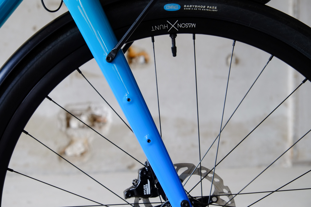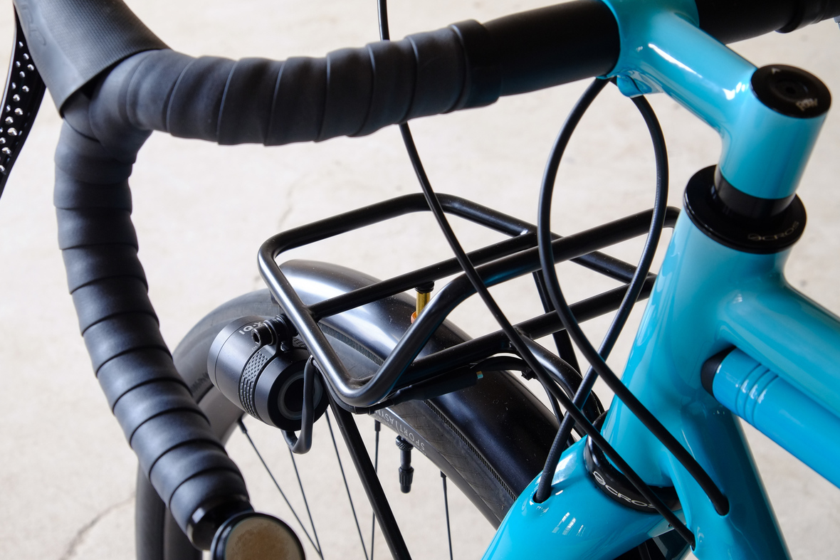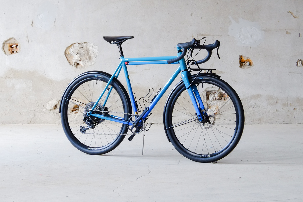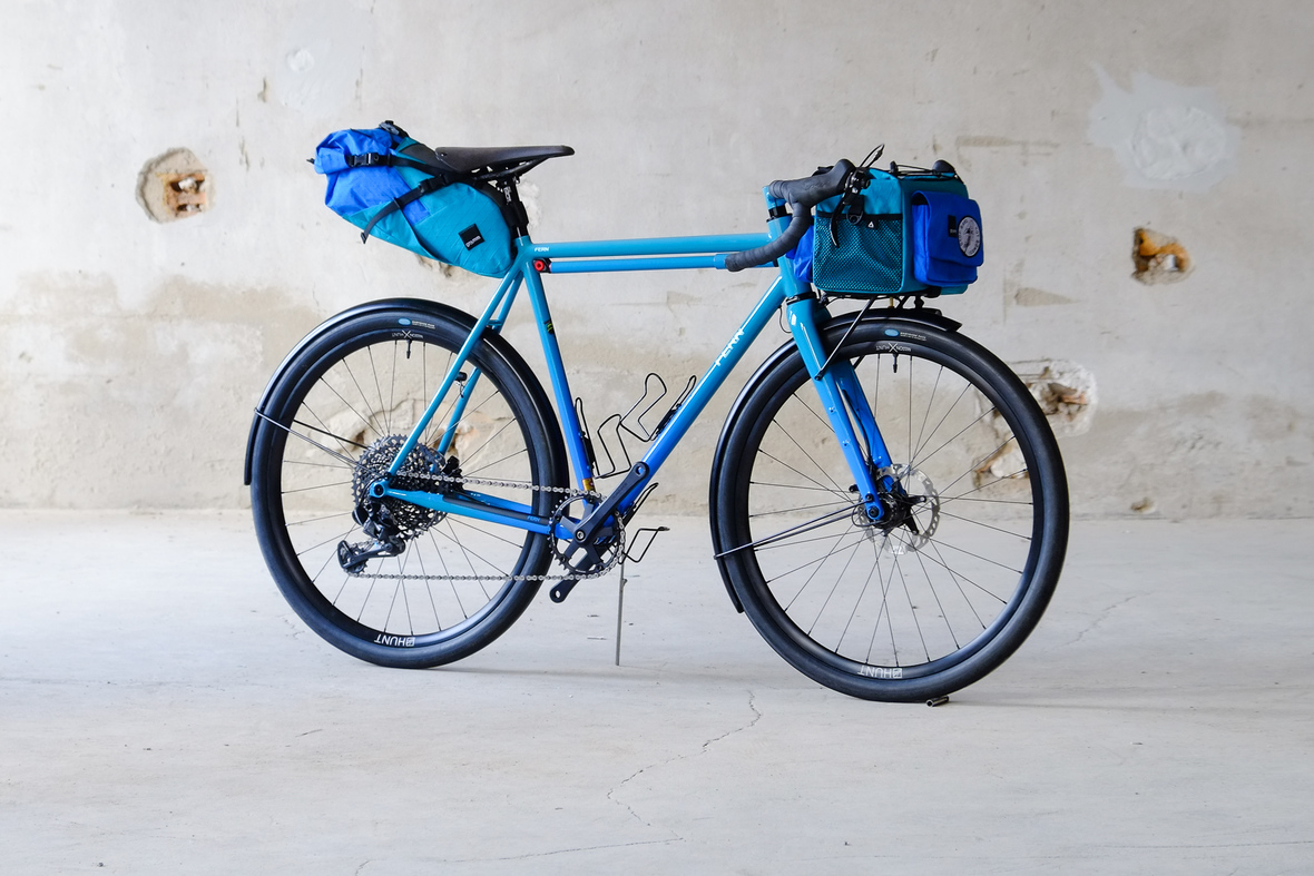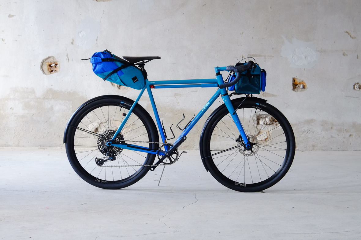 This is Daniel's finalized 650B Disc Chico, which he already successfully raced in a prototype state in the 2019 PBP edition. The bike is equipped with a prototype Allyn Components M.U.D. fork and a Allygn Diamond Front Rack. The fillet brazed frame is made only from the finest Columbus tubing and featuring our new 160mm flat direct mount standard on a Syntace X-12 through axle system. Fully internal cable routing. Hydraulic brake and shift action by Gevenalle, 1x12 Sram Eagle drivetrain spun fast with our trademark super low q-factor vintage Dura Ace crankset . Rolling ultra smooth on Hunt Wheels equipped with Rene Herse Baby Shoe Pass tires, mud protection by Velororange. Power supplied by SON deluxe hub dynamo and safety rear view mirror by our friends at Gilles Berthoud. Awesome Gramm Tourpacking bags, percfectly colour matching Velociao's vibrant paintjob.