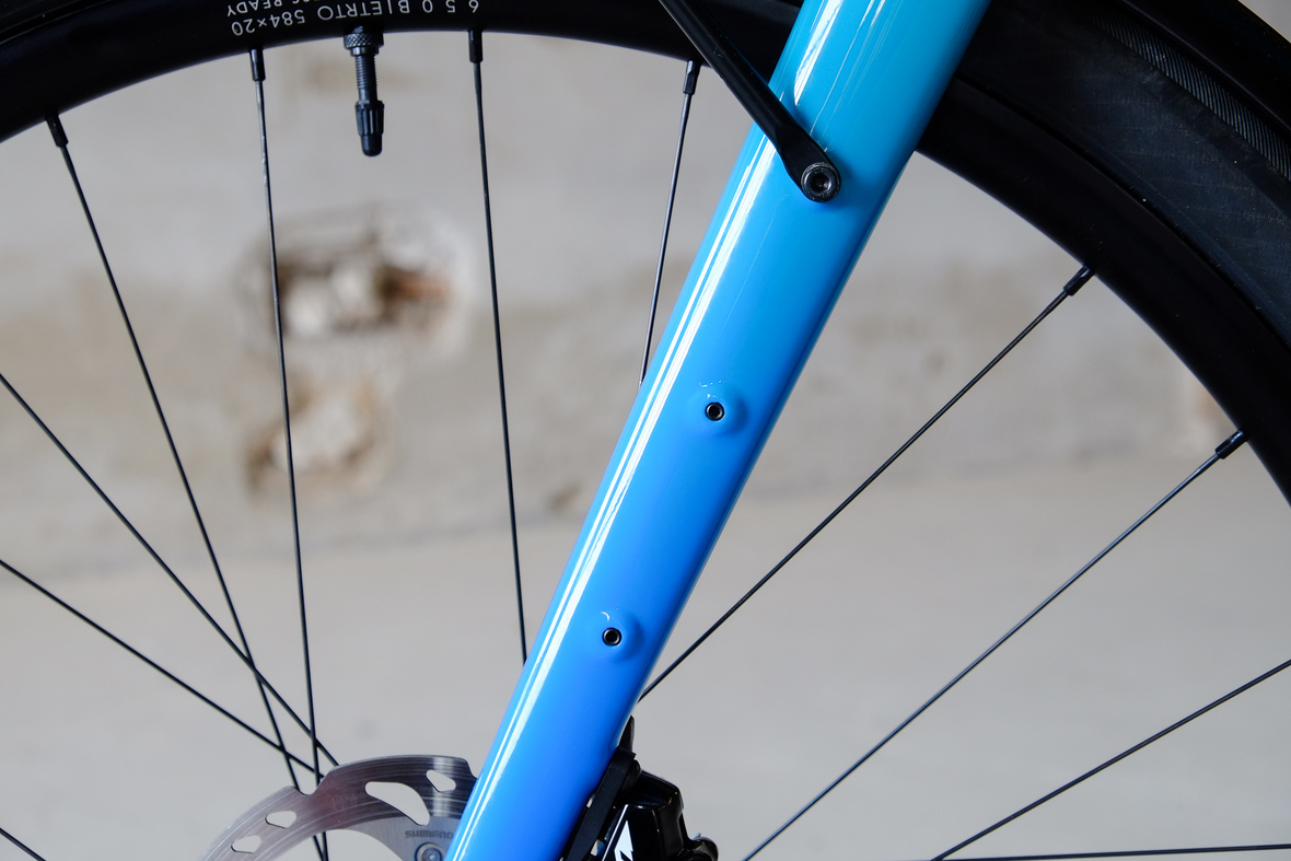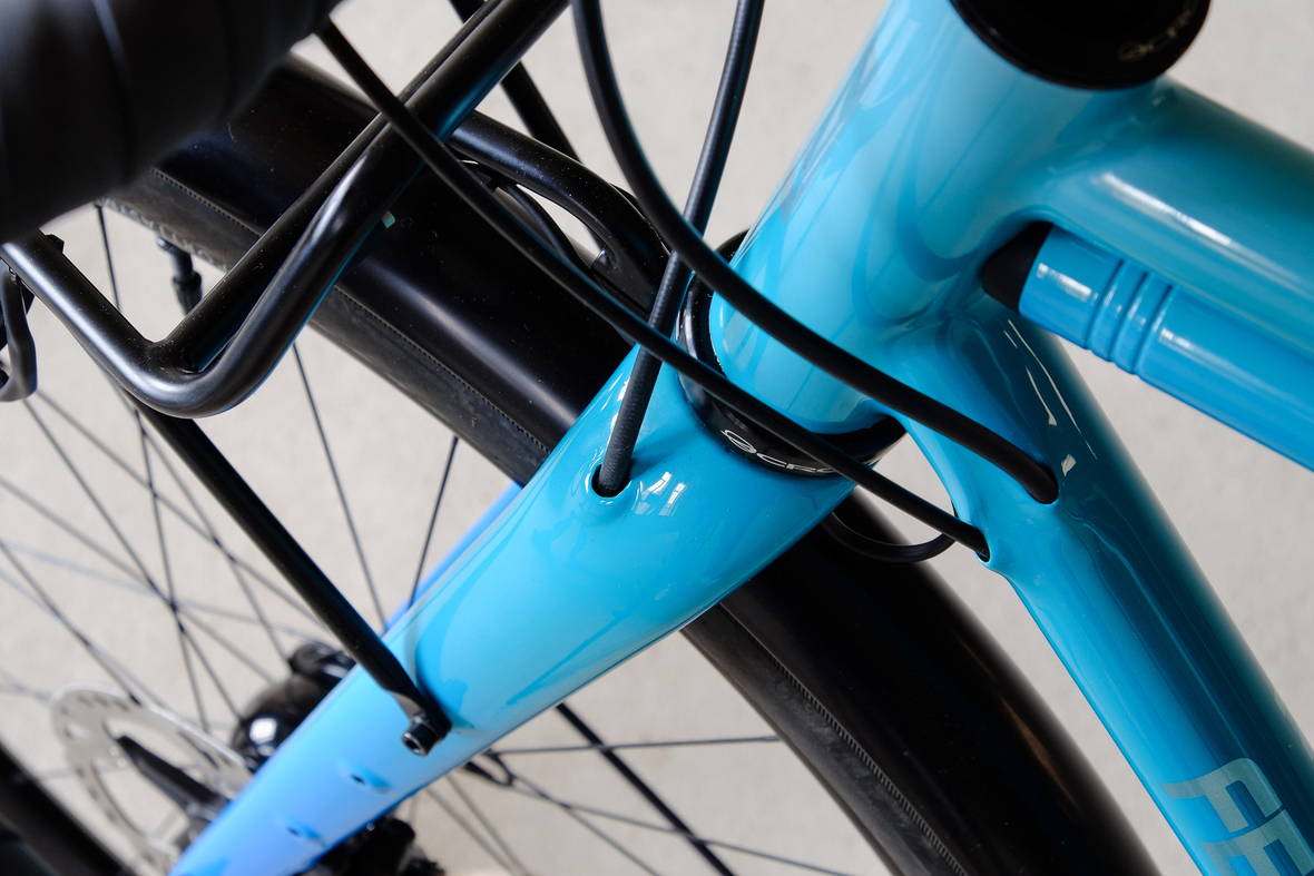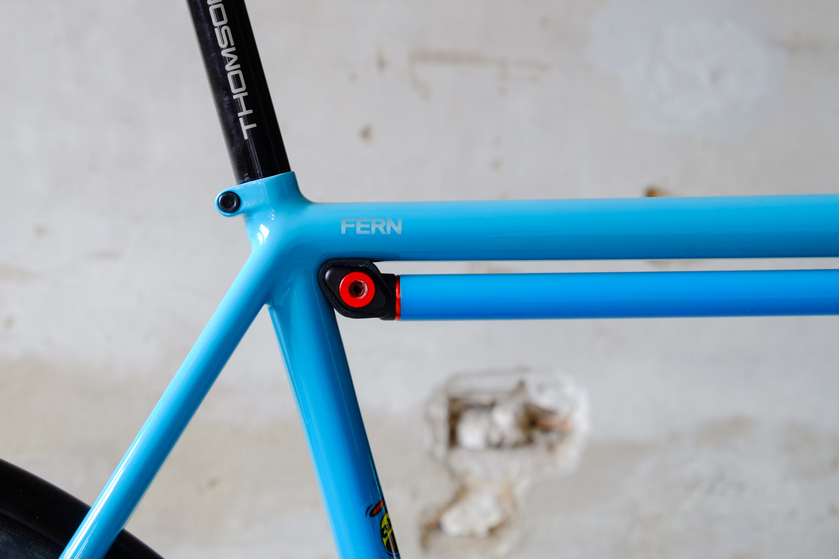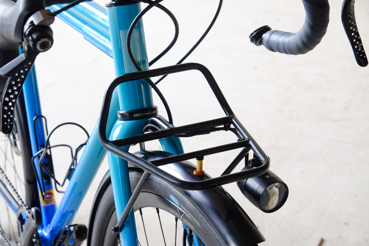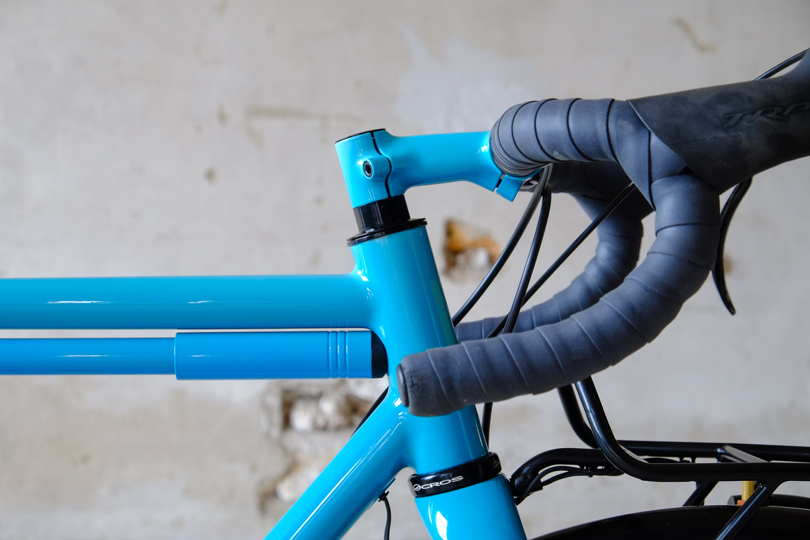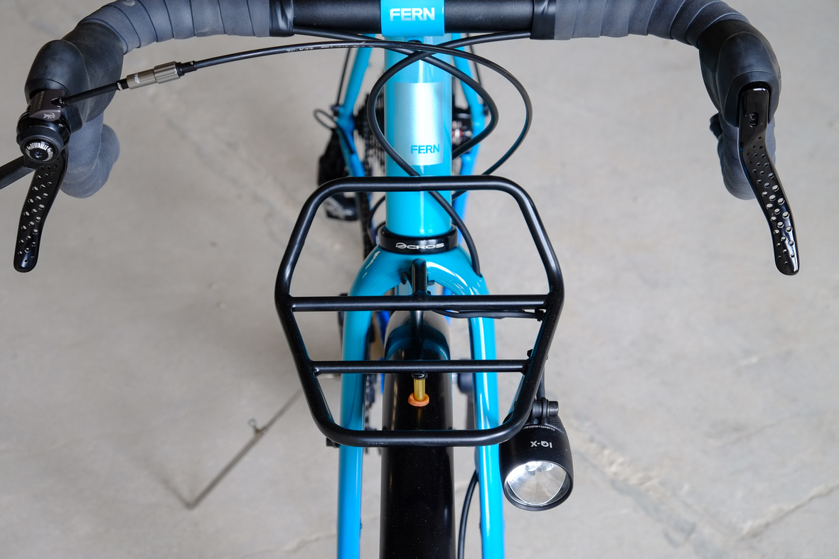 This is Daniel's finalized 650B Disc Chico, which he already successfully raced in a prototype state in the 2019 PBP edition. The bike is equipped with a prototype Allyn Components M.U.D. fork and a Allygn Diamond Front Rack. The fillet brazed frame is made only from the finest Columbus tubing and featuring our new 160mm flat direct mount standard on a Syntace X-12 through axle system. Fully internal cable routing. Hydraulic brake and shift action by Gevenalle, 1x12 Sram Eagle drivetrain spun fast with our trademark super low q-factor vintage Dura Ace crankset . Rolling ultra smooth on Hunt Wheels equipped with Rene Herse Baby Shoe Pass tires, mud protection by Velororange. Power supplied by SON deluxe hub dynamo and safety rear view mirror by our friends at Gilles Berthoud. Awesome Gramm Tourpacking bags, percfectly colour matching Velociao's vibrant paintjob.