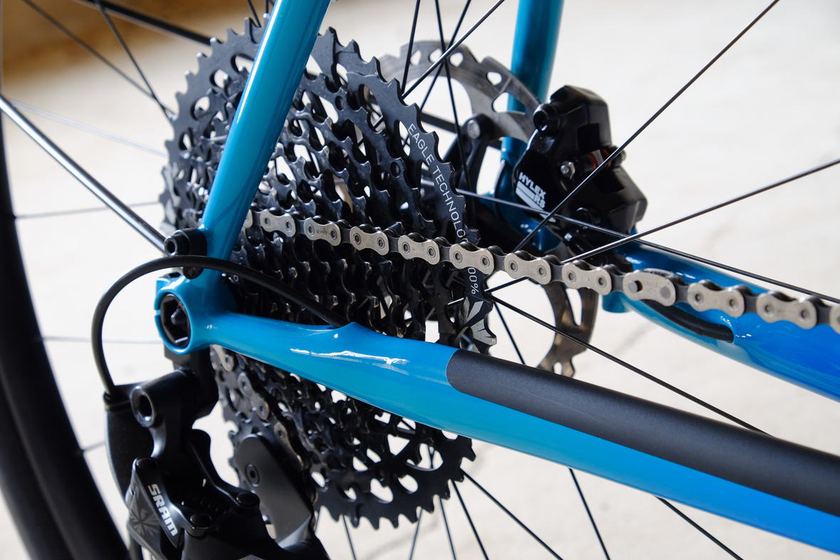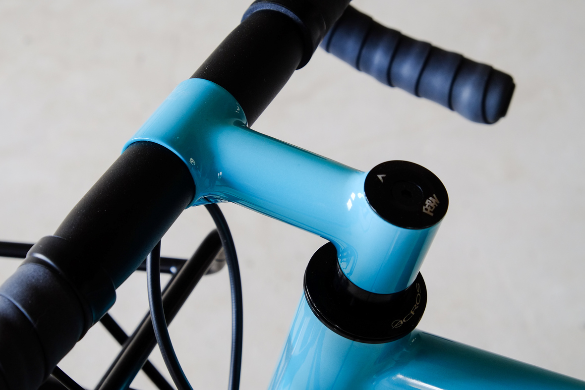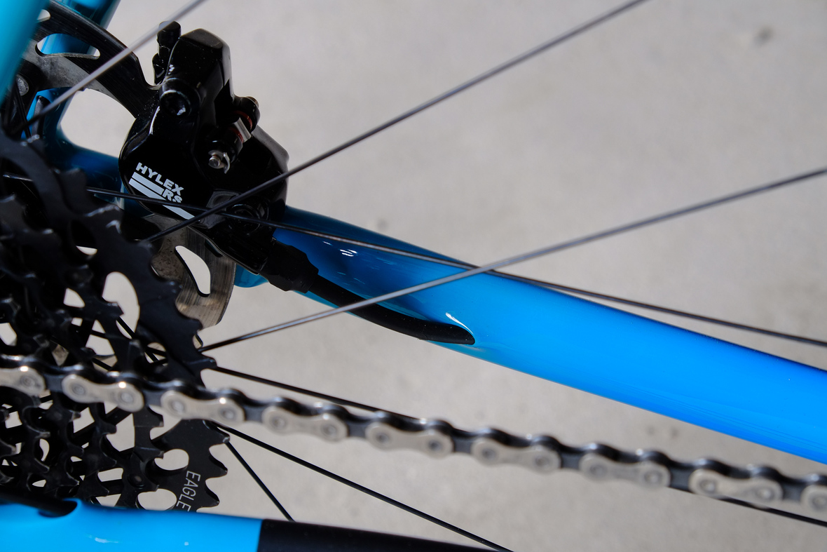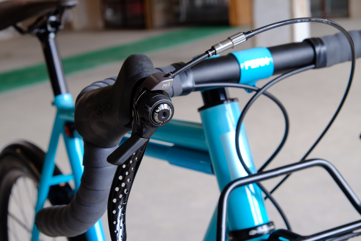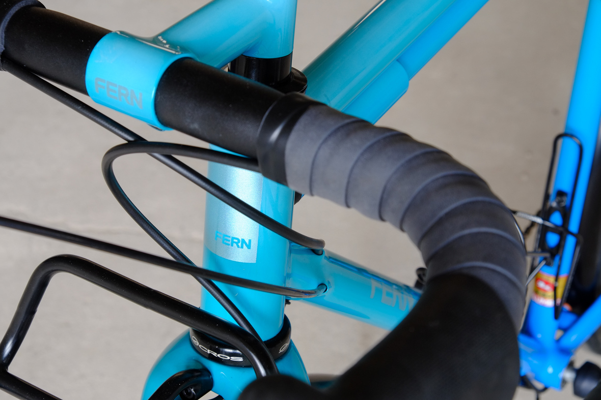 This is Daniel's finalized 650B Disc Chico, which he already successfully raced in a prototype state in the 2019 PBP edition. The bike is equipped with a prototype Allyn Components M.U.D. fork and a Allygn Diamond Front Rack. The fillet brazed frame is made only from the finest Columbus tubing and featuring our new 160mm flat direct mount standard on a Syntace X-12 through axle system. Fully internal cable routing. Hydraulic brake and shift action by Gevenalle, 1x12 Sram Eagle drivetrain spun fast with our trademark super low q-factor vintage Dura Ace crankset . Rolling ultra smooth on Hunt Wheels equipped with Rene Herse Baby Shoe Pass tires, mud protection by Velororange. Power supplied by SON deluxe hub dynamo and safety rear view mirror by our friends at Gilles Berthoud. Awesome Gramm Tourpacking bags, percfectly colour matching Velociao's vibrant paintjob.