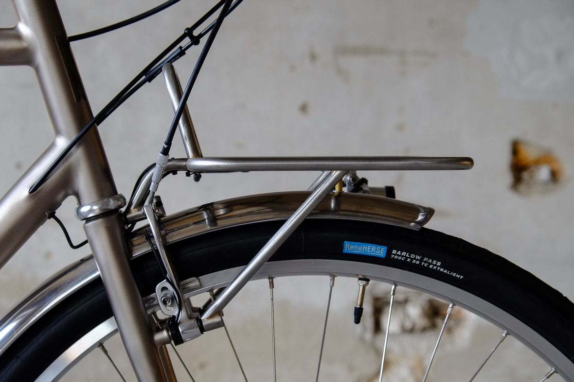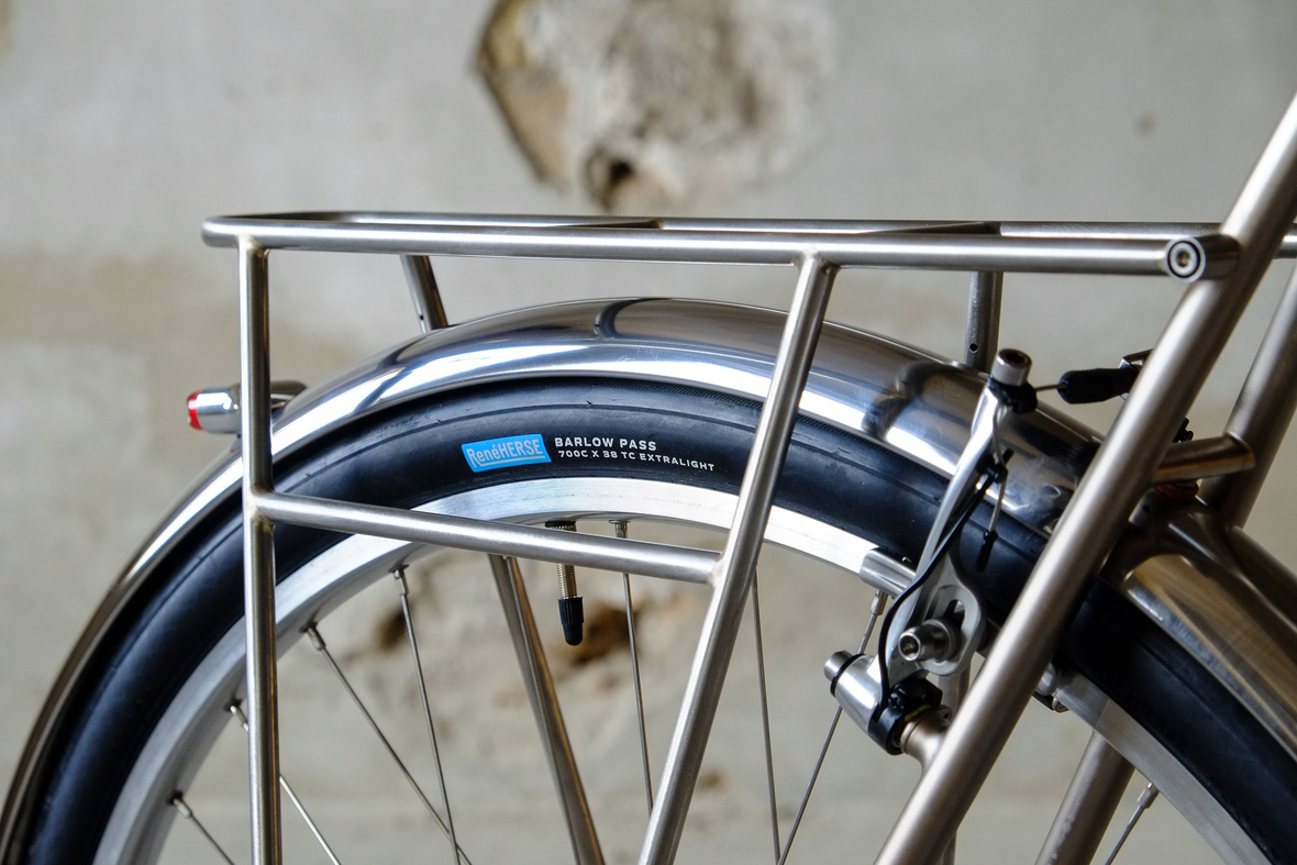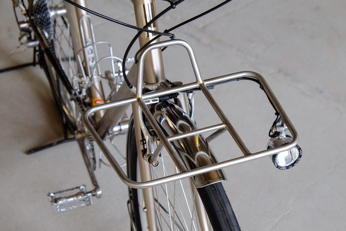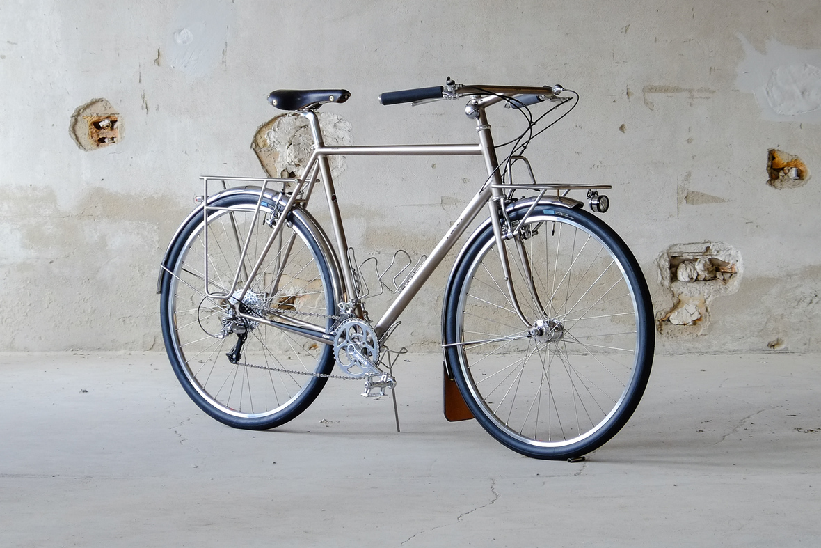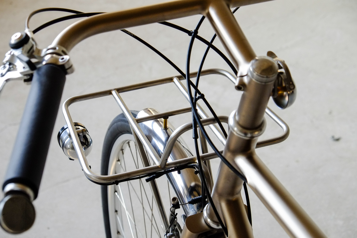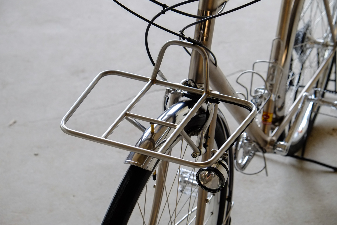 Wolfgang came quite a while ago into our workshop and he was looking for a trekking bicycle. After showing him pictures of classic Rene Herse and Alex Singer porteur style bicycles he was on fire with the idea of building a modern interpretation of this classic bicycle concept. Wolfgang put big trust into us and gave us complete freedom to do whatever we thought was right to put his dream on to two wheels. So we designed a special geometry for this wonderful nickel coated frame and fork which is made from the best Columbus tubing. We did not like the shapes of existing handlebars, so we decided to create our own handelbar stem combo, combining classy optics with perfect ergonomics. Many thanks to my man and master framebuilder Wheeldan for tube bending support! Custom made silverbrazed stainless racks for front and rear.