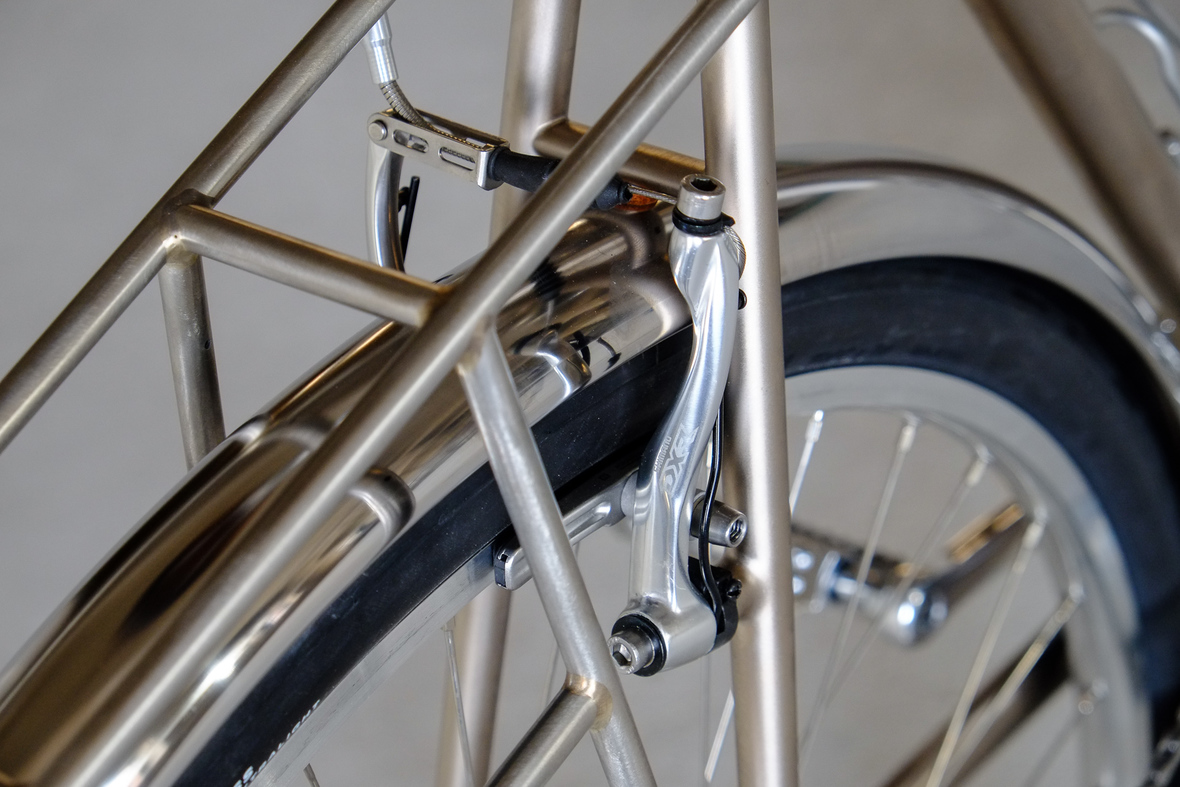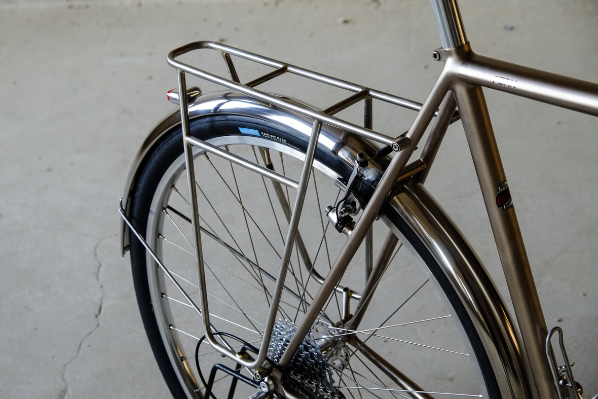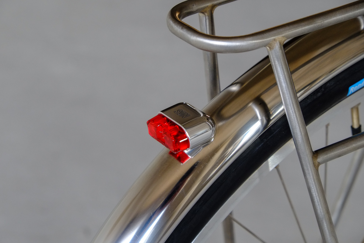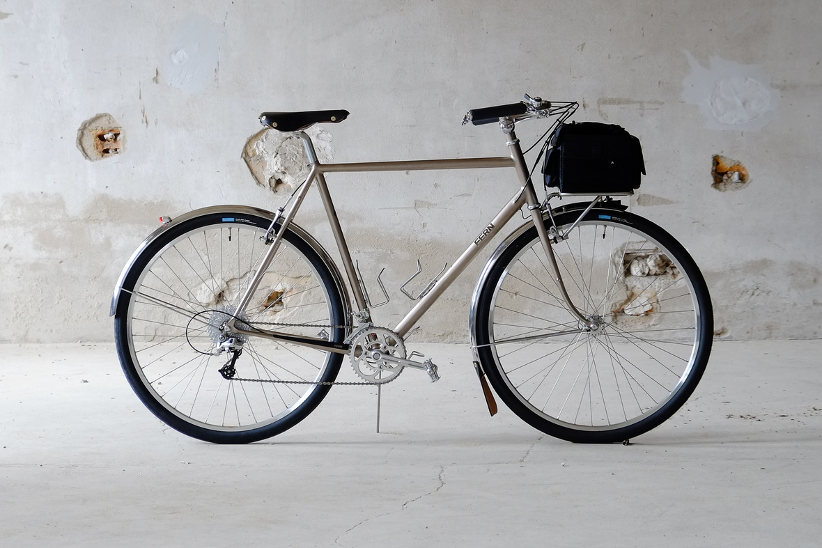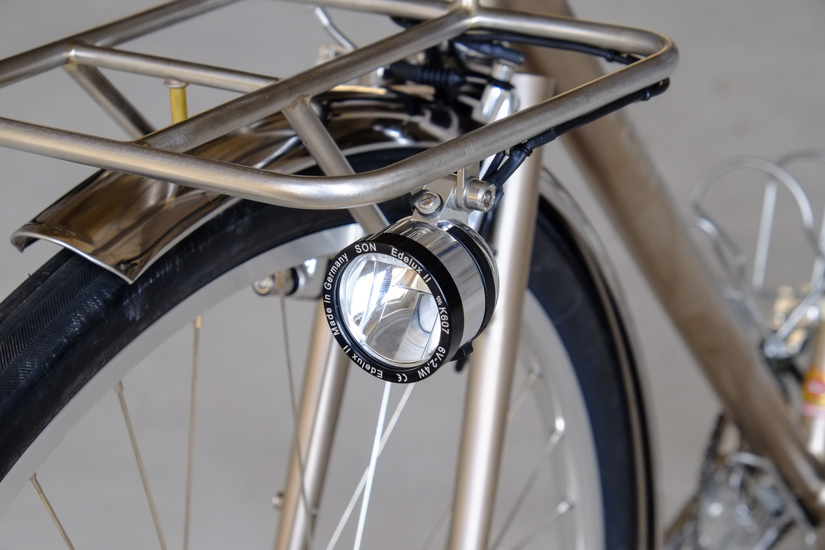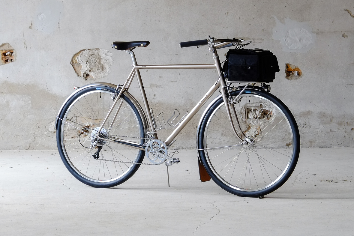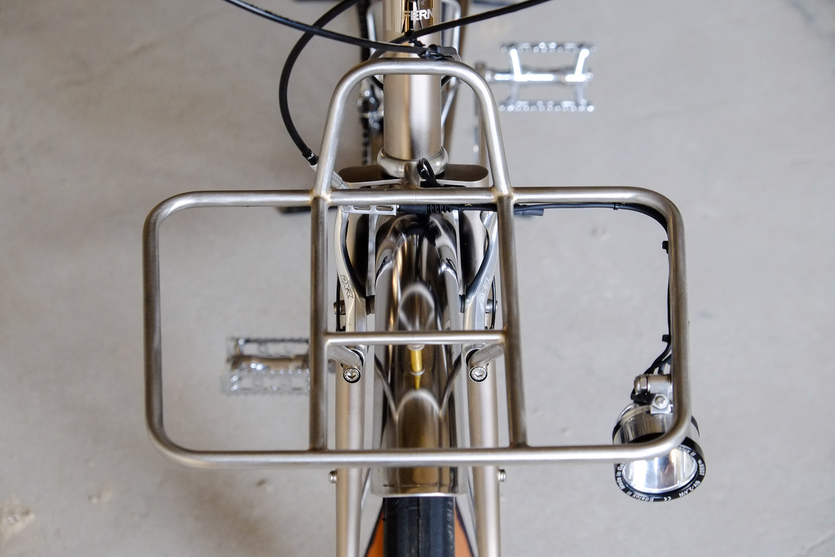 Wolfgang came quite a while ago into our workshop and he was looking for a trekking bicycle. After showing him pictures of classic Rene Herse and Alex Singer porteur style bicycles he was on fire with the idea of building a modern interpretation of this classic bicycle concept. Wolfgang put big trust into us and gave us complete freedom to do whatever we thought was right to put his dream on to two wheels. So we designed a special geometry for this wonderful nickel coated frame and fork which is made from the best Columbus tubing. We did not like the shapes of existing handlebars, so we decided to create our own handelbar stem combo, combining classy optics with perfect ergonomics. Many thanks to my man and master framebuilder Wheeldan for tube bending support! Custom made silverbrazed stainless racks for front and rear.