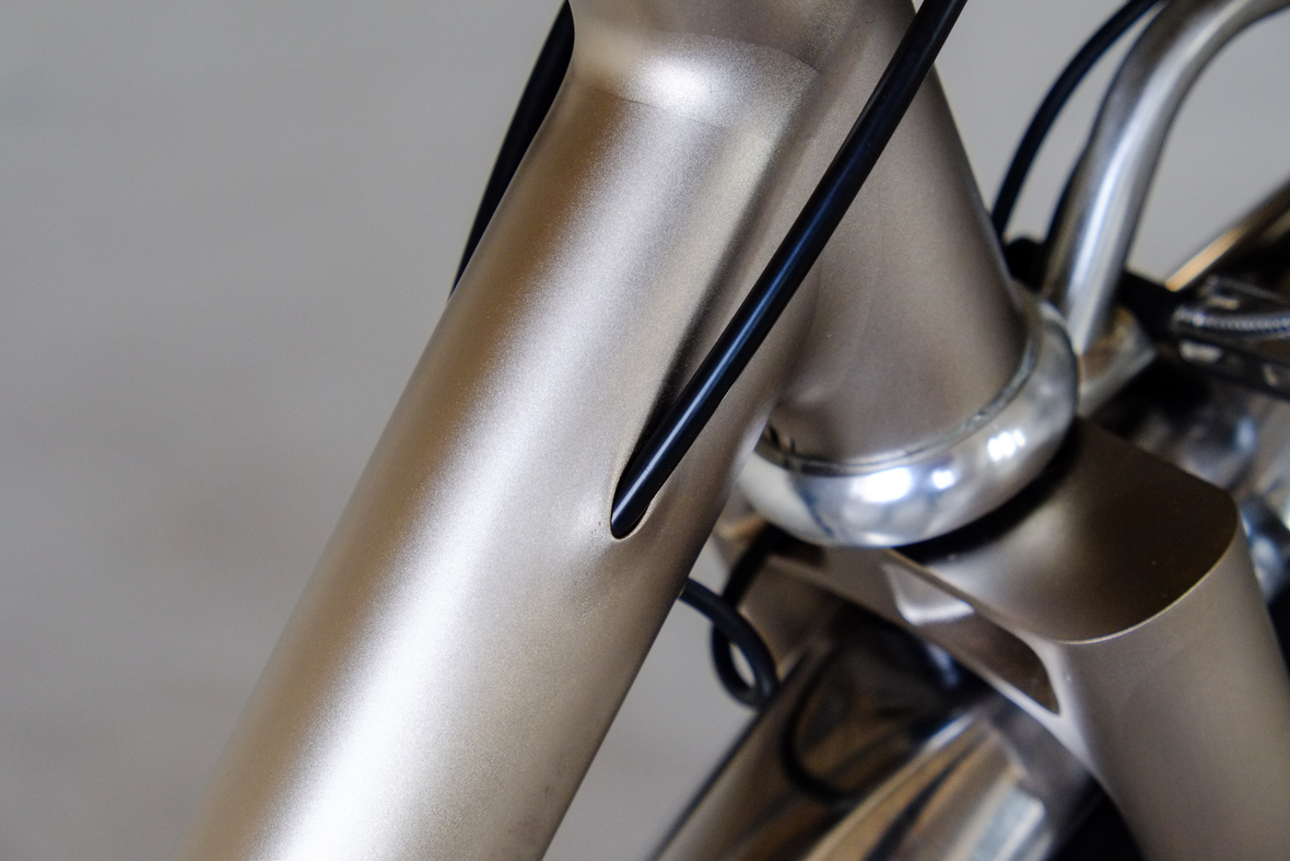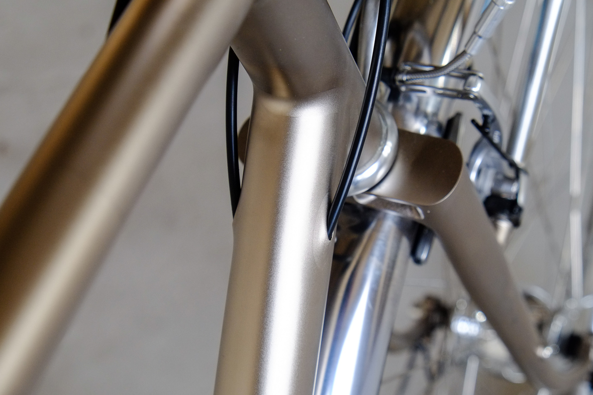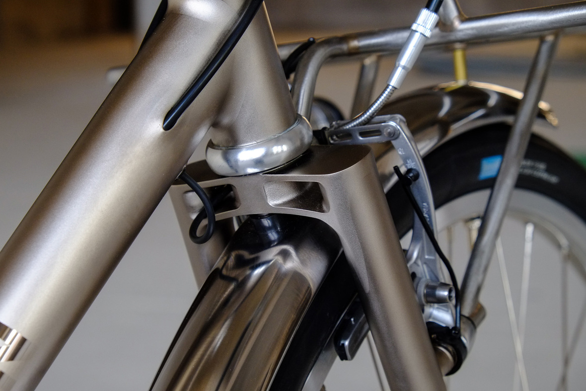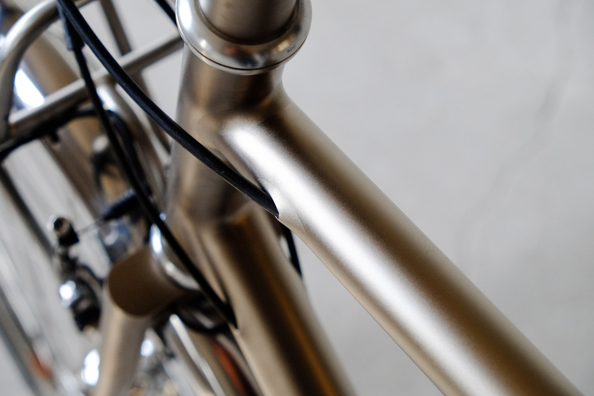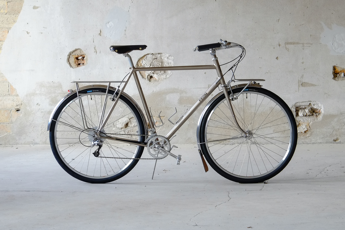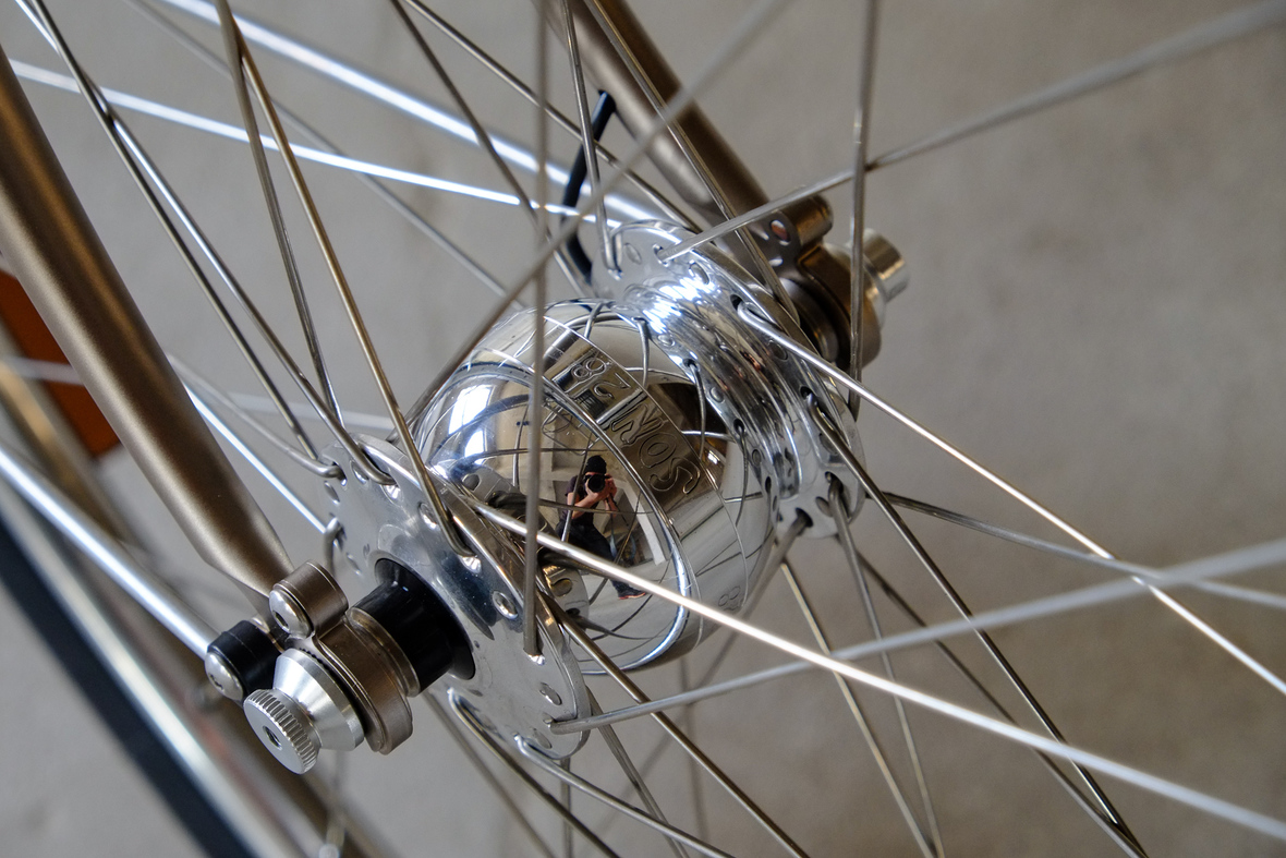 Wolfgang came quite a while ago into our workshop and he was looking for a trekking bicycle. After showing him pictures of classic Rene Herse and Alex Singer porteur style bicycles he was on fire with the idea of building a modern interpretation of this classic bicycle concept. Wolfgang put big trust into us and gave us complete freedom to do whatever we thought was right to put his dream on to two wheels. So we designed a special geometry for this wonderful nickel coated frame and fork which is made from the best Columbus tubing. We did not like the shapes of existing handlebars, so we decided to create our own handelbar stem combo, combining classy optics with perfect ergonomics. Many thanks to my man and master framebuilder Wheeldan for tube bending support! Custom made silverbrazed stainless racks for front and rear.