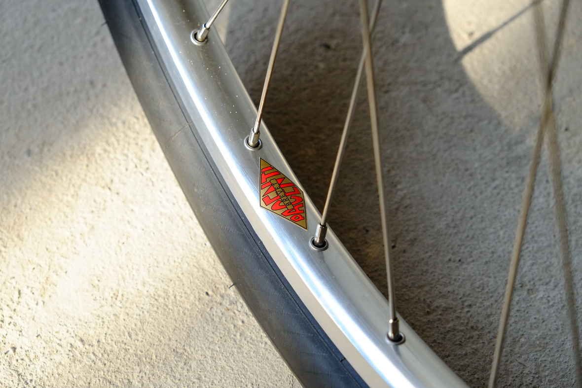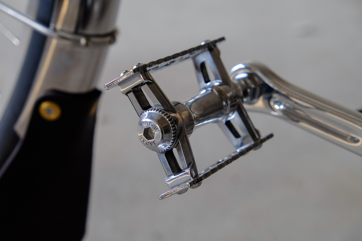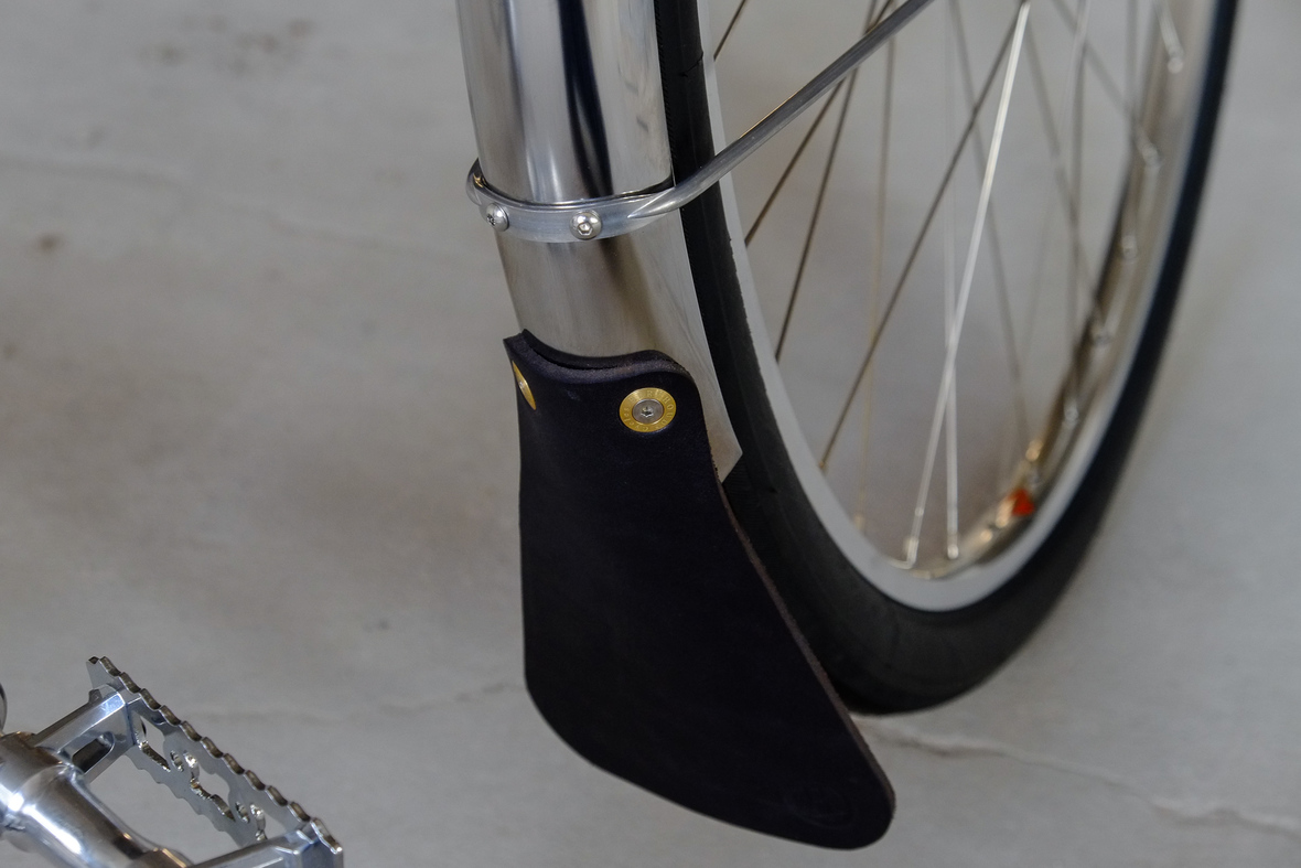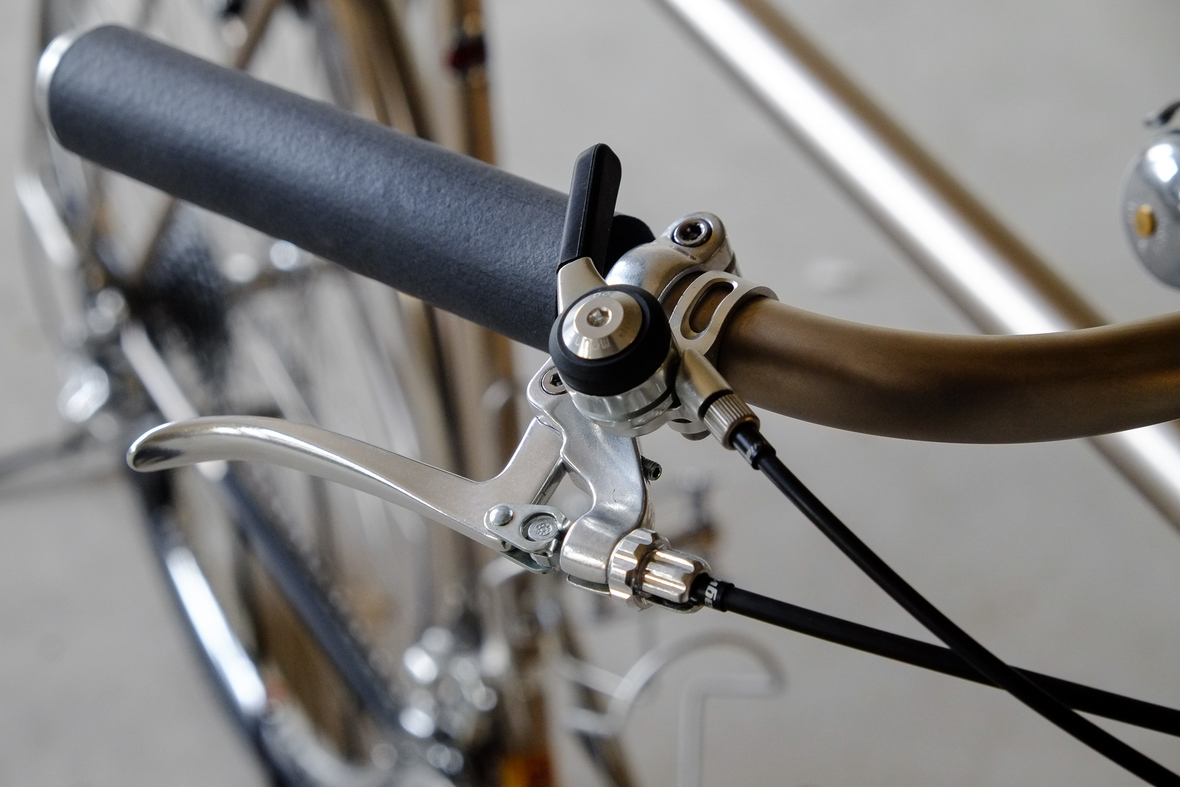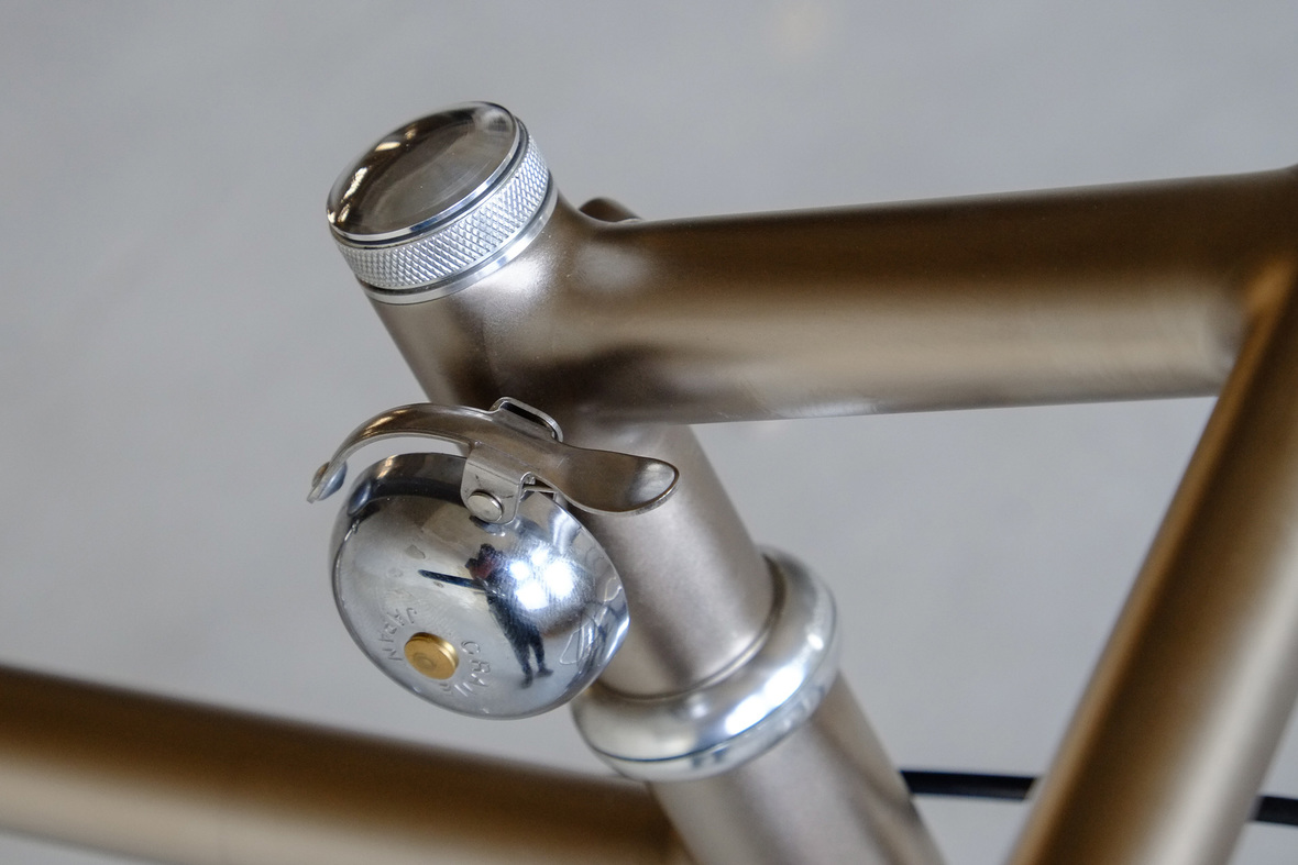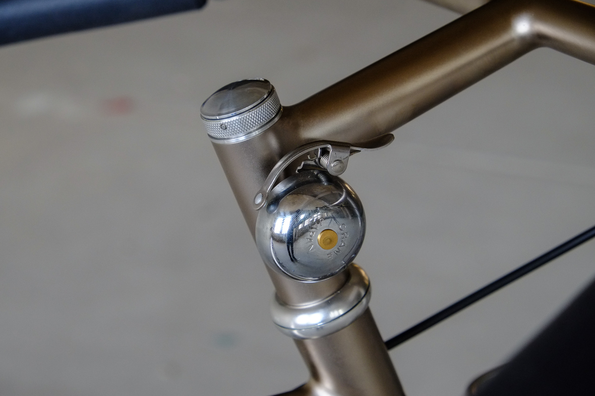 The bike is equipped only with the finest available boutique components and features a wonderful Rene Herse double crankset, running on Rene Herse 38mm Barlow Pass tires, mounted tubeless on Pacenti Brevet rims. We organized a SUN XCD rear hub, shifters, front and rear derailleur mech from Japan matching a classic look with today's modern functionality. MKS Sylvan next and customized Crane Bell coming from Japan aswell. Polished silver Shimano DXR BMX V-brakes to work perfectly with Tektro's CL-740 brake levers. Light's and power by SON. Secret stem cap light switch by Velolumino. Everything is being topped up with the wonderful fenders, saddle, rearview mirror and mudflap made by our friends at Gilles Berthoud. And for sure, there is no such thing as a real porteur bicycle without a decent handlebar bag made by Kristin at Gramm Tourpacking! "Rien ne va plus"... as the french would say! ;)