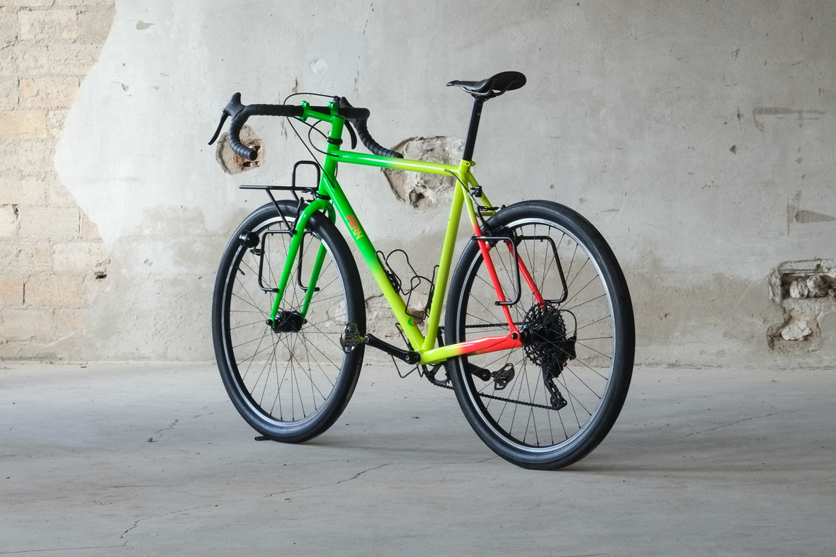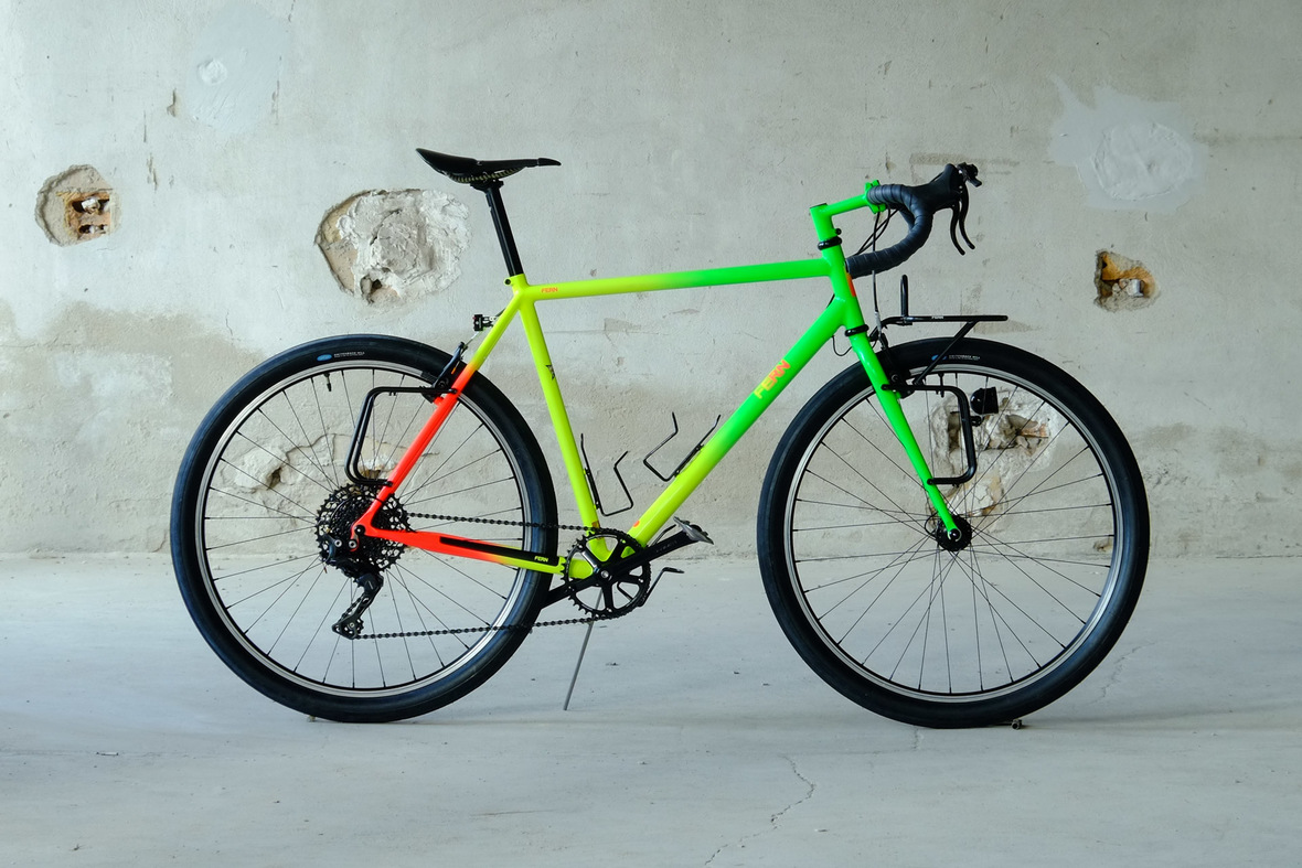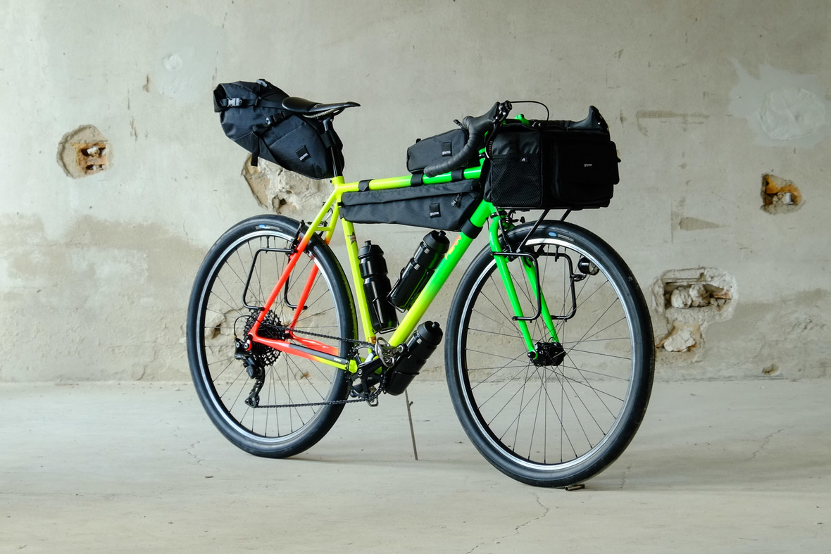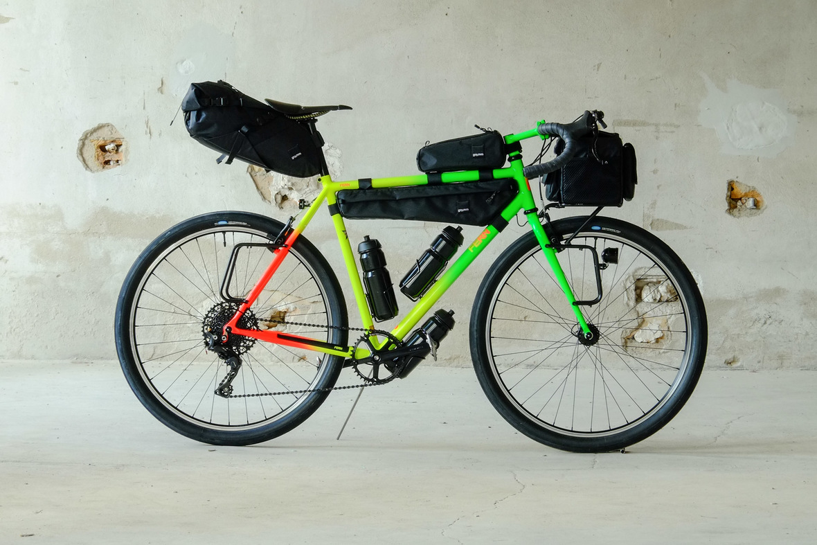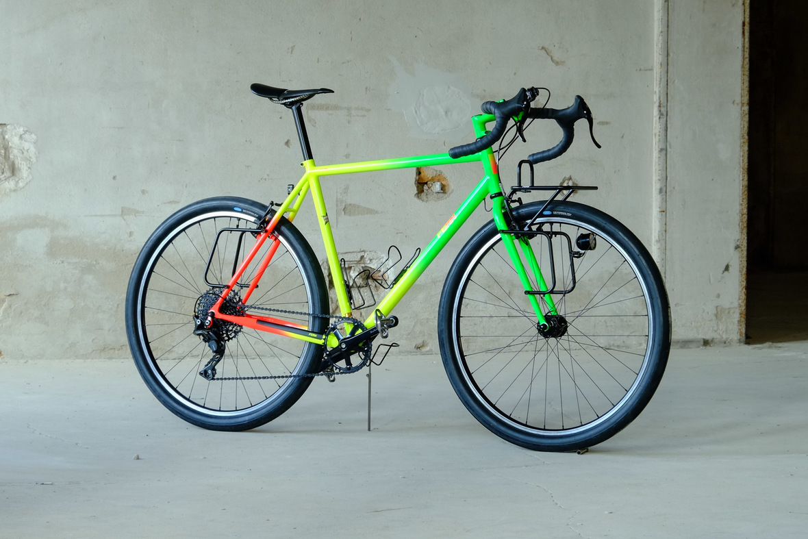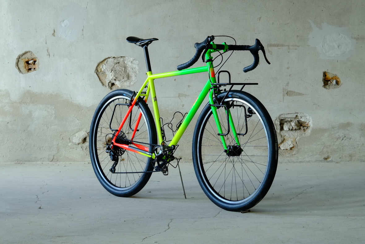 Sunshine,...Sunshine Reggae,...! We build this neon rastafarian Chuck 650B bike for Thorsten. This bike definitely puts a big smile on your face each time you gonna ride this beauty. A frame made from the finest custom made Columbus tubing and featuring our iconic Chuck slingshot stem and complete rack setup, all handmade by Fern. 1x11 Shimano gearing combined with Gevenalles for smooth and durable shifting perfomance, even in the roughest conditions. Supple and superfast rolling on Rene Herse Switchbackhill 650Bx48mm tires. Energy supply via SON 28 hubdynamo, bright as sunshine lighting with SON Edelux 2 headlight and Supernova taillight. Incredible paint job as usual by our man at Velociao , perfect matching bags made by my love Tine at Gramm Tourpacking . Have good times rolling Thorsten, Irie man! ;)