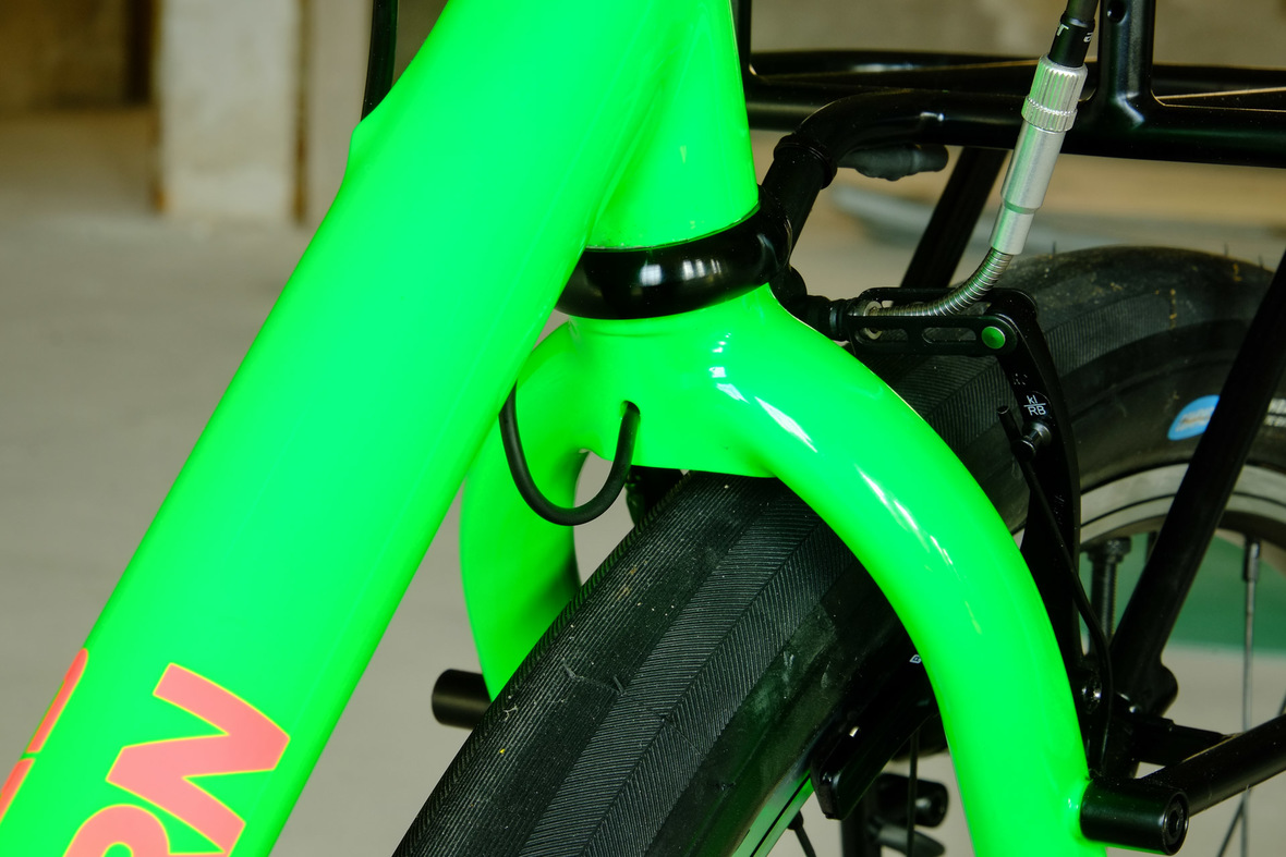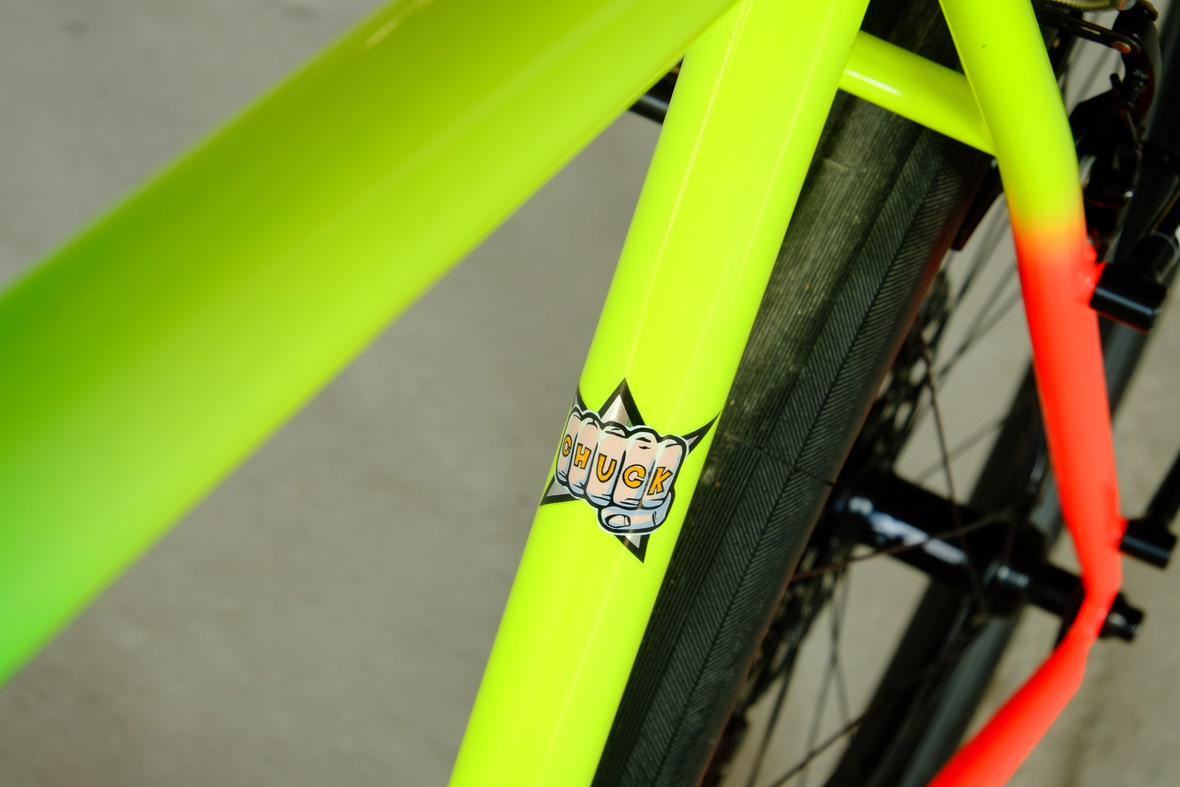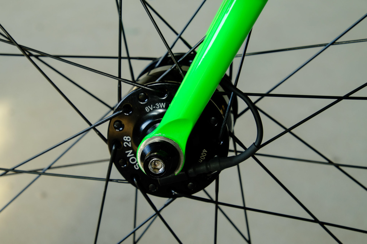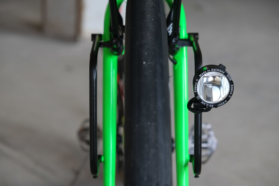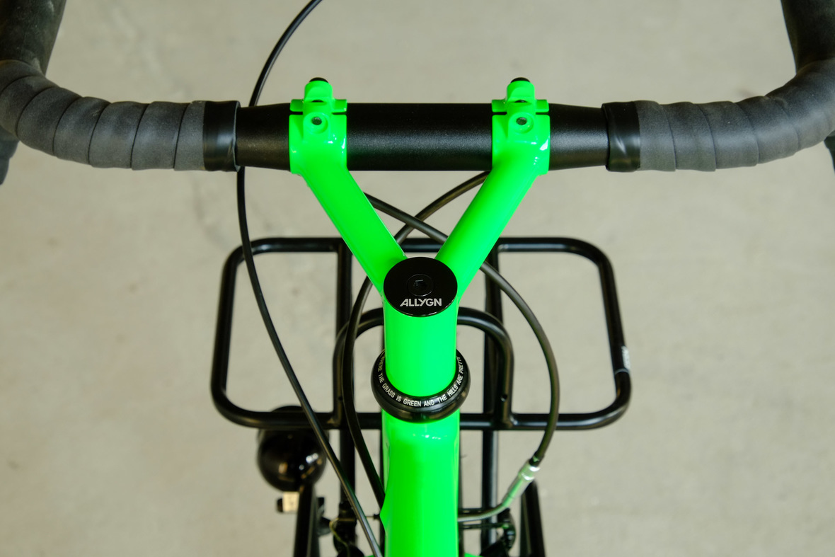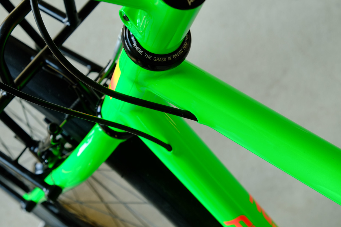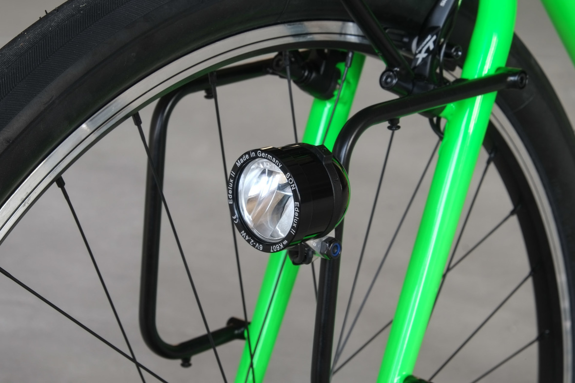Sunshine,...Sunshine Reggae,...! We build this neon rastafarian Chuck 650B bike for Thorsten. This bike definitely puts a big smile on your face each time you gonna ride this beauty. A frame made from the finest custom made Columbus tubing and featuring our iconic Chuck slingshot stem and complete rack setup, all handmade by Fern. 1x11 Shimano gearing combined with Gevenalles for smooth and durable shifting perfomance, even in the roughest conditions. Supple and superfast rolling on Rene Herse Switchbackhill 650Bx48mm tires. Energy supply via SON 28 hubdynamo, bright as sunshine lighting with SON Edelux 2 headlight and Supernova taillight. Incredible paint job as usual by our man at Velociao , perfect matching bags made by my love Tine at Gramm Tourpacking . Have good times rolling Thorsten, Irie man! ;)