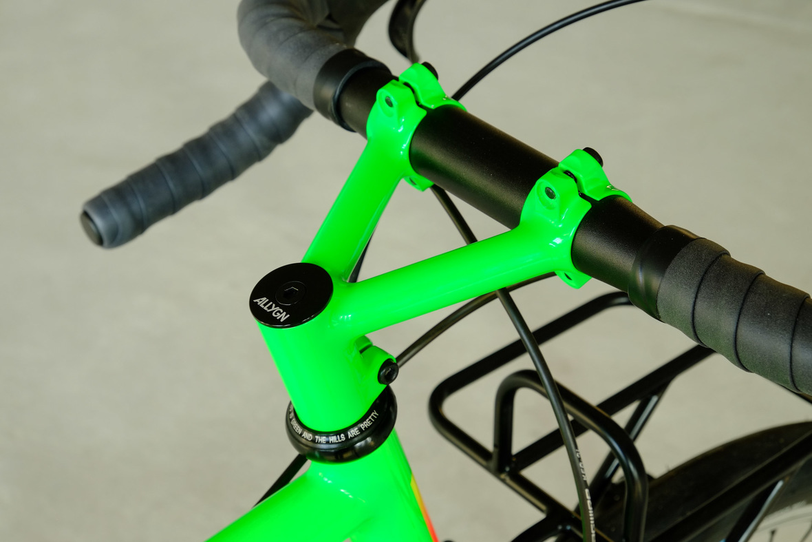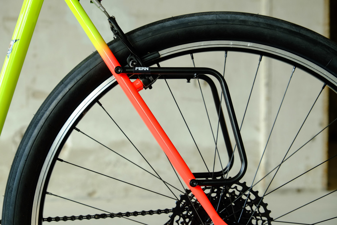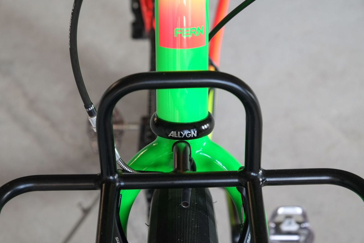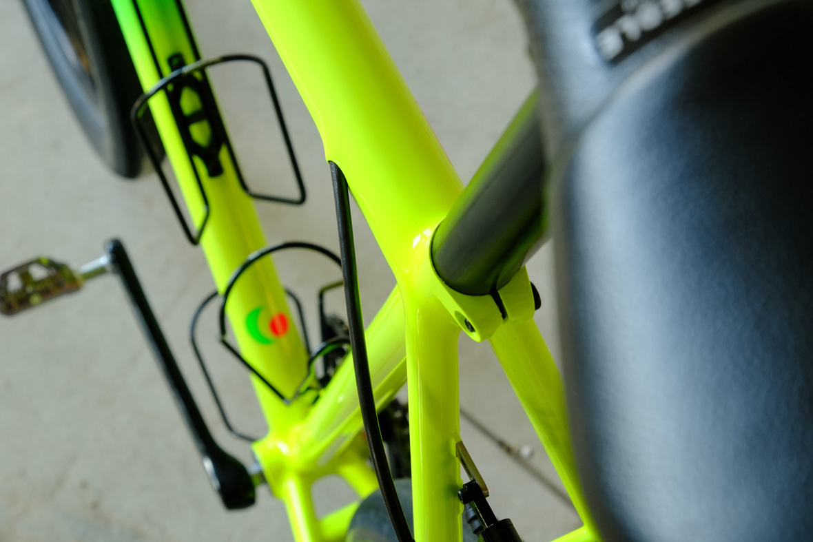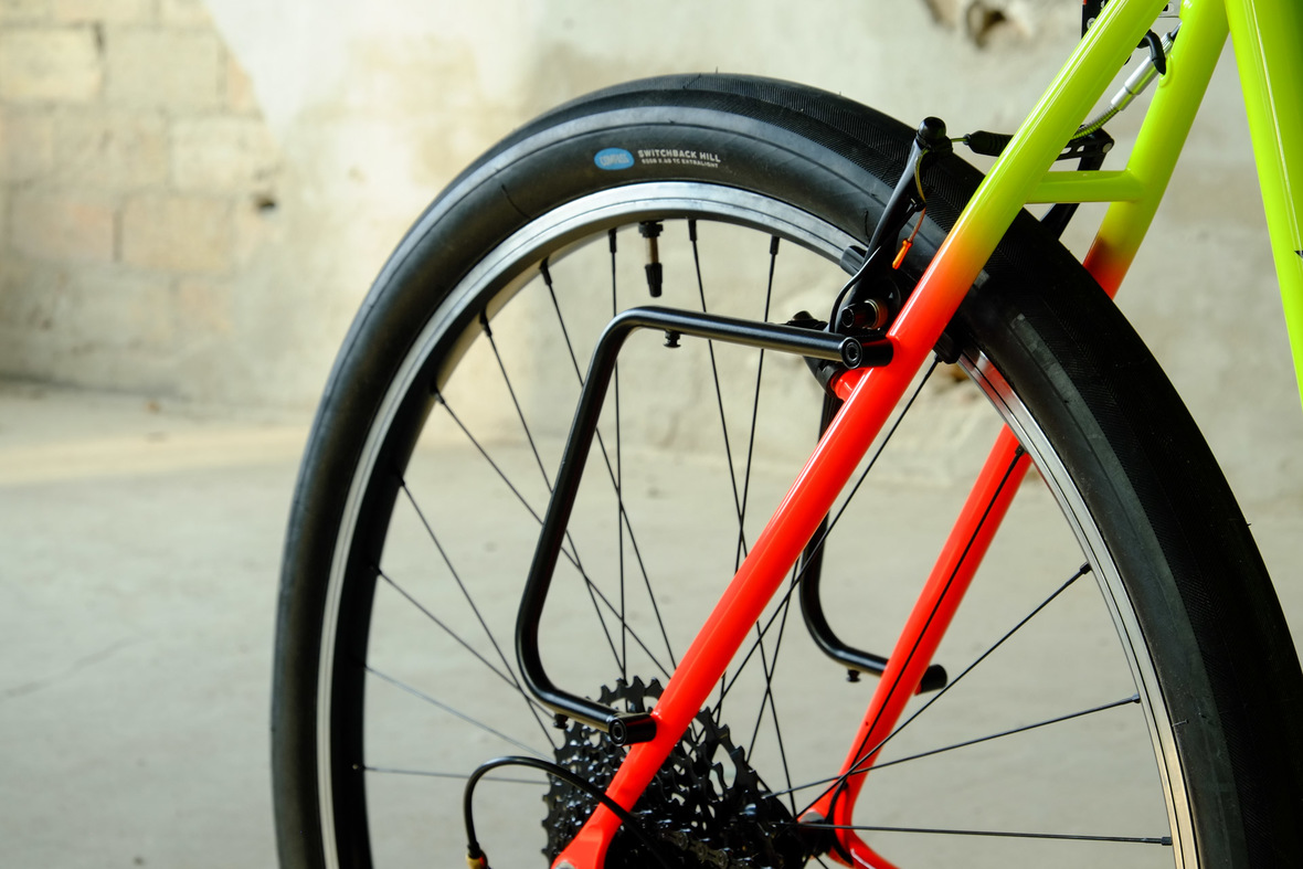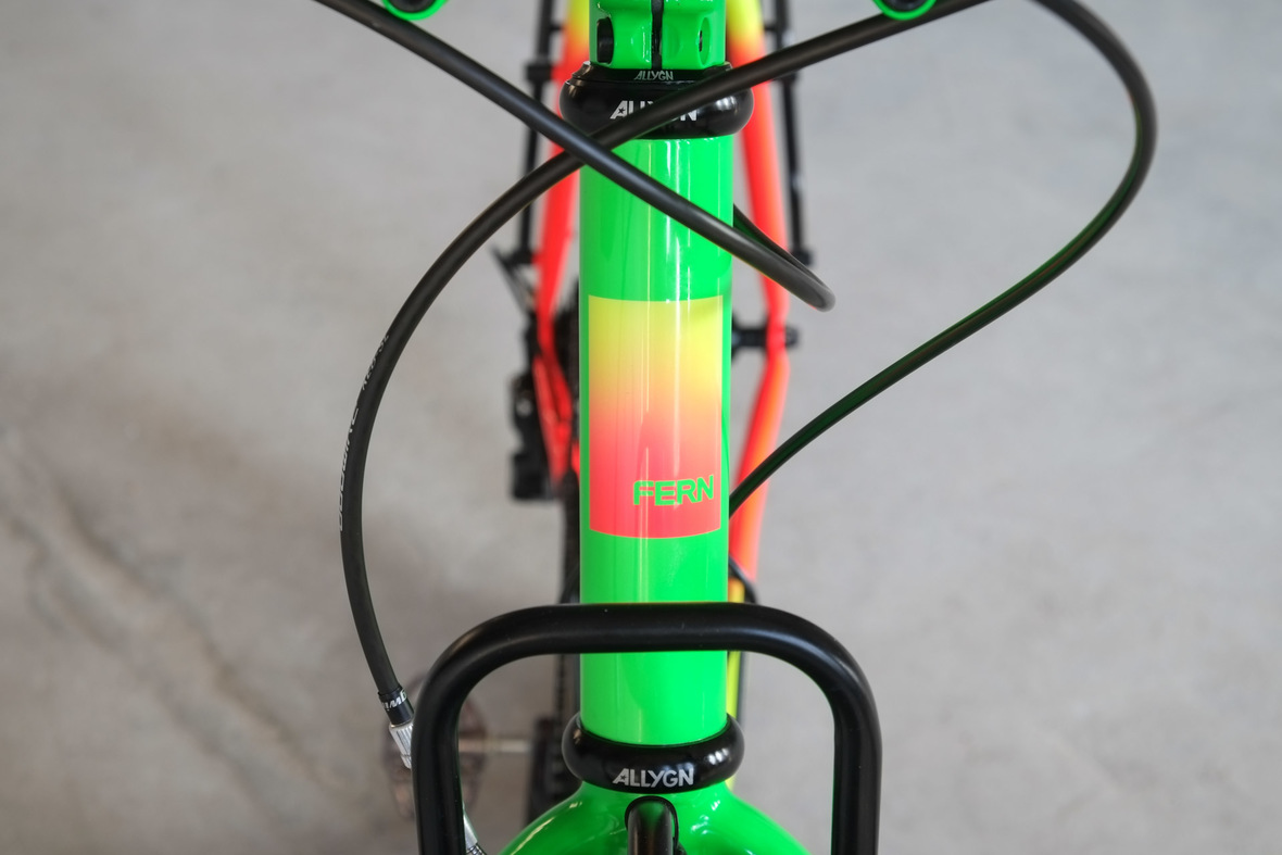 Sunshine,...Sunshine Reggae,...! We build this neon rastafarian Chuck 650B bike for Thorsten. This bike definitely puts a big smile on your face each time you gonna ride this beauty. A frame made from the finest custom made Columbus tubing and featuring our iconic Chuck slingshot stem and complete rack setup, all handmade by Fern. 1x11 Shimano gearing combined with Gevenalles for smooth and durable shifting perfomance, even in the roughest conditions. Supple and superfast rolling on Rene Herse Switchbackhill 650Bx48mm tires. Energy supply via SON 28 hubdynamo, bright as sunshine lighting with SON Edelux 2 headlight and Supernova taillight. Incredible paint job as usual by our man at Velociao , perfect matching bags made by my love Tine at Gramm Tourpacking . Have good times rolling Thorsten, Irie man! ;)