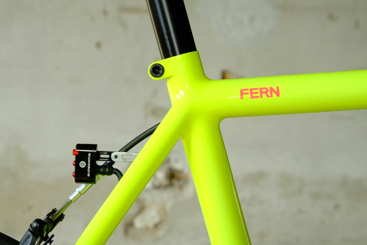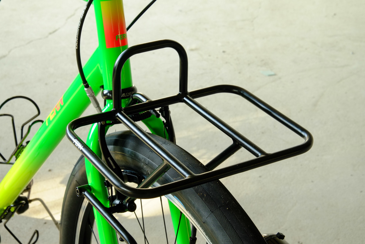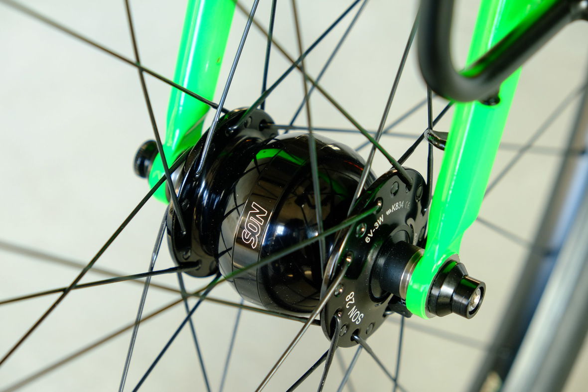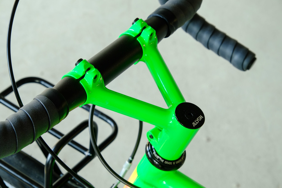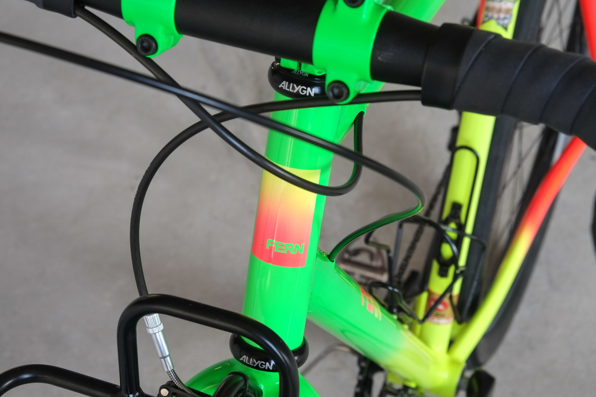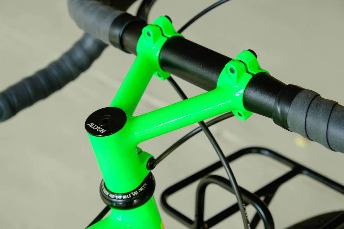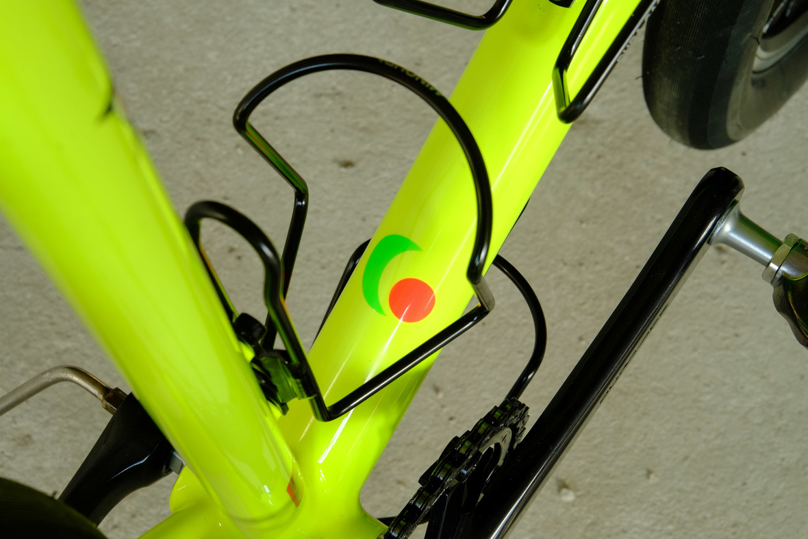 Sunshine,...Sunshine Reggae,...! We build this neon rastafarian Chuck 650B bike for Thorsten. This bike definitely puts a big smile on your face each time you gonna ride this beauty. A frame made from the finest custom made Columbus tubing and featuring our iconic Chuck slingshot stem and complete rack setup, all handmade by Fern. 1x11 Shimano gearing combined with Gevenalles for smooth and durable shifting perfomance, even in the roughest conditions. Supple and superfast rolling on Rene Herse Switchbackhill 650Bx48mm tires. Energy supply via SON 28 hubdynamo, bright as sunshine lighting with SON Edelux 2 headlight and Supernova taillight. Incredible paint job as usual by our man at Velociao , perfect matching bags made by my love Tine at Gramm Tourpacking . Have good times rolling Thorsten, Irie man! ;)