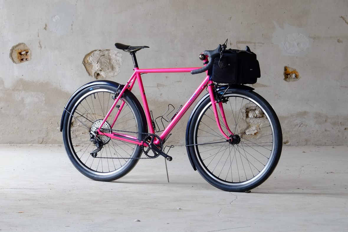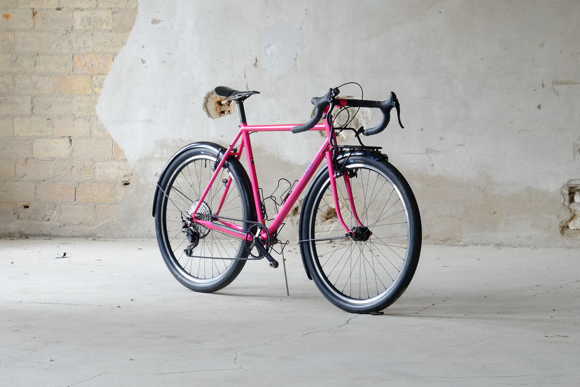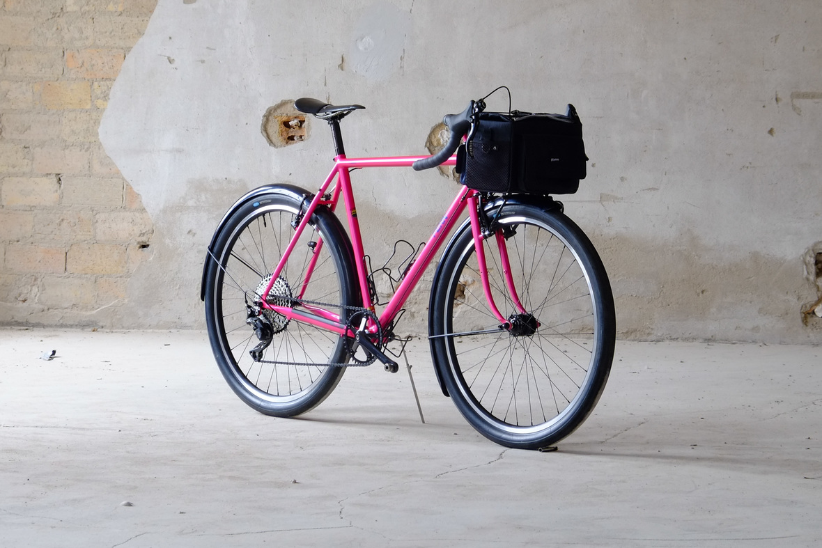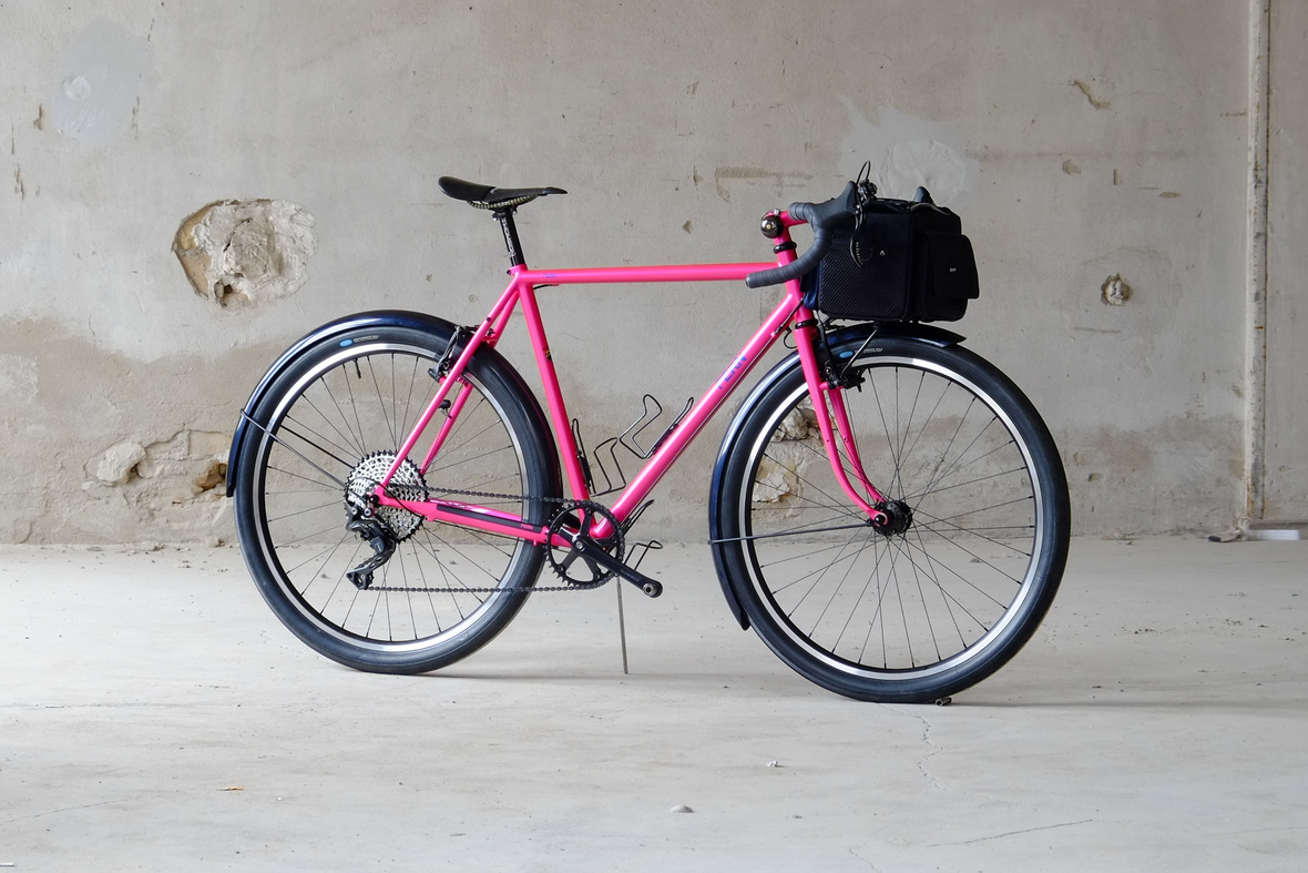 This is a very special bike we made for my buddy Rene who is an avid member of the Berlin brevet riding gang. He came to us with the idea of an light weight multipurpos machine which can be used equally well off and on the road, and as good for long distance riding as well as for your quick weekend spins through Brandenburg´s sandpits. Also he wanted the bike to be fully rinkoable to take it easily on and off trains.
