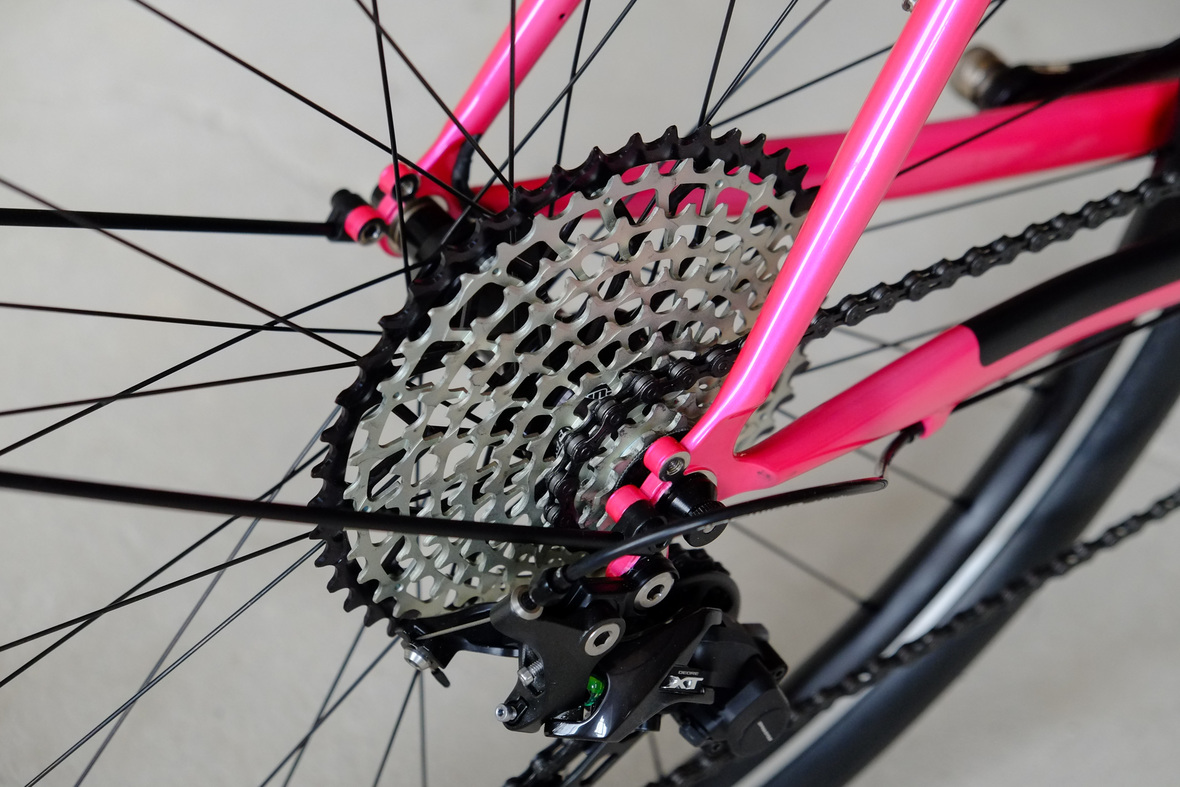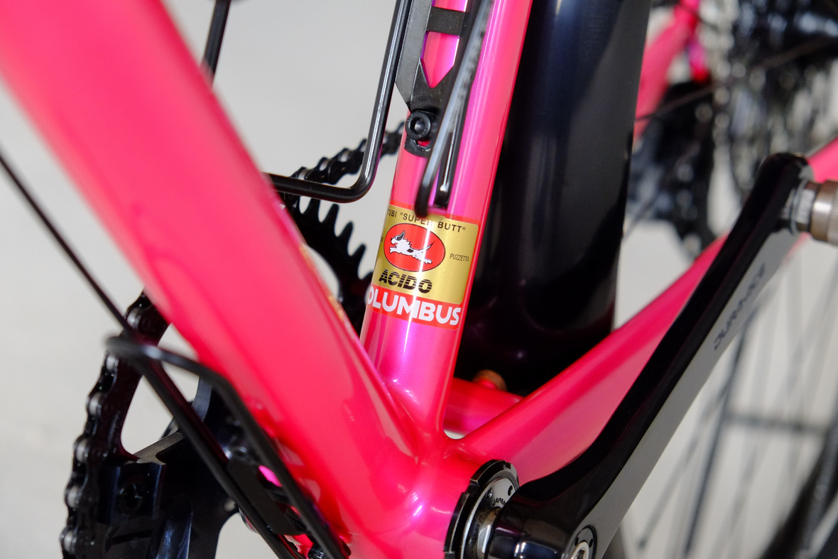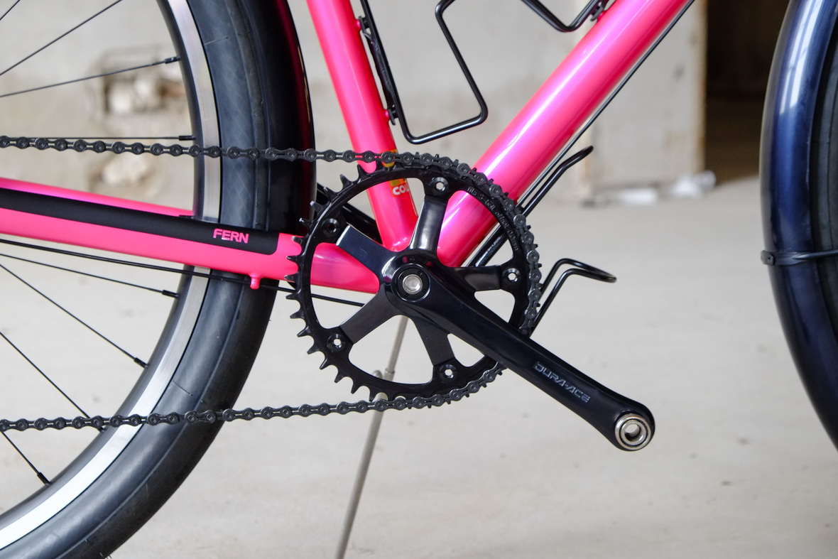 This in mind we created a new version of our classic Chico bike which can do all that. The bike is rolling smooth on 650B x 48mm Rene Herse Switchback tires and is made from superlight Columbus tubing. Like most of our bikes also this one is equipped with our trademark drivetrain, 1x11 Shimano XT controlled by Gevenalle shifters, to be spun with our vintage black anodized cranset and a NOS Dura Ace bottom bracket. A very nice tuning part is the cassette made by Garbaruk.