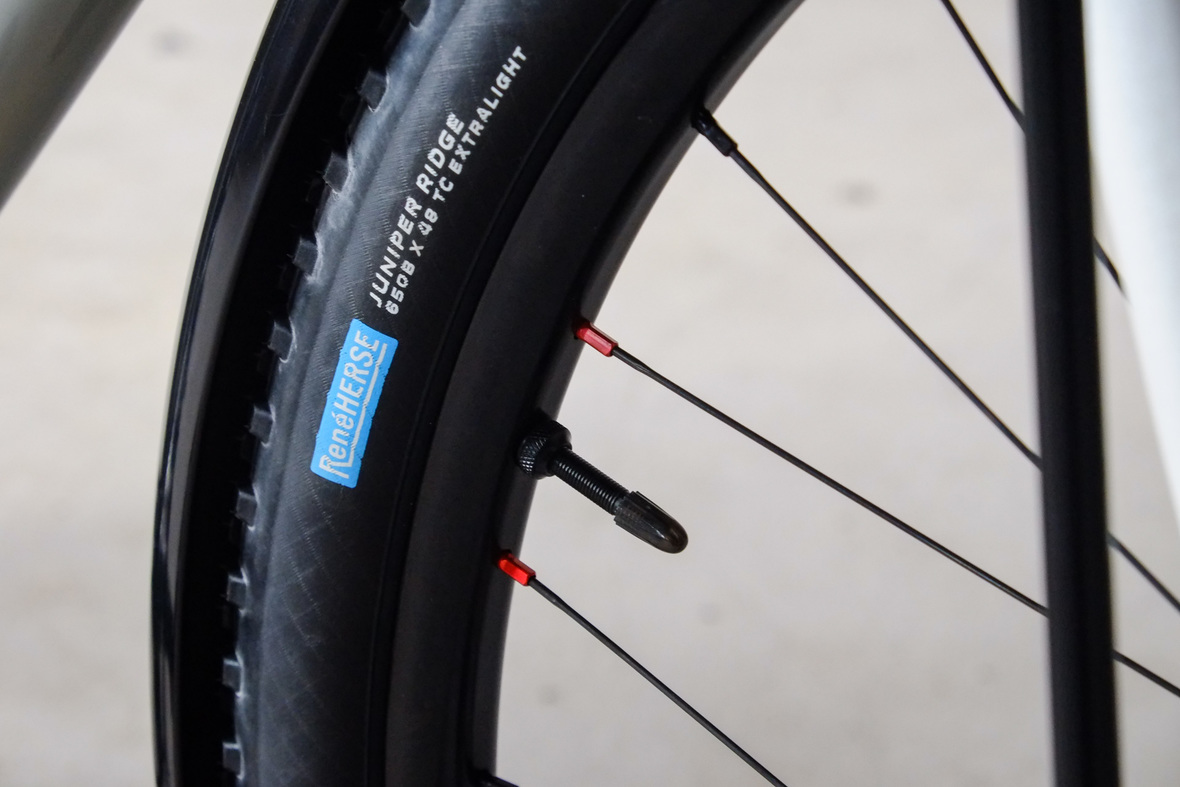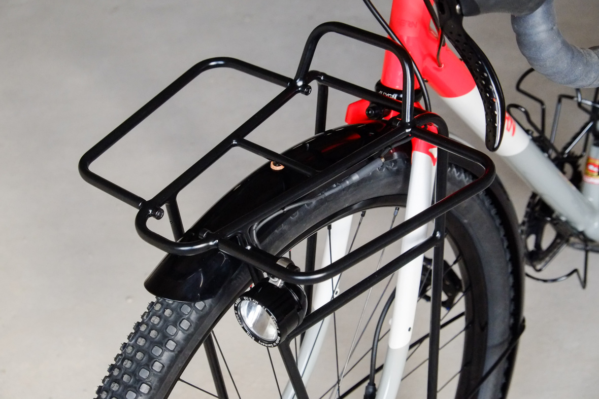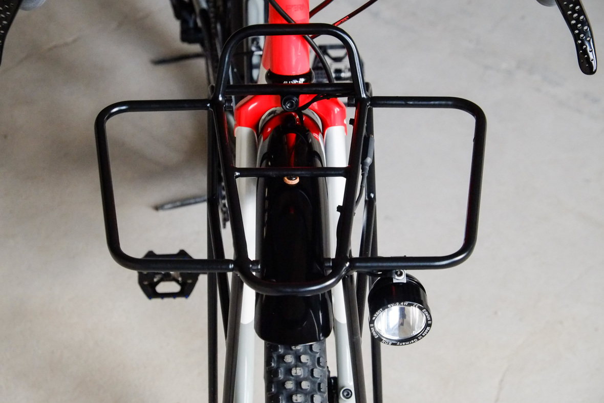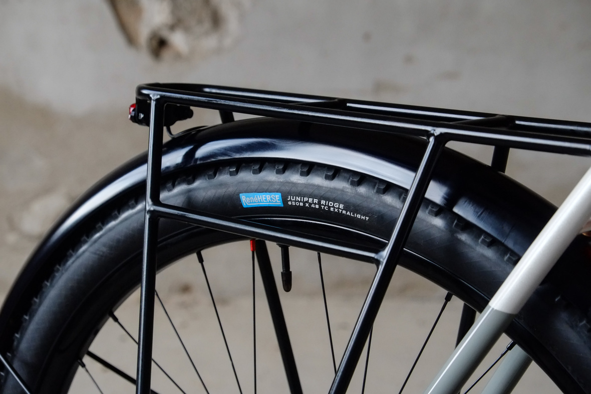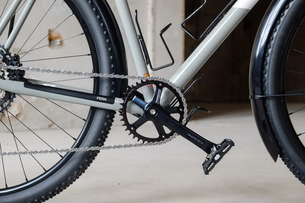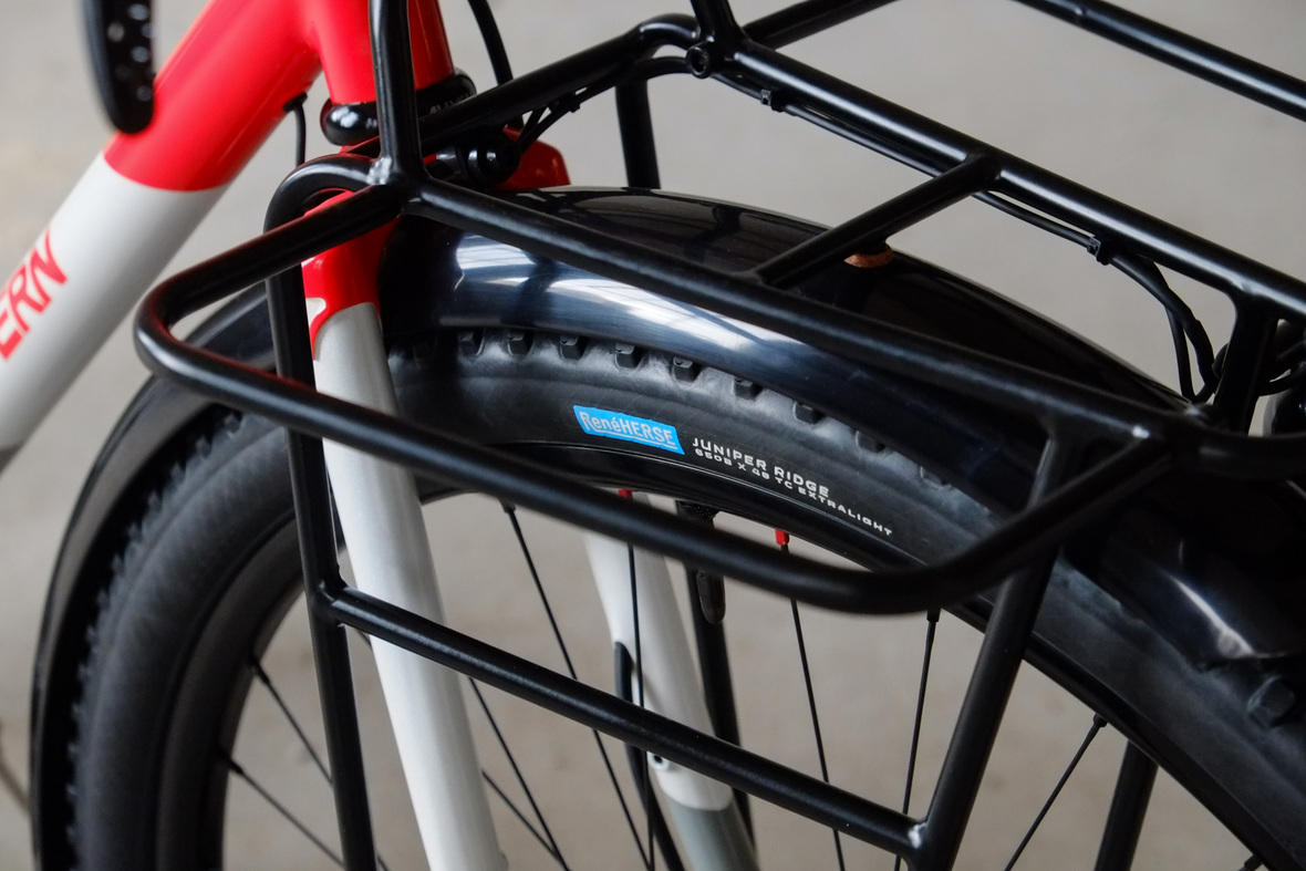 The bike rolls in winter times on the new 48mm Rene Herse Juniper Ridge Extralight knobby tires and will be switched in spring time to Switchback Extralight's. Custom black anodized Honjo Fenders for perfect all year round weather protection. 12sp Shimano XT drivetrain paired with the amazing Gevenalle - TRP Hylex shifter - brake combo for extra smooth action, great stopping power and reliability. Lights and energy supply by SON, ultimate charging power with the brand new Forumslader Pro Version.