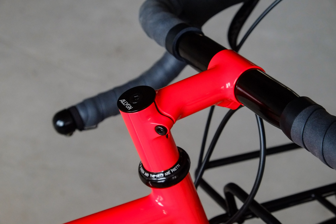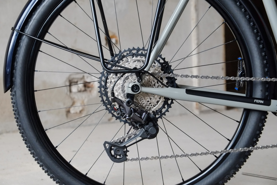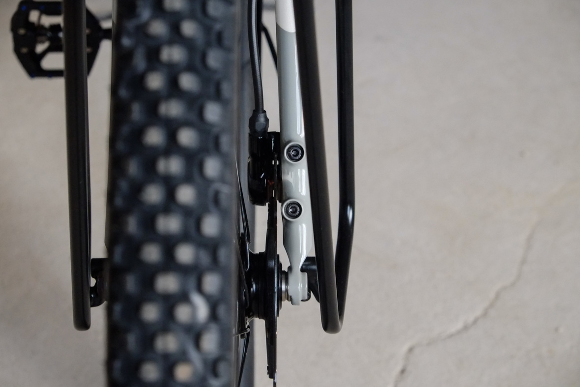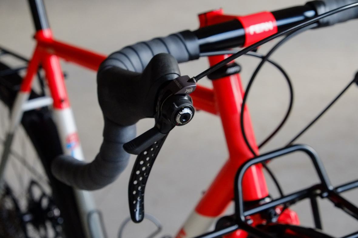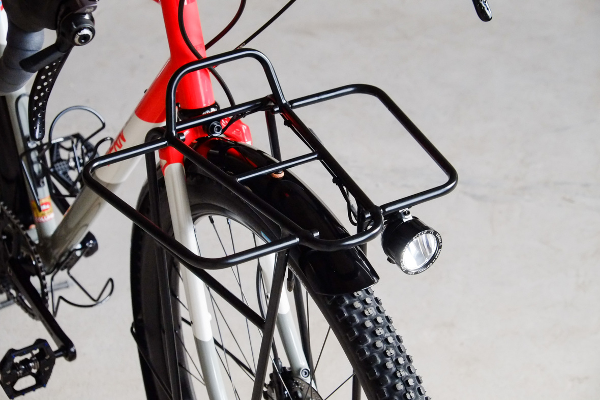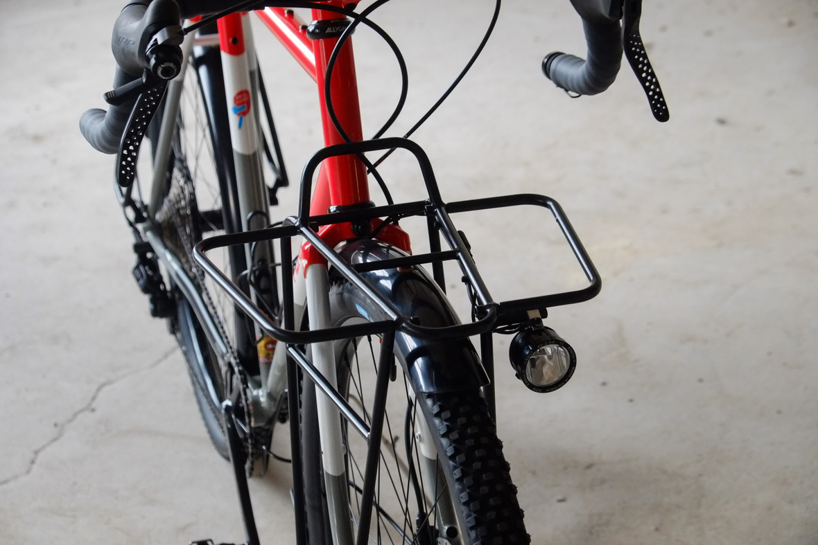 The bike rolls in winter times on the new 48mm Rene Herse Juniper Ridge Extralight knobby tires and will be switched in spring time to Switchback Extralight's. Custom black anodized Honjo Fenders for perfect all year round weather protection. 12sp Shimano XT drivetrain paired with the amazing Gevenalle - TRP Hylex shifter - brake combo for extra smooth action, great stopping power and reliability. Lights and energy supply by SON, ultimate charging power with the brand new Forumslader Pro Version.
