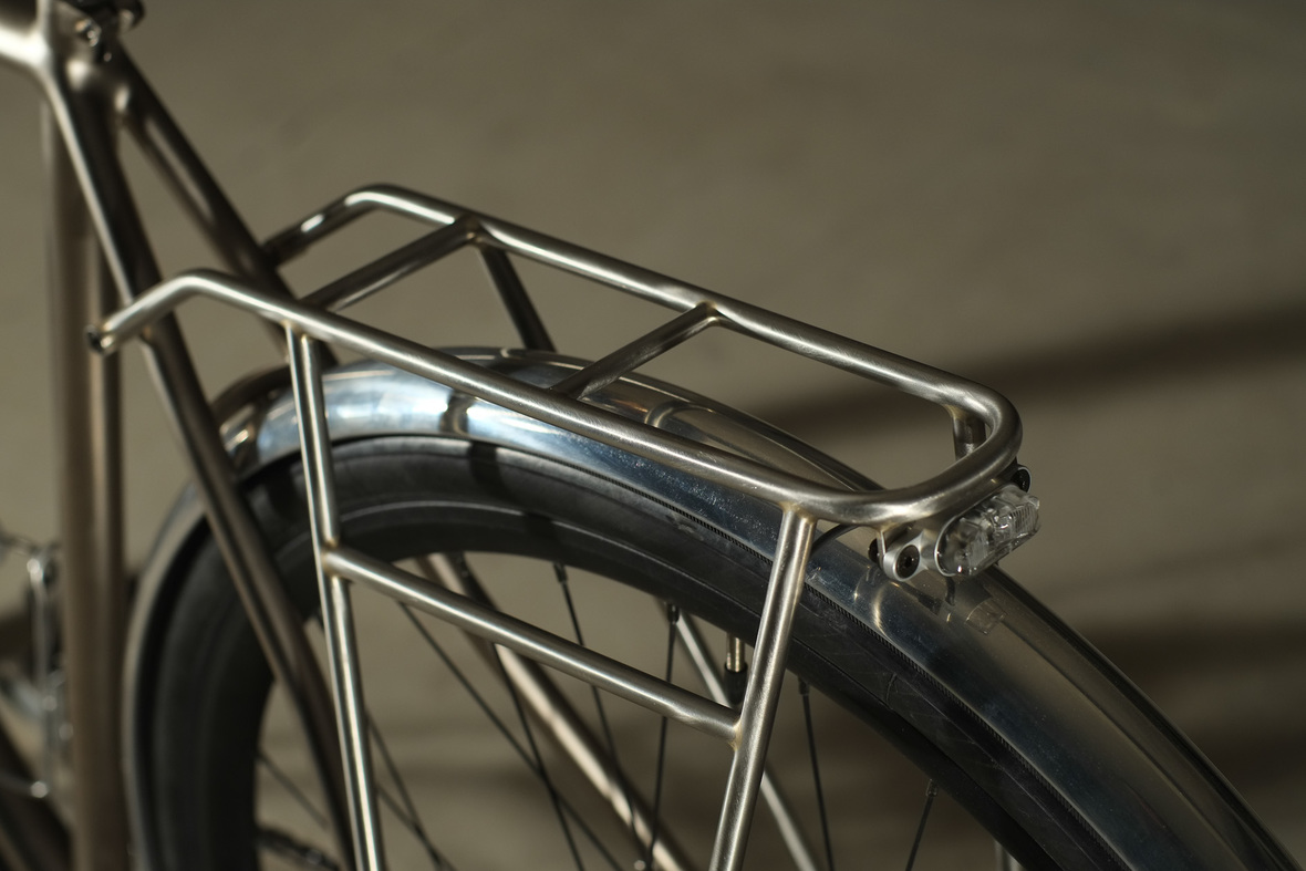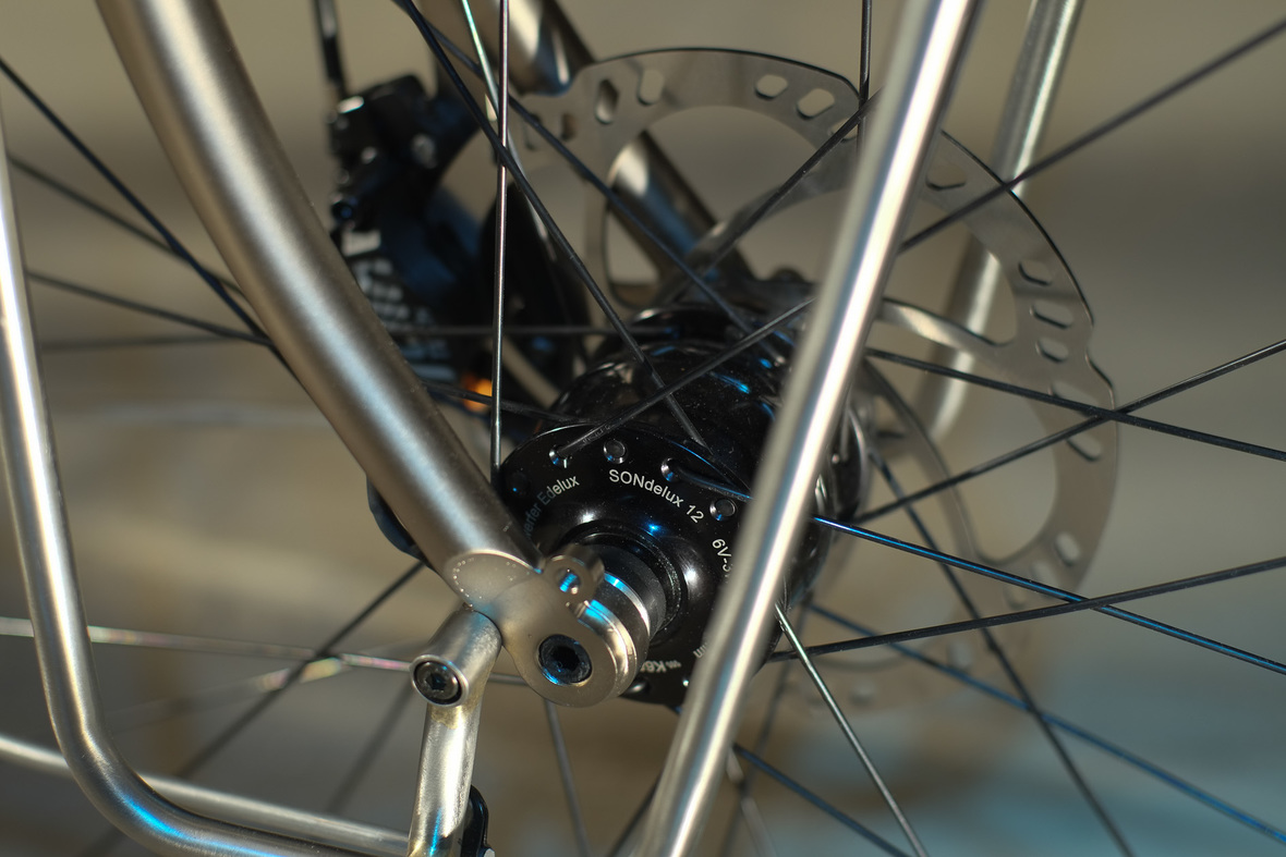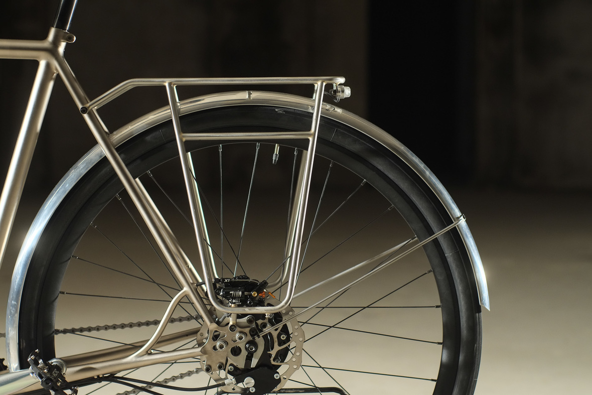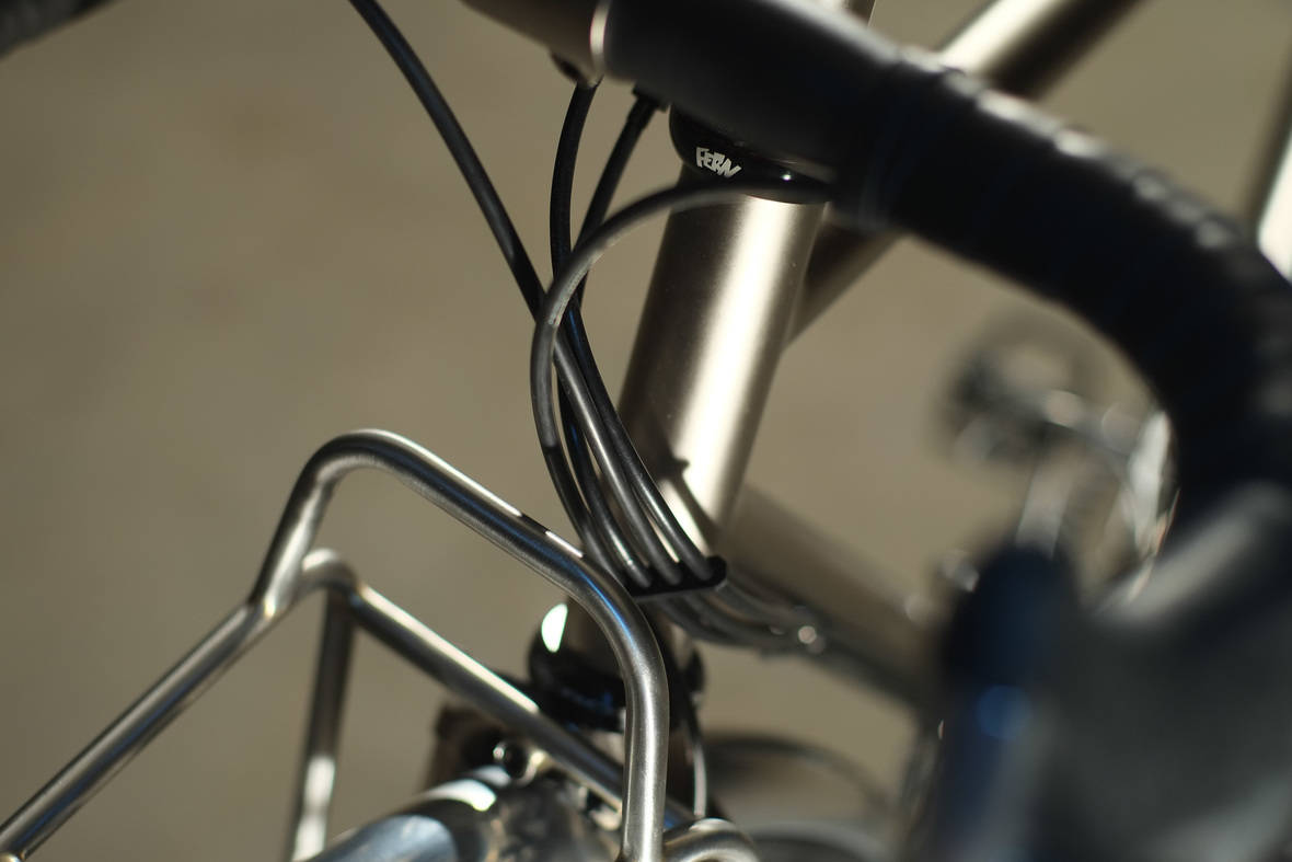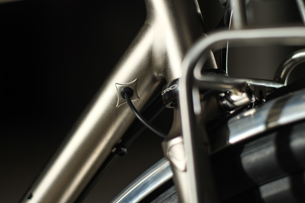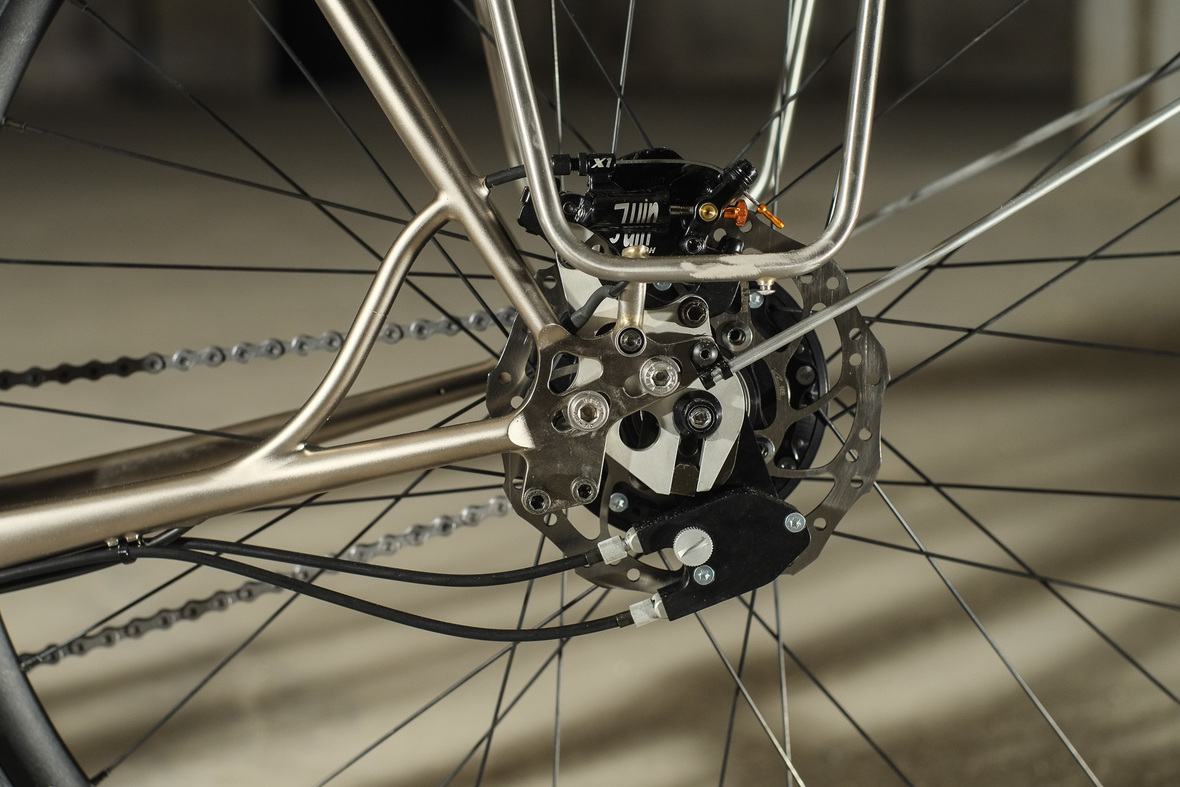 The bike is nickel coated and comes with handmade racks in stainless steel. Custom shifter support for the Rohloff rear hub, custom Fern stainless throughaxle dropouts, Juintech cable operated hydraulic disc brakes, Compass tires, etc, etc,…
