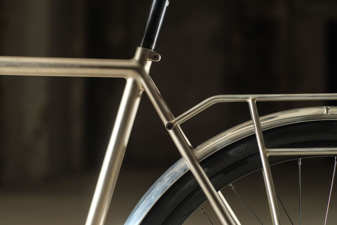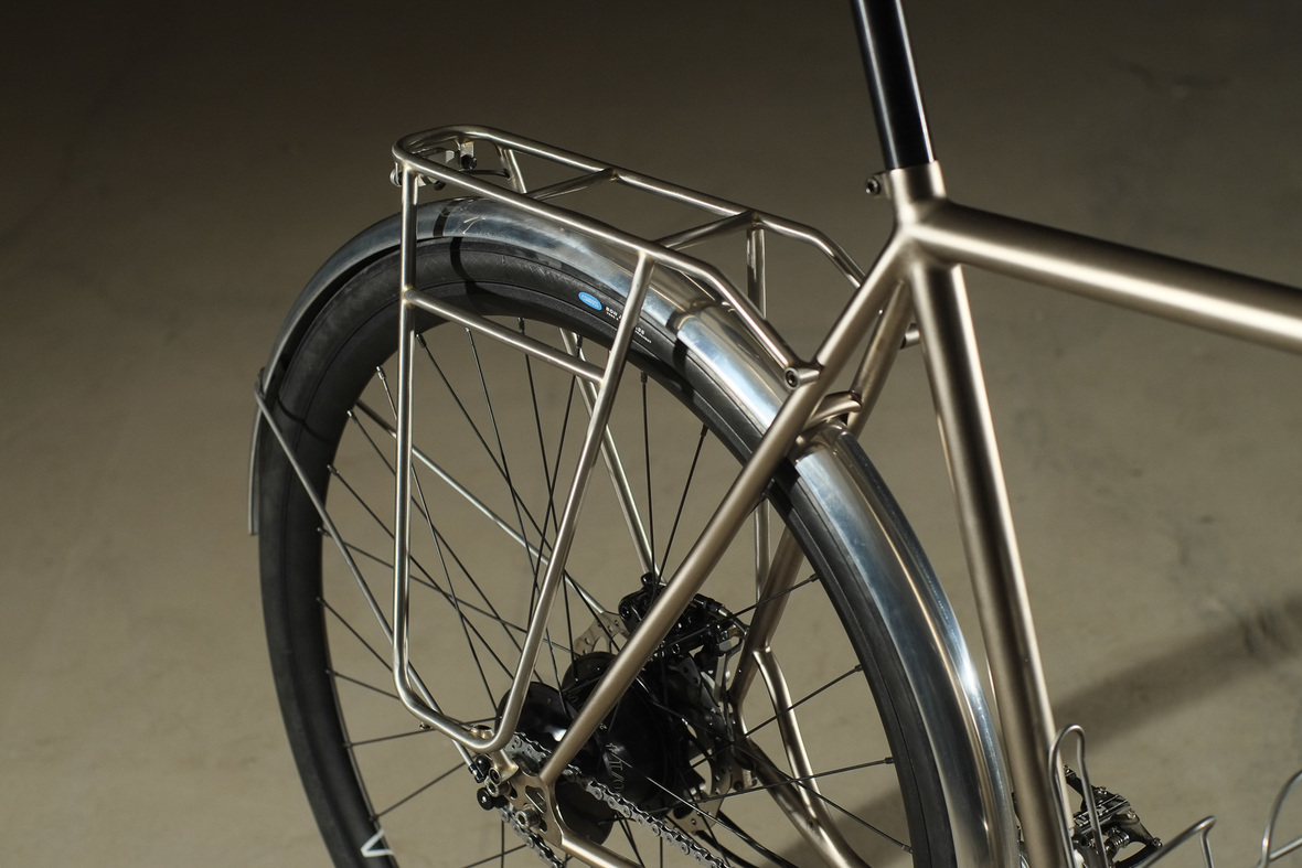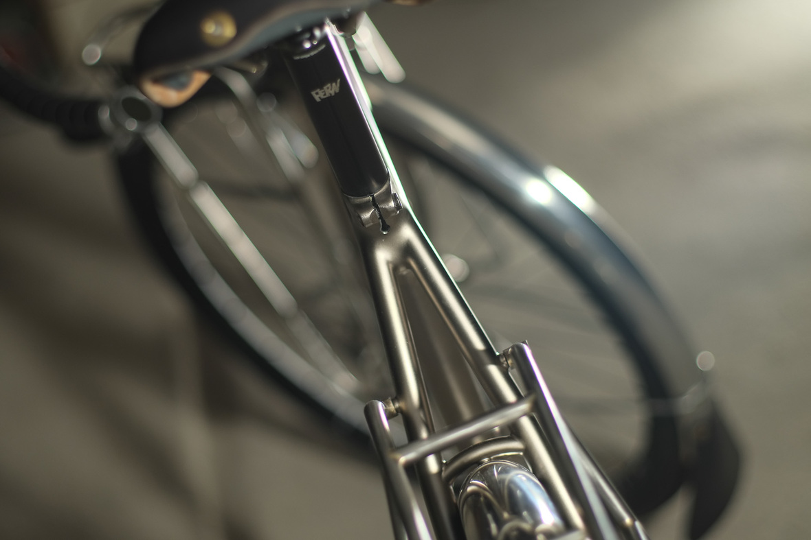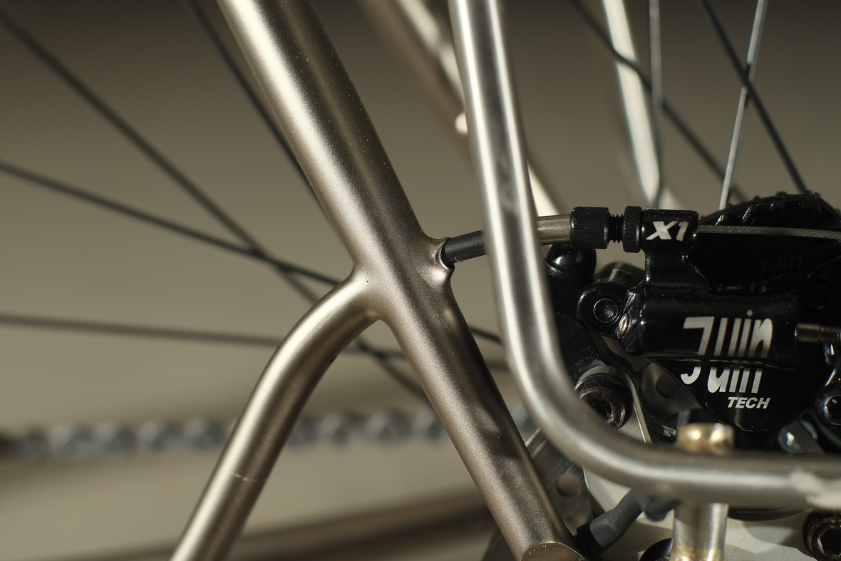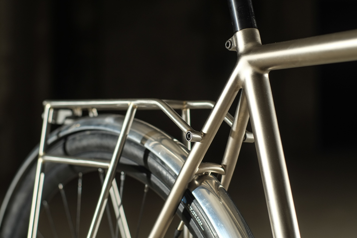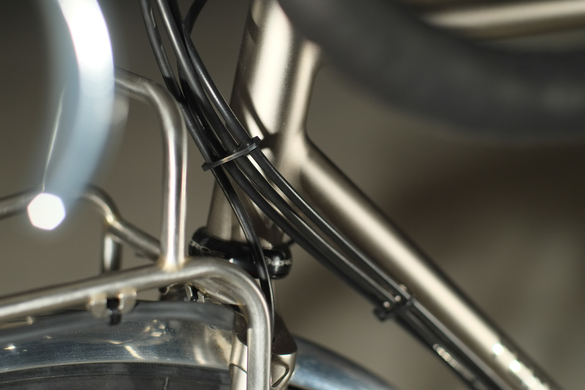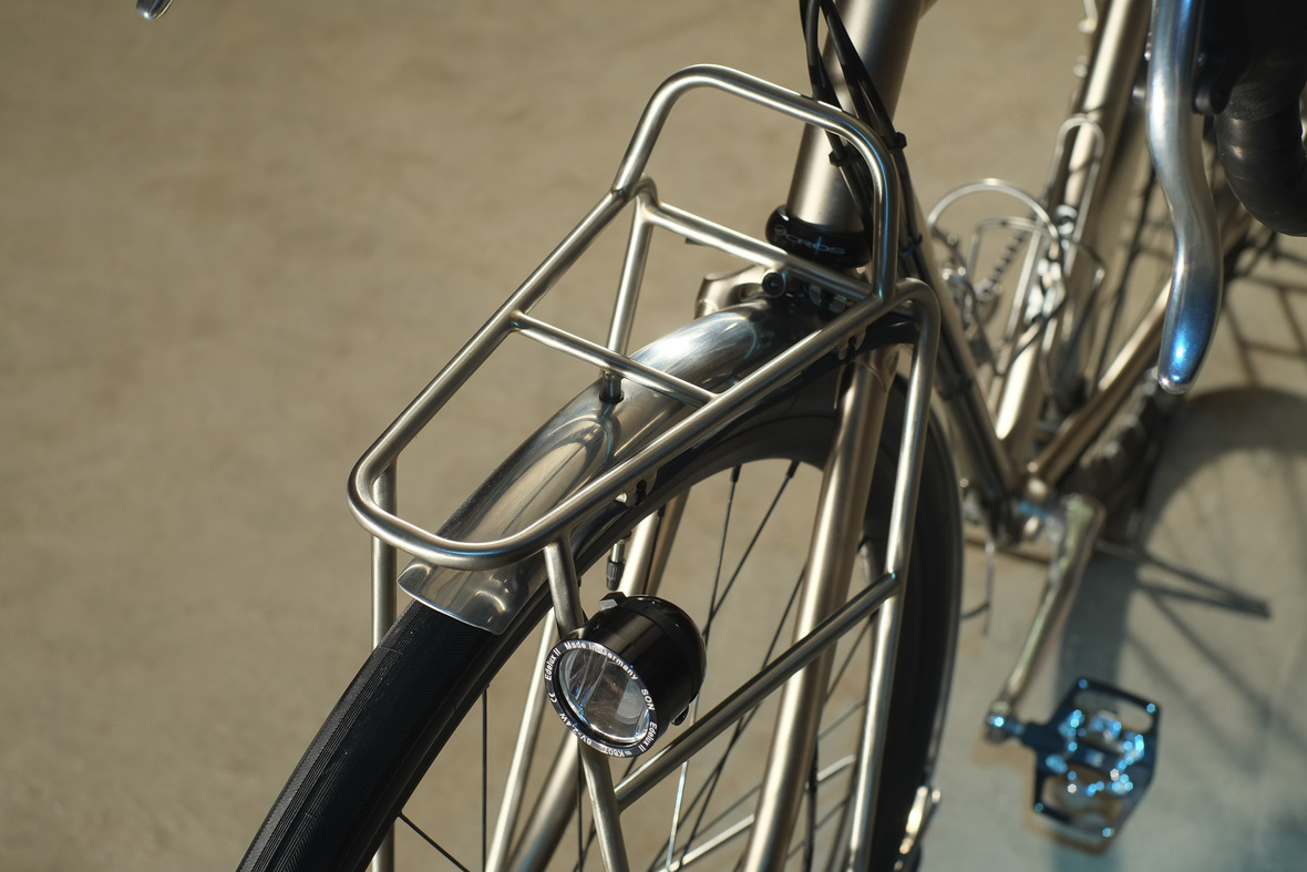 The bike is nickel coated and comes with handmade racks in stainless steel. Custom shifter support for the Rohloff rear hub, custom Fern stainless throughaxle dropouts, Juintech cable operated hydraulic disc brakes, Compass tires, etc, etc,…