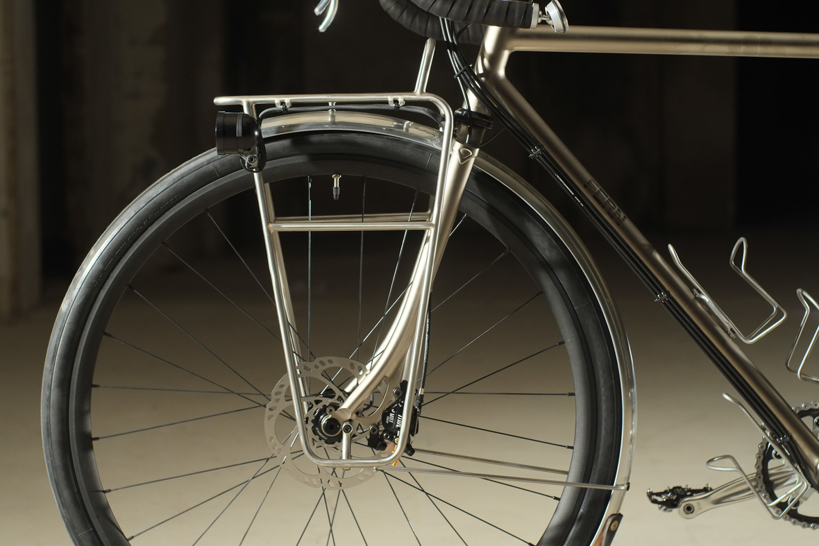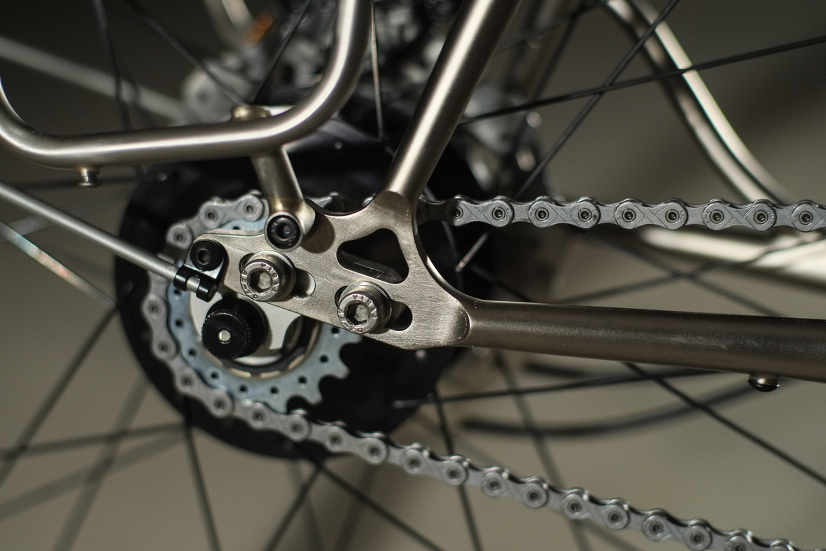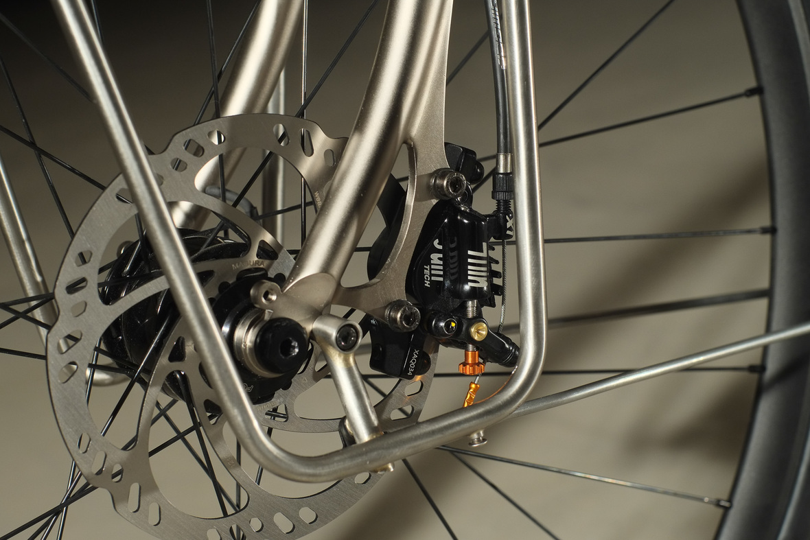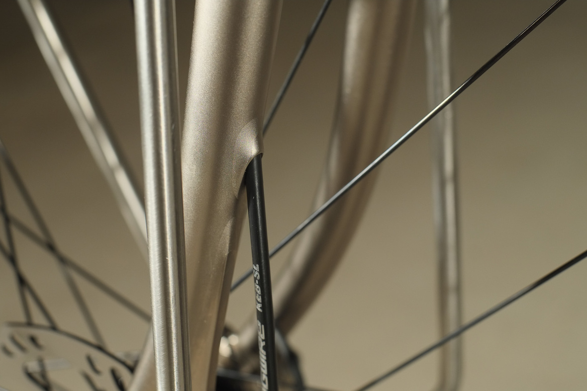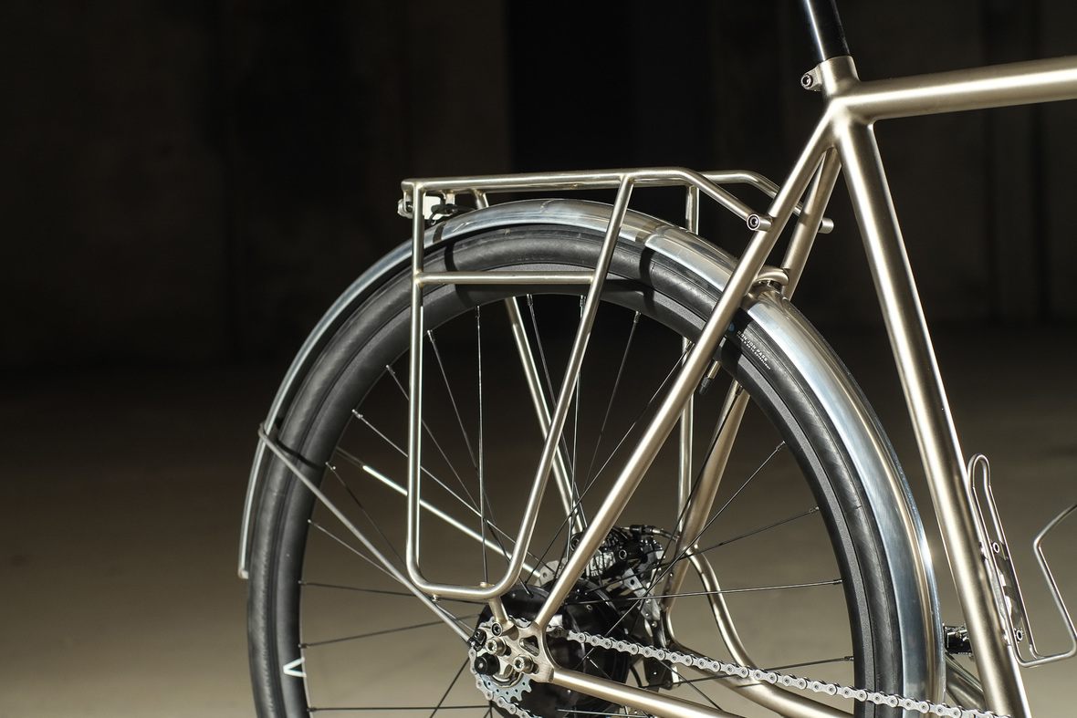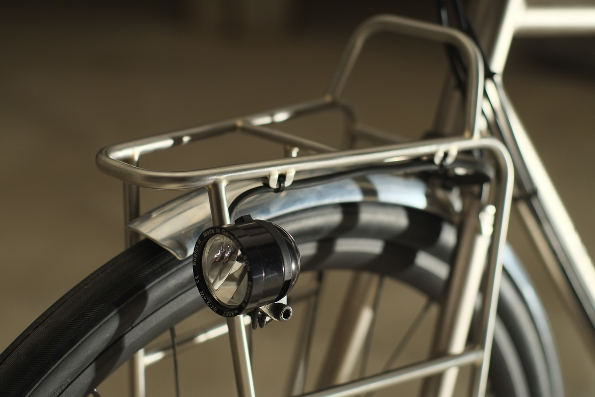 The bike is nickel coated and comes with handmade racks in stainless steel. Custom shifter support for the Rohloff rear hub, custom Fern stainless throughaxle dropouts, Juintech cable operated hydraulic disc brakes, Compass tires, etc, etc,…