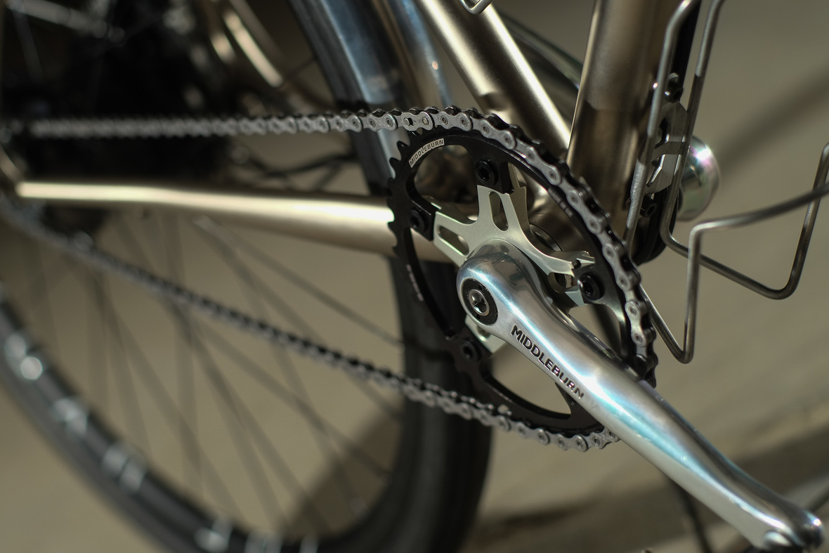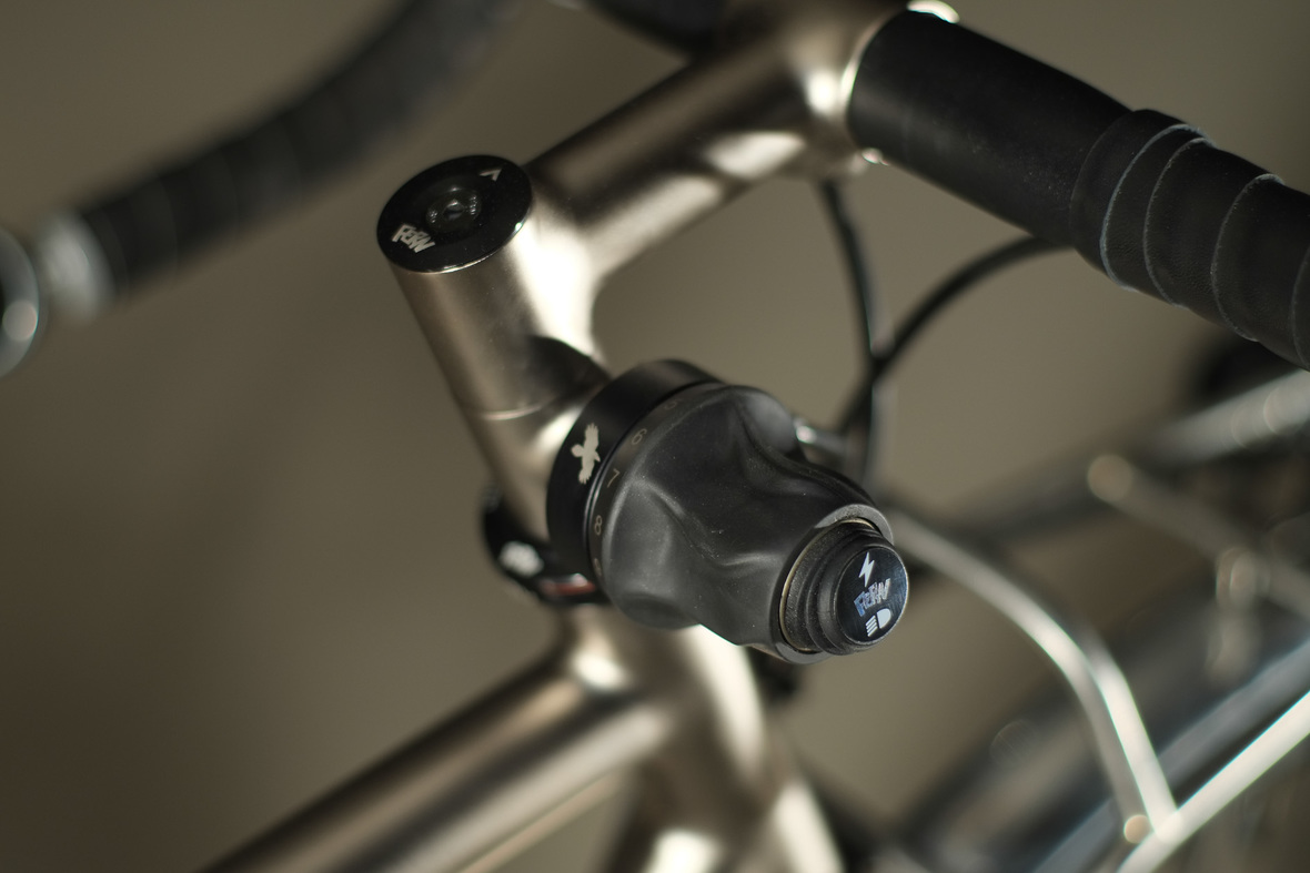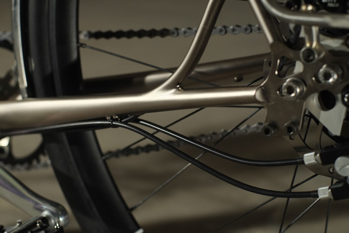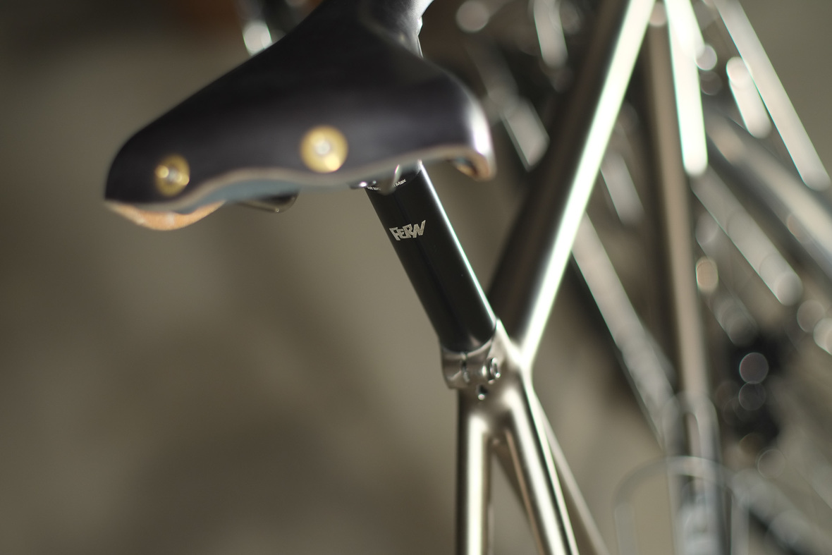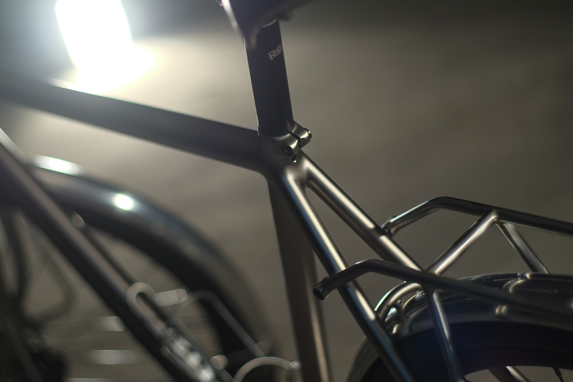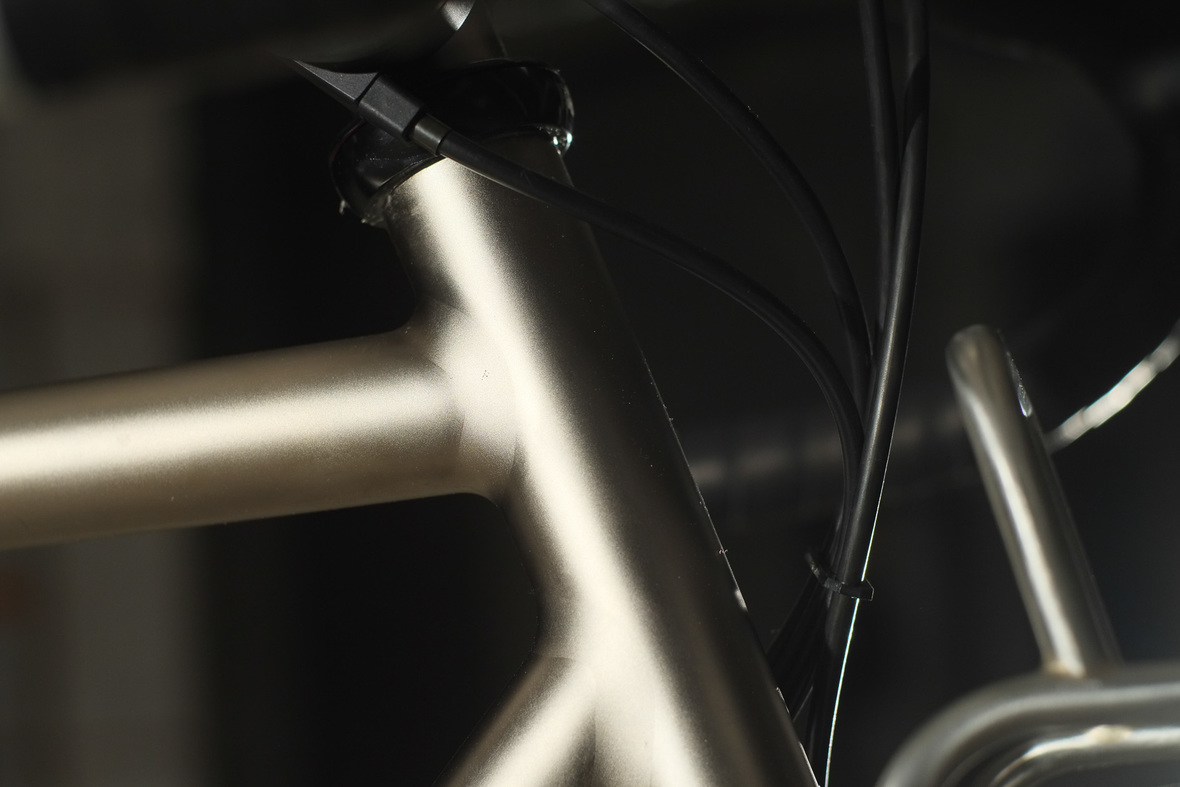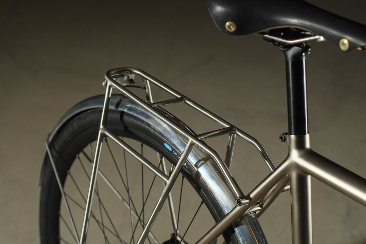The bike is nickel coated and comes with handmade racks in stainless steel. Custom shifter support for the Rohloff rear hub, custom Fern stainless throughaxle dropouts, Juintech cable operated hydraulic disc brakes, Compass tires, etc, etc,…